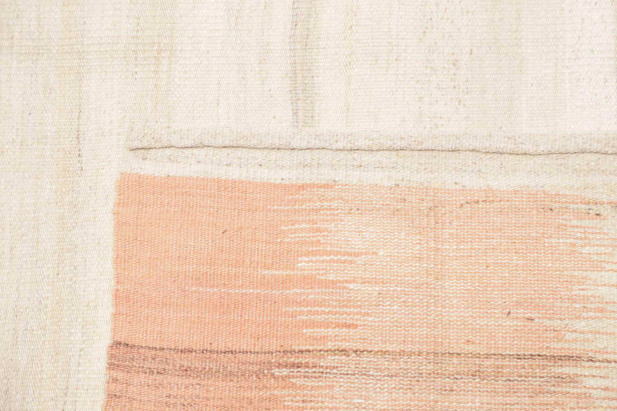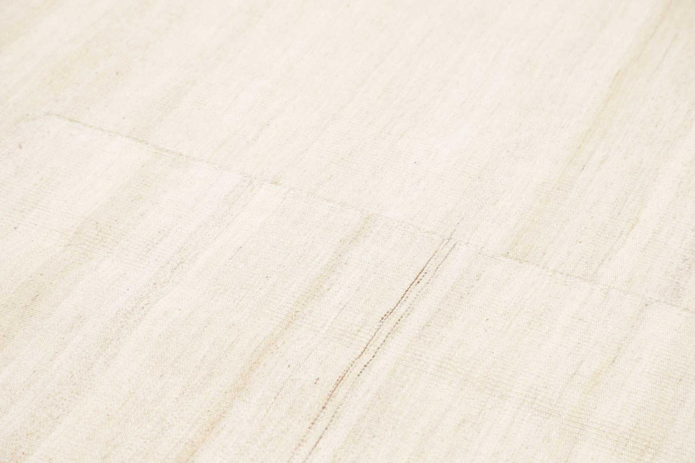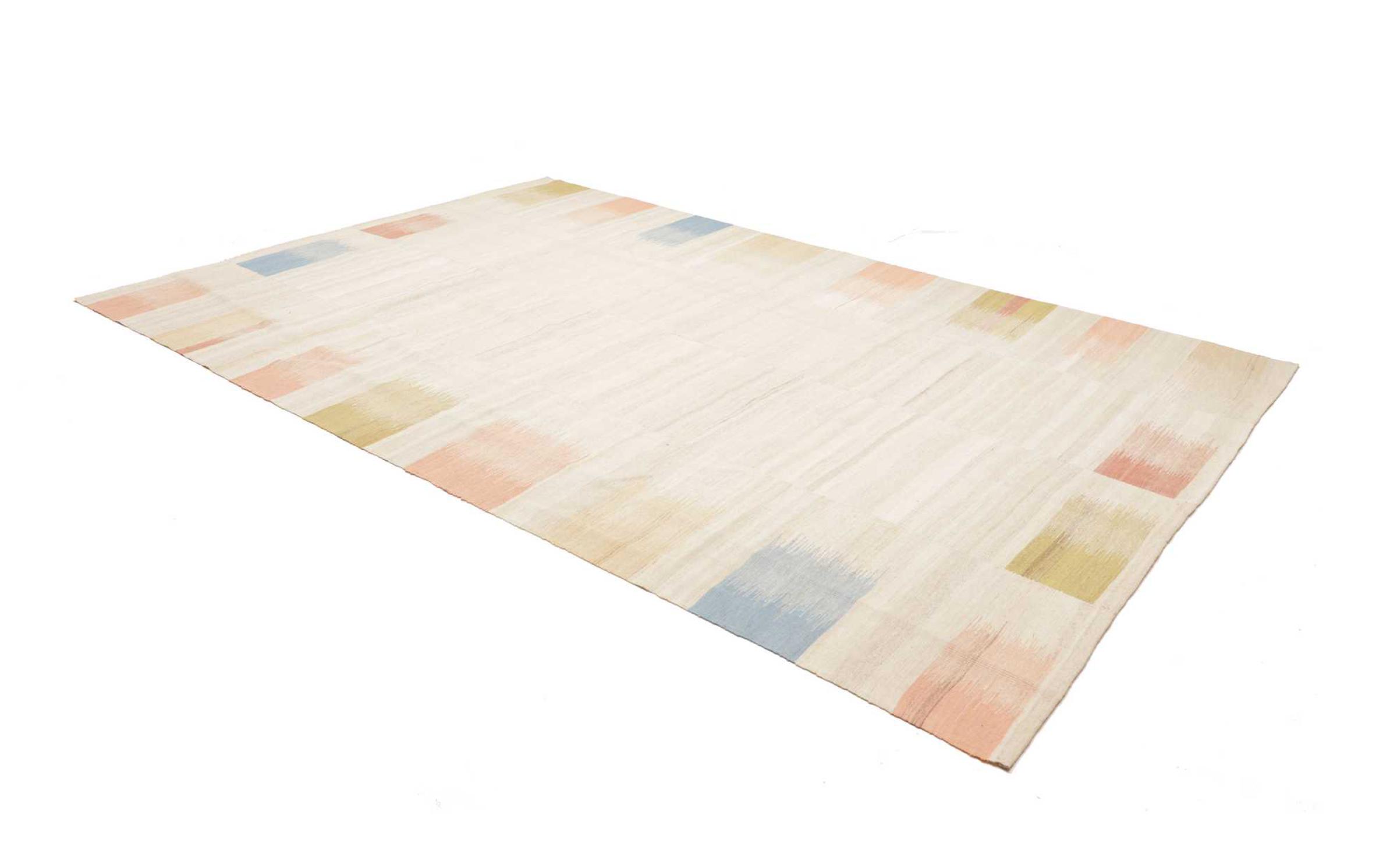 Este tapete foi feito à mão sobre um tear como uma trama plana. Flatweave é o termo utilizado para descrever tapetes que não têm pêlo. Como o nome promete, estes tapetes são tecidos e não atados. Isto resulta num tapete plano com uma superfície estruturada. Os tecidos planos não são tão macios e geralmente mais finos do que os tapetes com nós. Ao mesmo tempo, são muito menos complexos de fabricar e podem normalmente ser dispostos de ambos os lados (frente e verso). Os seus padrões são normalmente geométricos, o que é determinado pelo tecido.