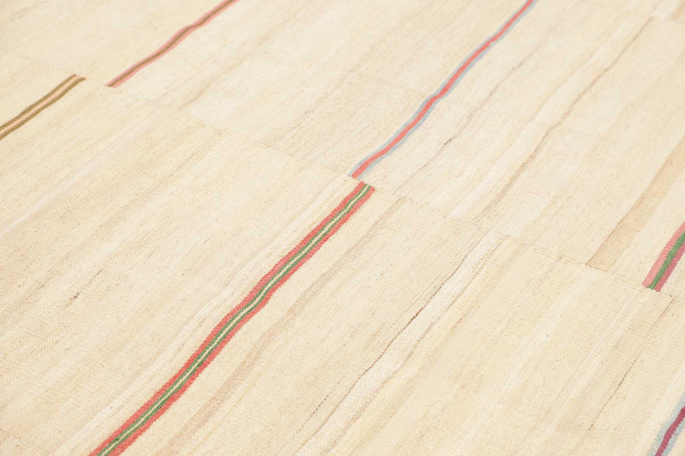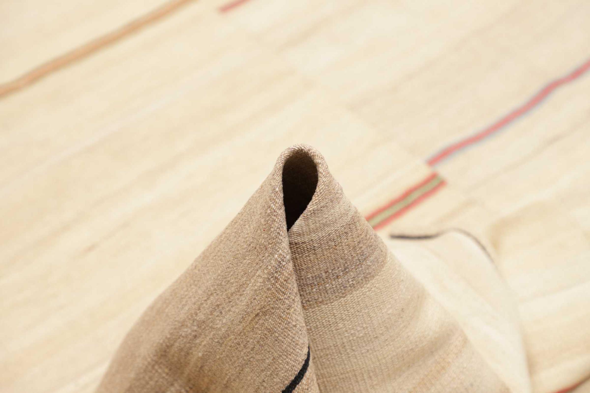 Este tapete foi feito à mão sobre um tear como uma trama plana. Flatweave é o termo utilizado para descrever tapetes que não têm pêlo. Como o nome promete, estes tapetes são tecidos e não atados. Isto resulta num tapete plano com uma superfície estruturada. Os tecidos planos não são tão macios e geralmente mais finos do que os tapetes com nós. Ao mesmo tempo, são muito menos complexos de fabricar e podem normalmente ser dispostos de ambos os lados (frente e verso). Os seus padrões são normalmente geométricos, o que é determinado pelo tecido.