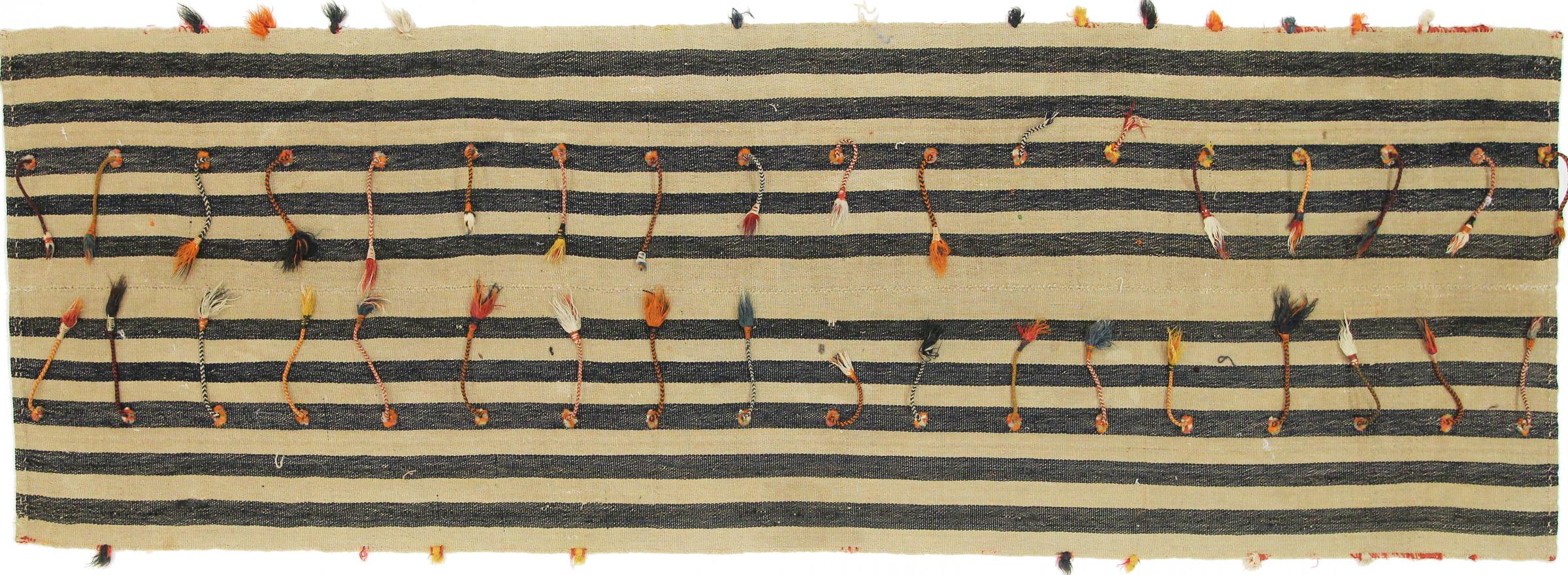 Este tapete foi feito à mão sobre um tear como uma trama plana. Flatweave é o termo utilizado para descrever tapetes que não têm pêlo. Como o nome promete, estes tapetes são tecidos e não atados. Isto resulta num tapete plano com uma superfície estruturada. Os tecidos planos não são tão macios e geralmente mais finos do que os tapetes com nós. Ao mesmo tempo, são muito menos complexos de fabricar e podem normalmente ser dispostos de ambos os lados (frente e verso). Os seus padrões são normalmente geométricos, o que é determinado pelo tecido.