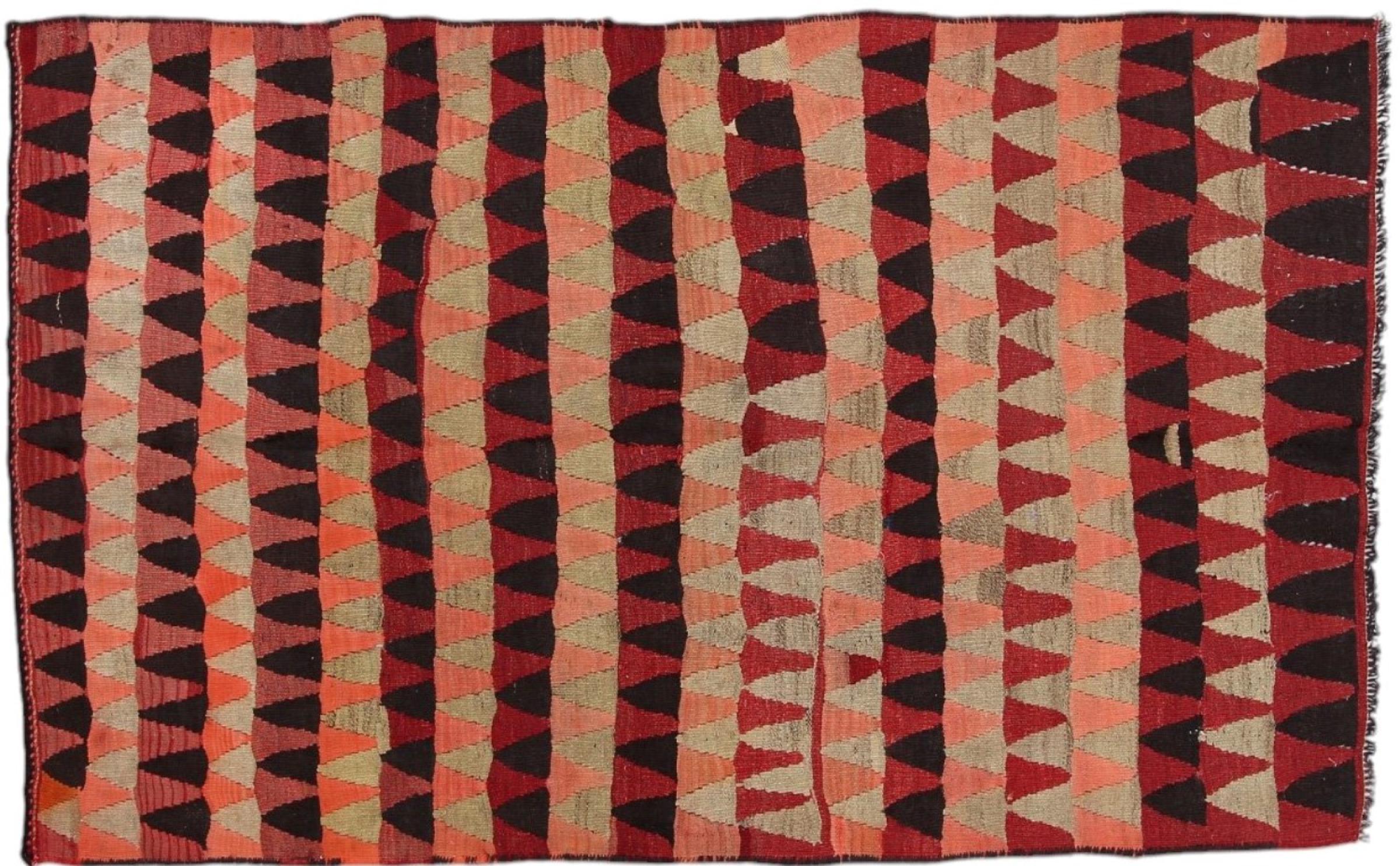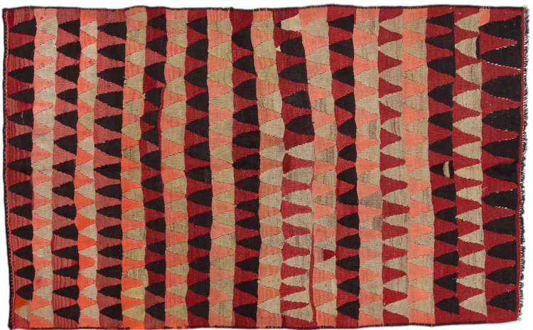 Este tapete foi feito à mão sobre um tear como uma trama plana. Flatweave é o termo utilizado para descrever tapetes que não têm pêlo. Como o nome promete, estes tapetes são tecidos e não atados. Isto resulta num tapete plano com uma superfície estruturada. Os tecidos planos não são tão macios e geralmente mais finos do que os tapetes com nós. Ao mesmo tempo, são muito menos complexos de fabricar e podem normalmente ser dispostos de ambos os lados (frente e verso). Os seus padrões são normalmente geométricos, o que é determinado pelo tecido.