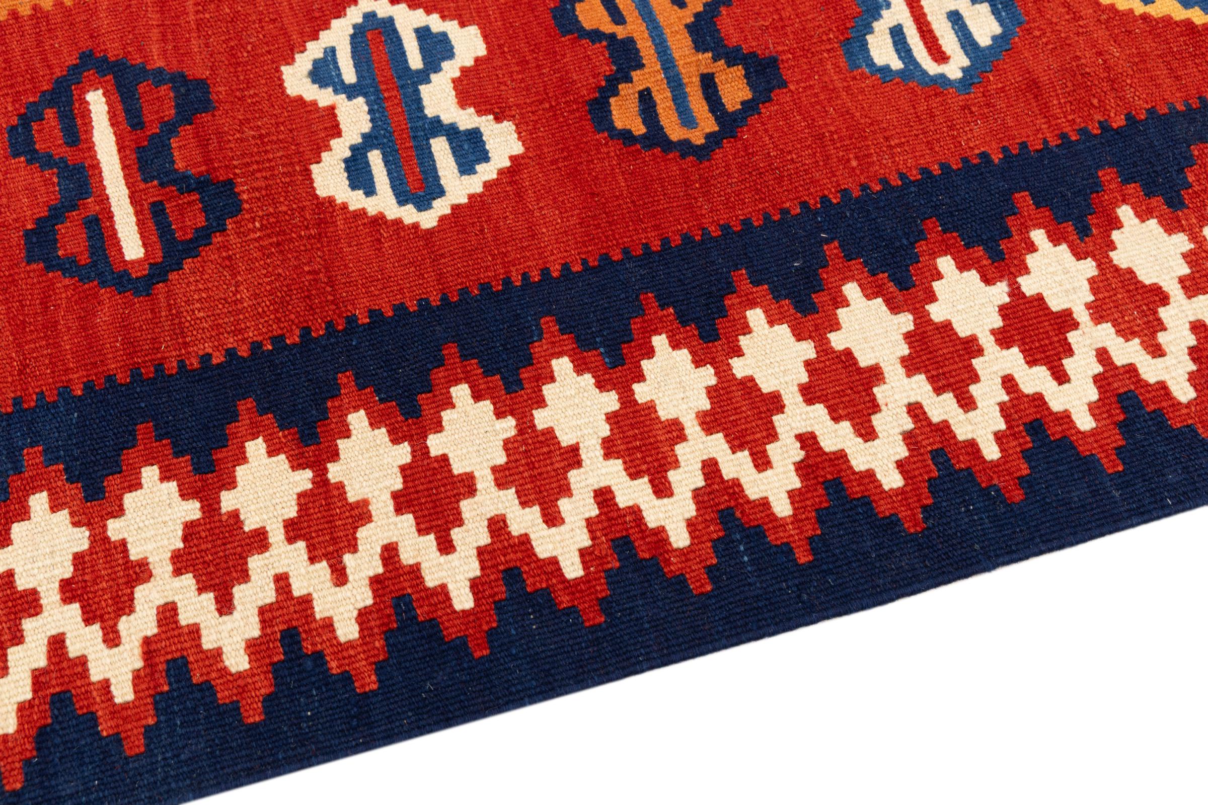 Este kilim fars tecido à mão combina padrões e ornamentos persas com a tradição de tramas planas. Uma grande e moderna combinação dos conceitos mais populares do Oriente. Isso cria um tapete com uma ampla gama de usos. Seja como colcha ou tapete na frente do sofá - um kilim Fars torna isso possível e agora pode ser encontrado nas revistas de design de interiores mais conhecidas. Os tapetes Kilim Fars são tecidos à mão no Irã e, portanto, estão entre os kilims da mais alta qualidade.