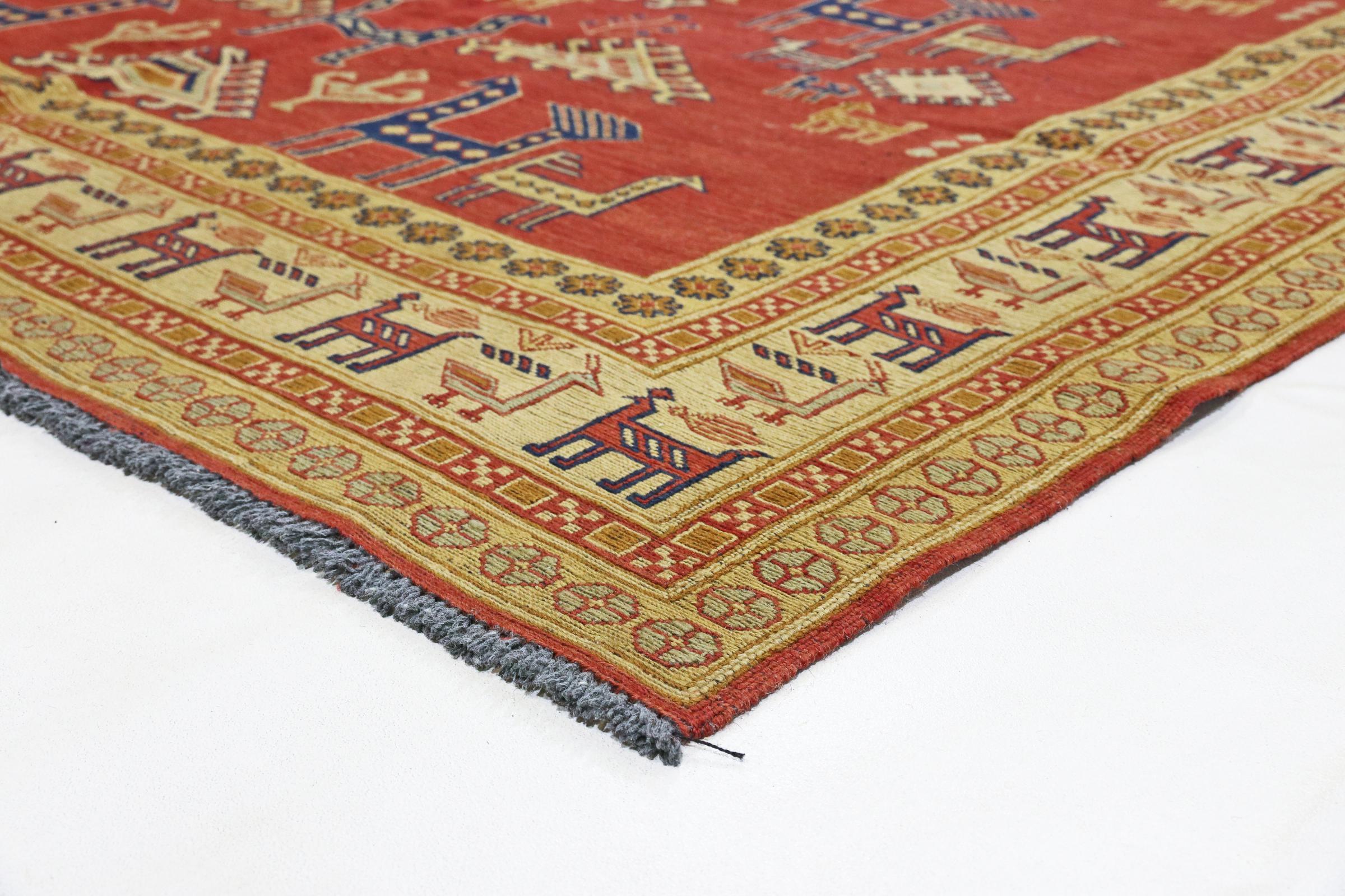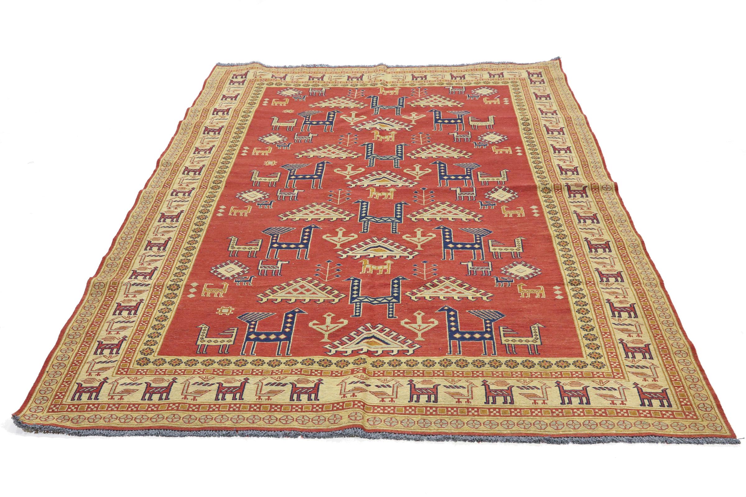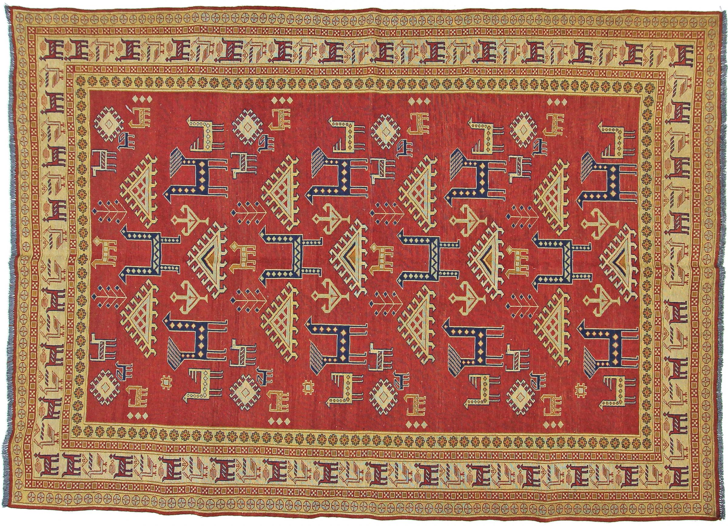 Este soumakh tecido à mão foi feito com uma técnica de enrolamento. Este é muito claro a partir de suas costas e da trama termina que pendurar para fora. Um belo tapete oriental de tecido plano.