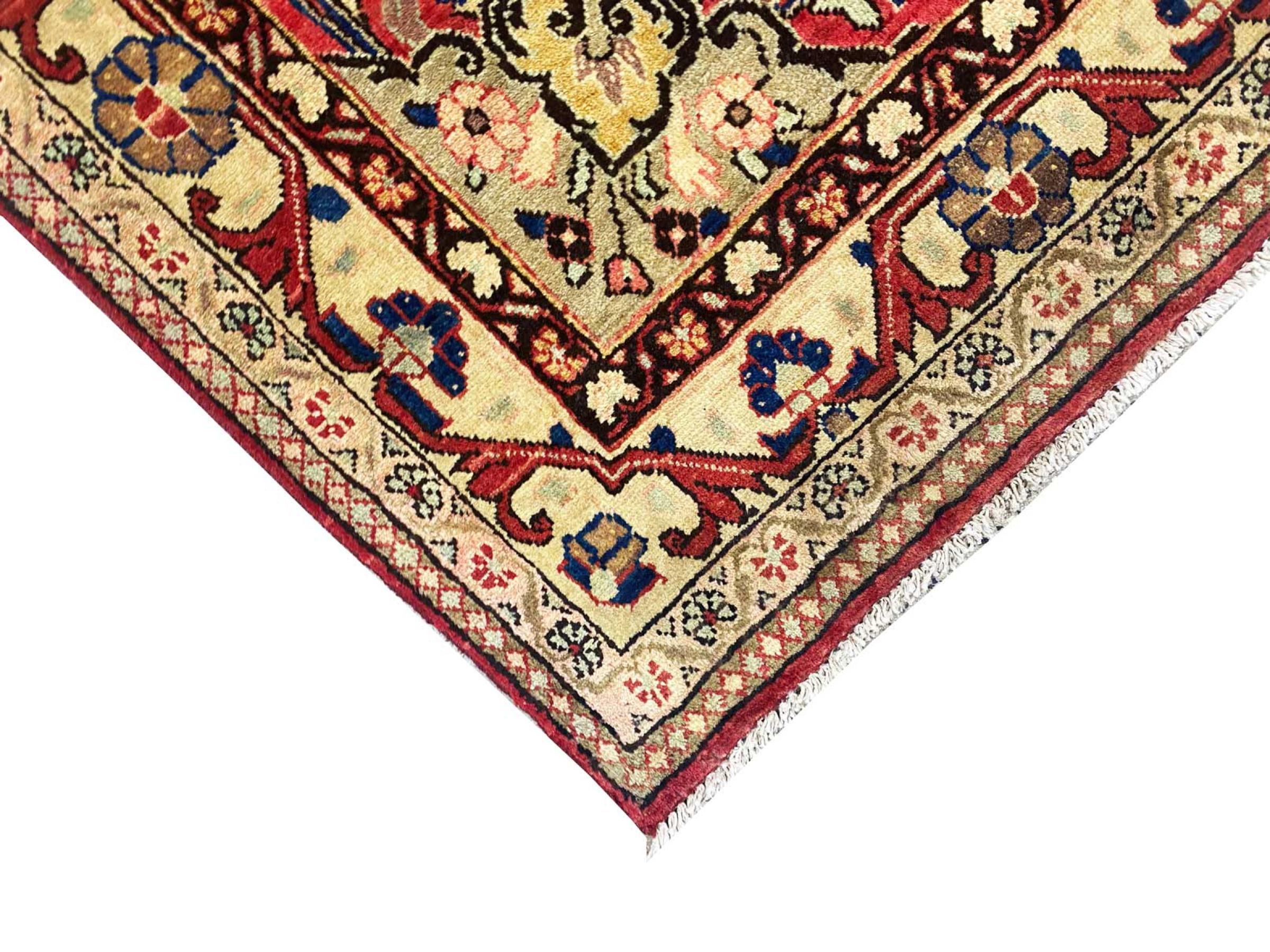 Este tapete oriental vem da proveniência de Mahal, localizada no centro-oeste do Irã. O design brilha em um esquema de cores amigável com cores harmoniosamente coordenadas. A moldura detalhada encena elegantemente os motivos finamente trabalhados no campo interno. Como um genuíno tapete persa feito à mão de qualidade robusta, o modelo é estético e durável ao mesmo tempo - ideal para o seu corredor ou sala de estar.