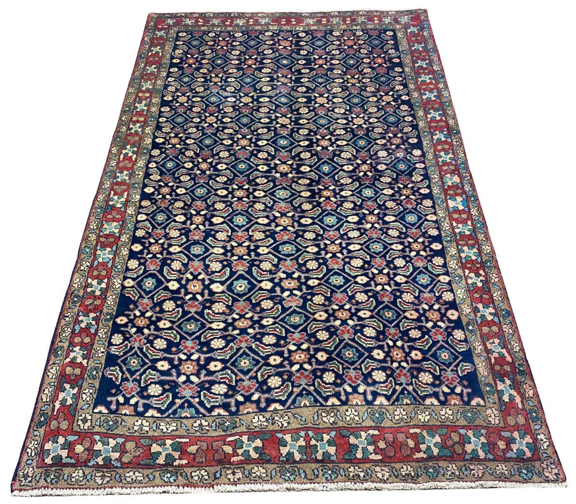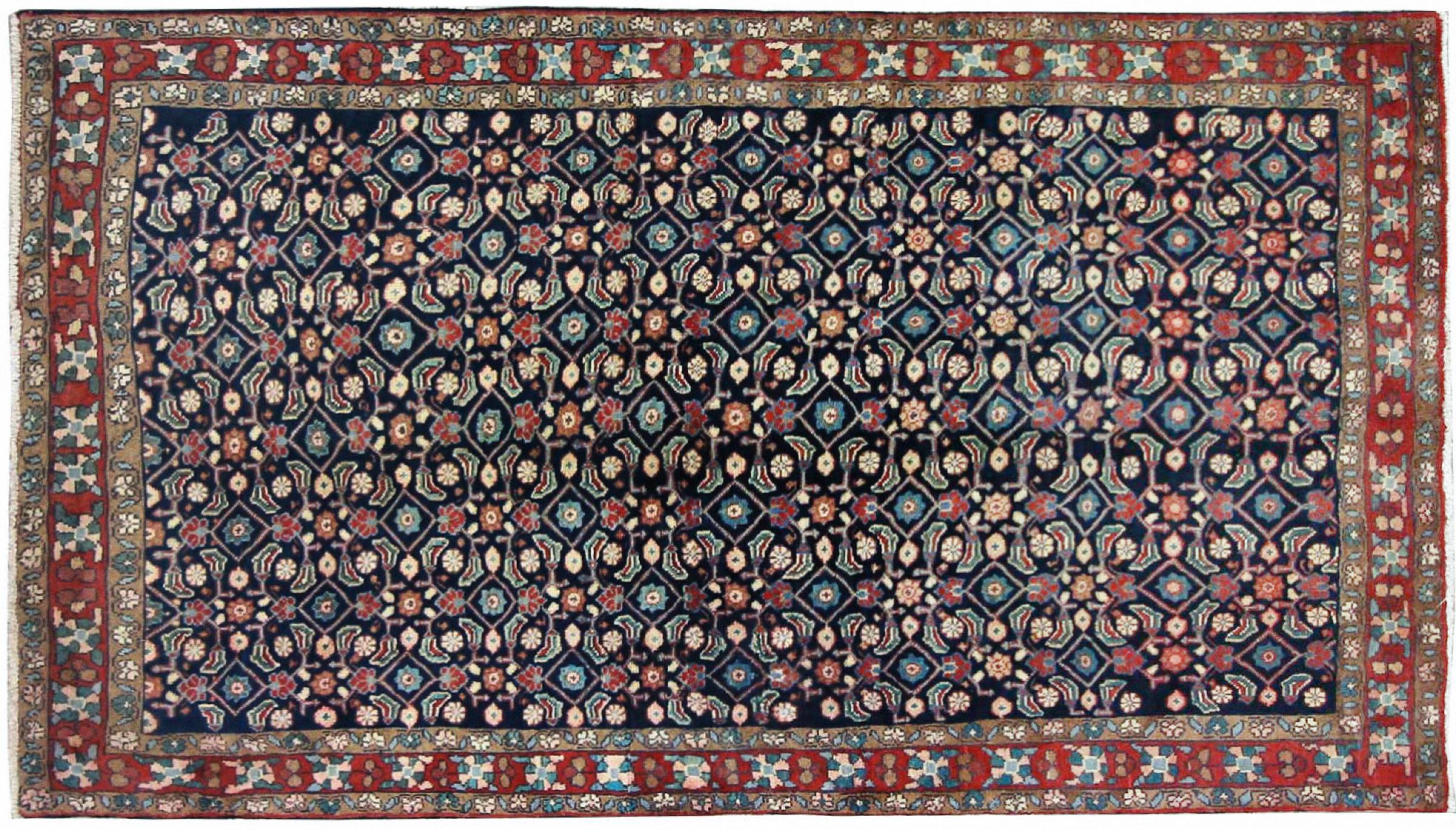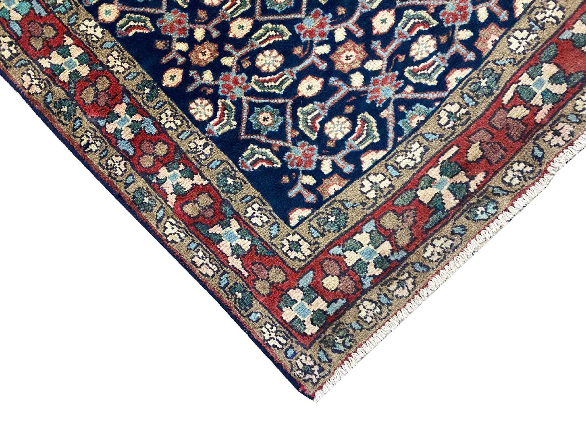 Nº do Tapete: 303251006056120 Tamanho: 231x123 cm Espessura: aproximadamente 12 mm Nós: 128 000 - 160 000 / m² Processamento: Atado à mão Veludo: Lã tecida à mão Urdidura: Algodão Origem: Pérsia / Iran Idade: Novo Peso: aproximadamente 10 kg Também conhecido como Mahalat Em armazém: Único - Apenas 1 em stock
