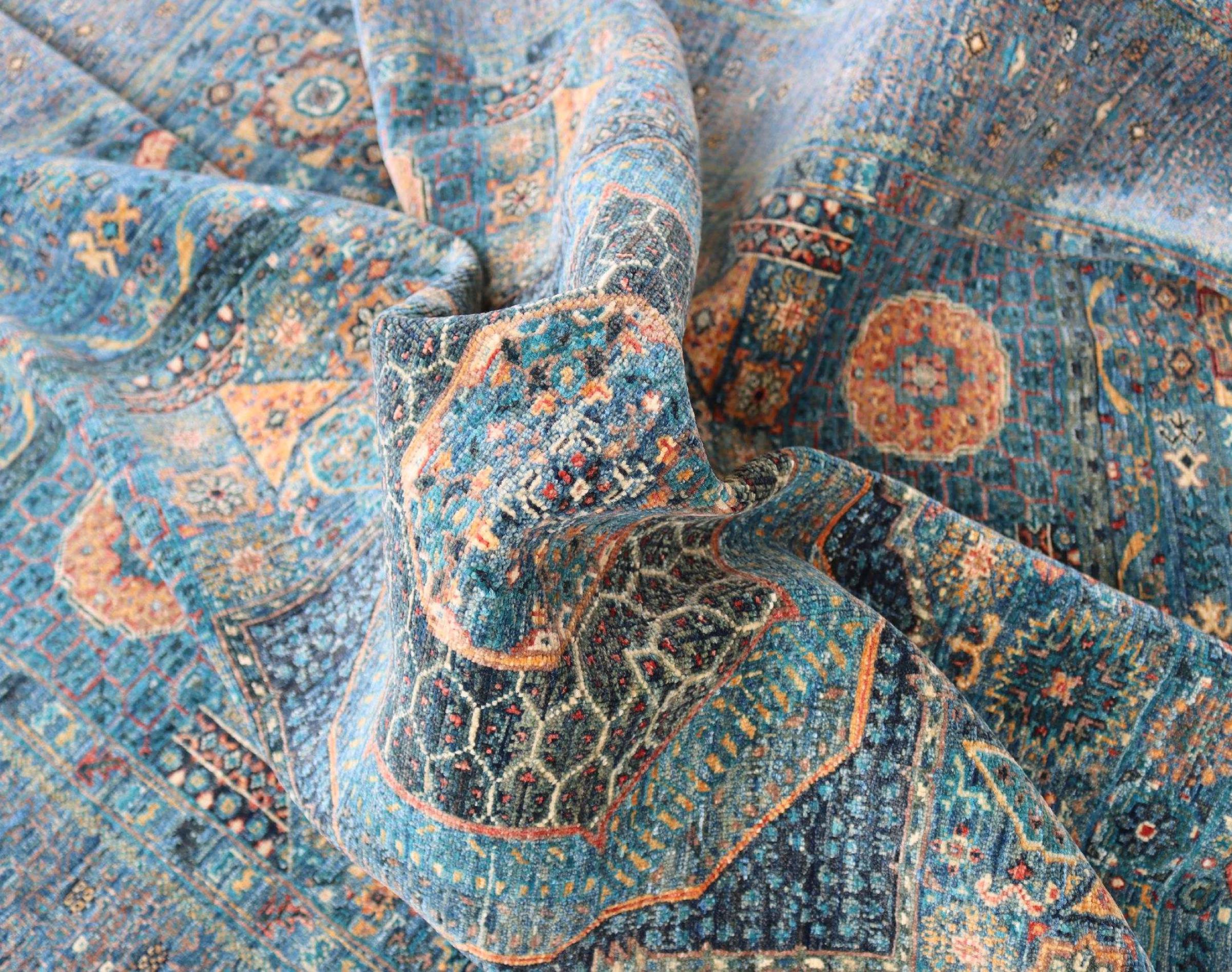 Este tapete é feito de lã de ovelha fiada à mão, da mais alta qualidade. Especialmente no Irão (antiga Pérsia), Afeganistão e Paquistão, a lã ainda é fiada à mão antes do início do nó do tapete. A lã tem provado ser um material natural e extremamente resistente ao longo dos séculos. Entre outras coisas, tem propriedades repelentes de impurezas e isolantes térmicos. Ao mesmo tempo, a lã é incomparavelmente macia e tem um brilho natural.