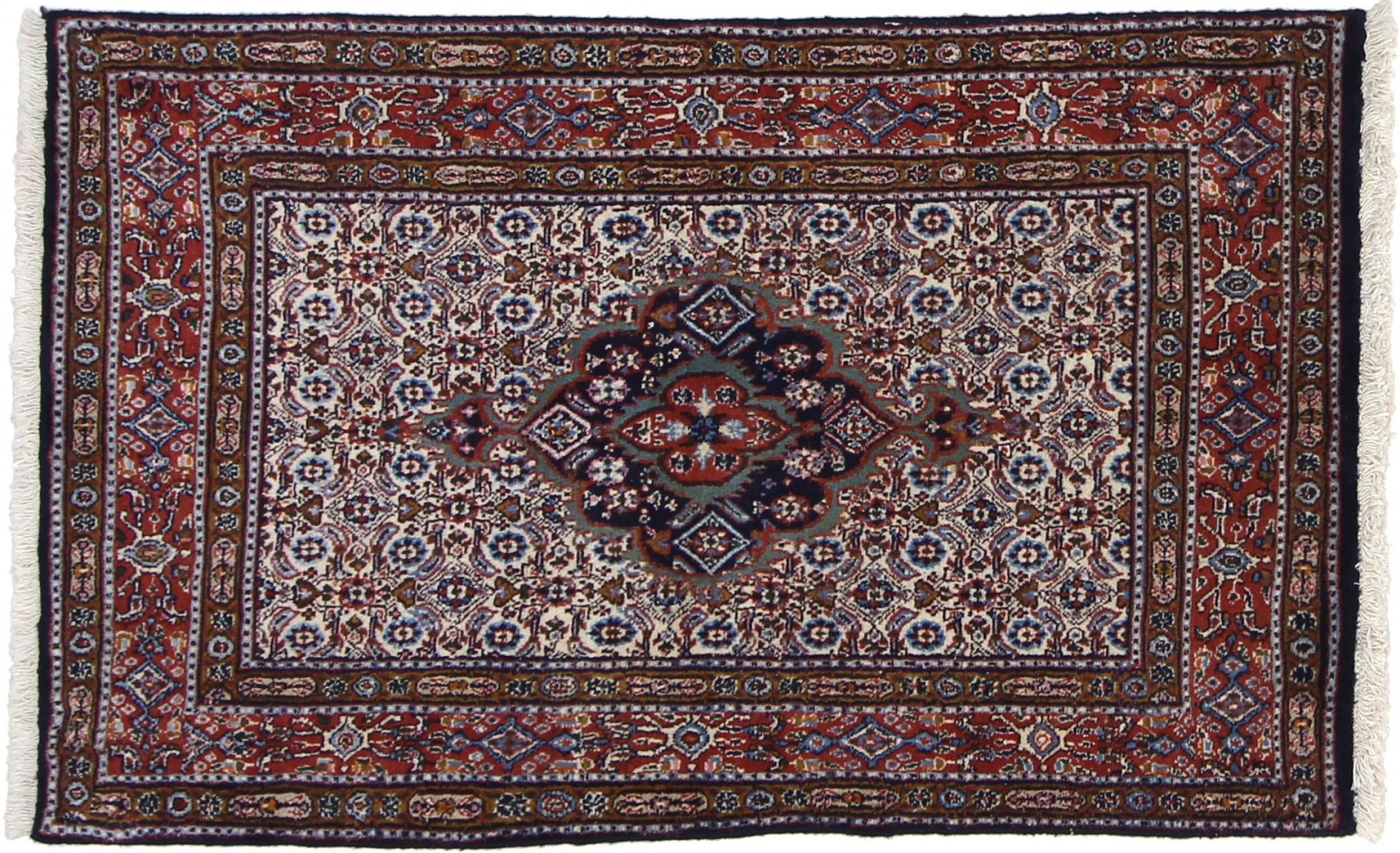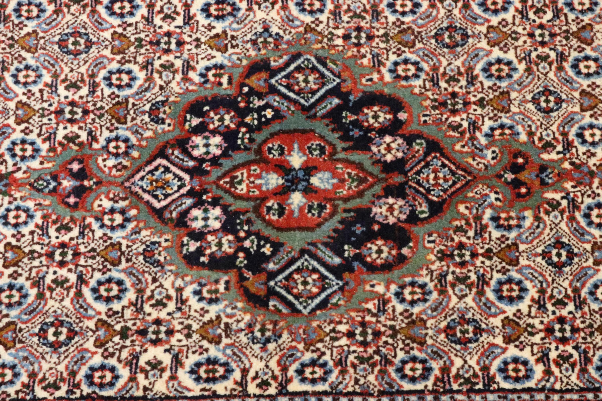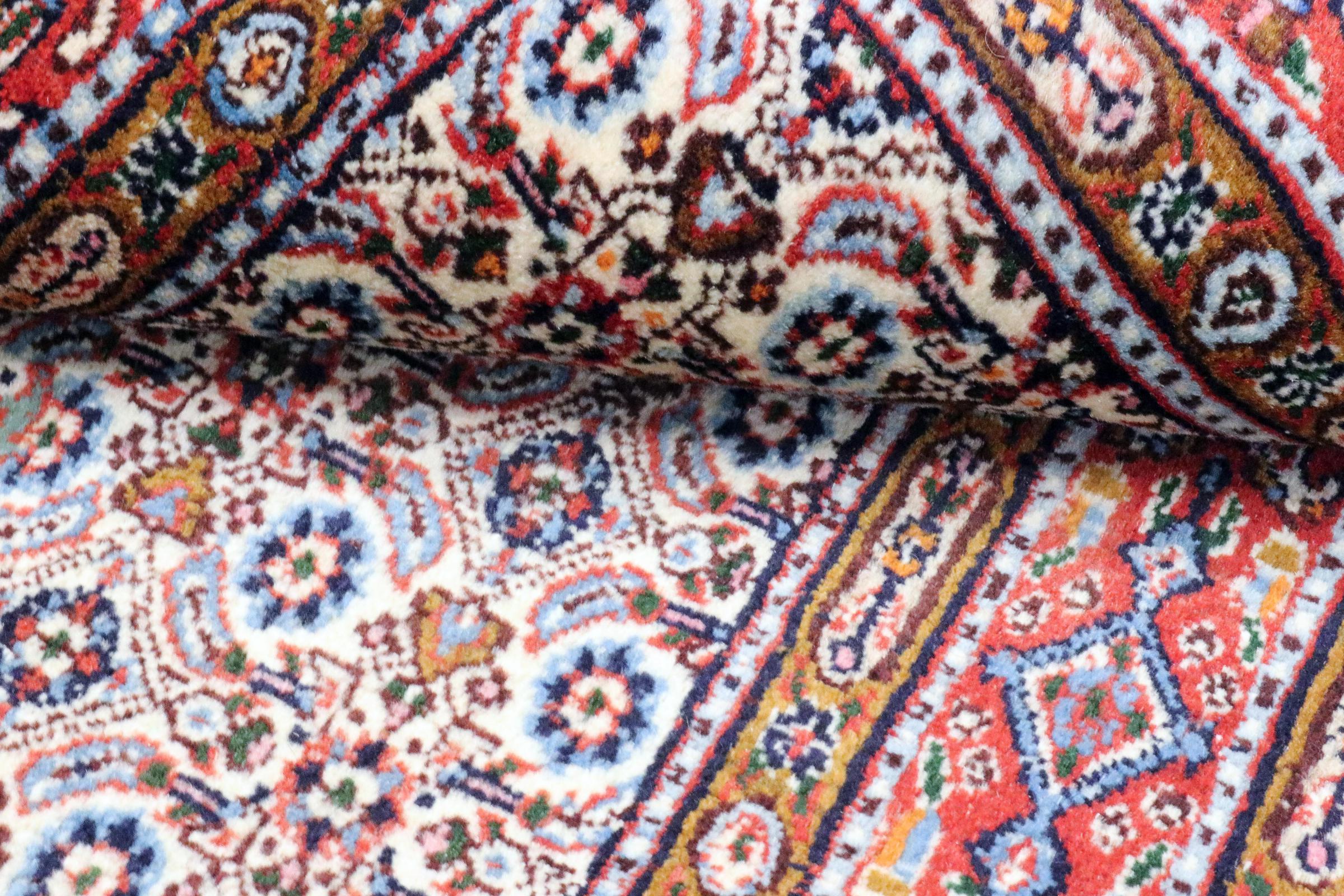 Este tapete de Moud, uma cidade situada 300 km a sul de Mashhad, impressiona à primeira vista. O padrão típico Herati ou desenho de jardim é apreciado por conhecedores e amantes de tapetes persas genuínos. Se procura um tapete feito à mão de excelente qualidade com um design muito distinto e caraterístico, está absolutamente certo com este tipo de tapete.