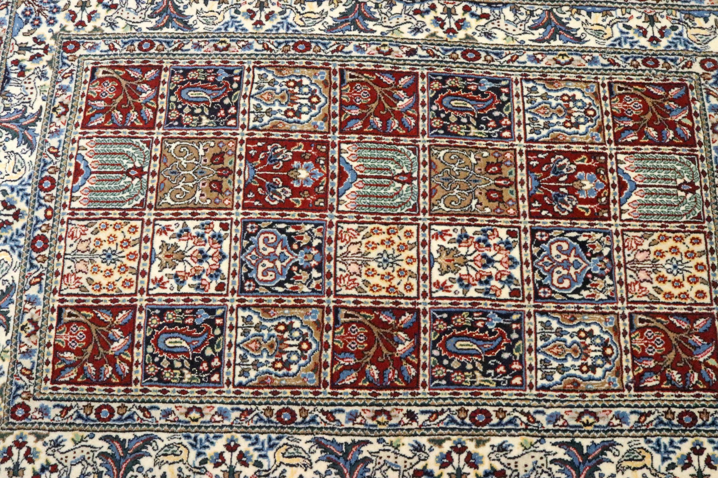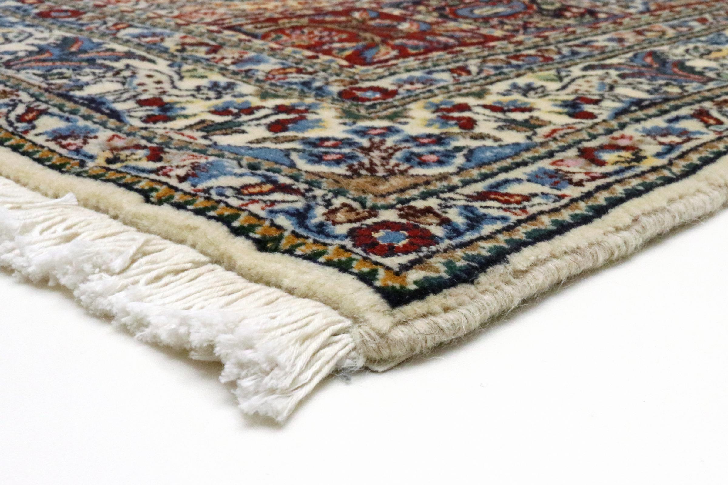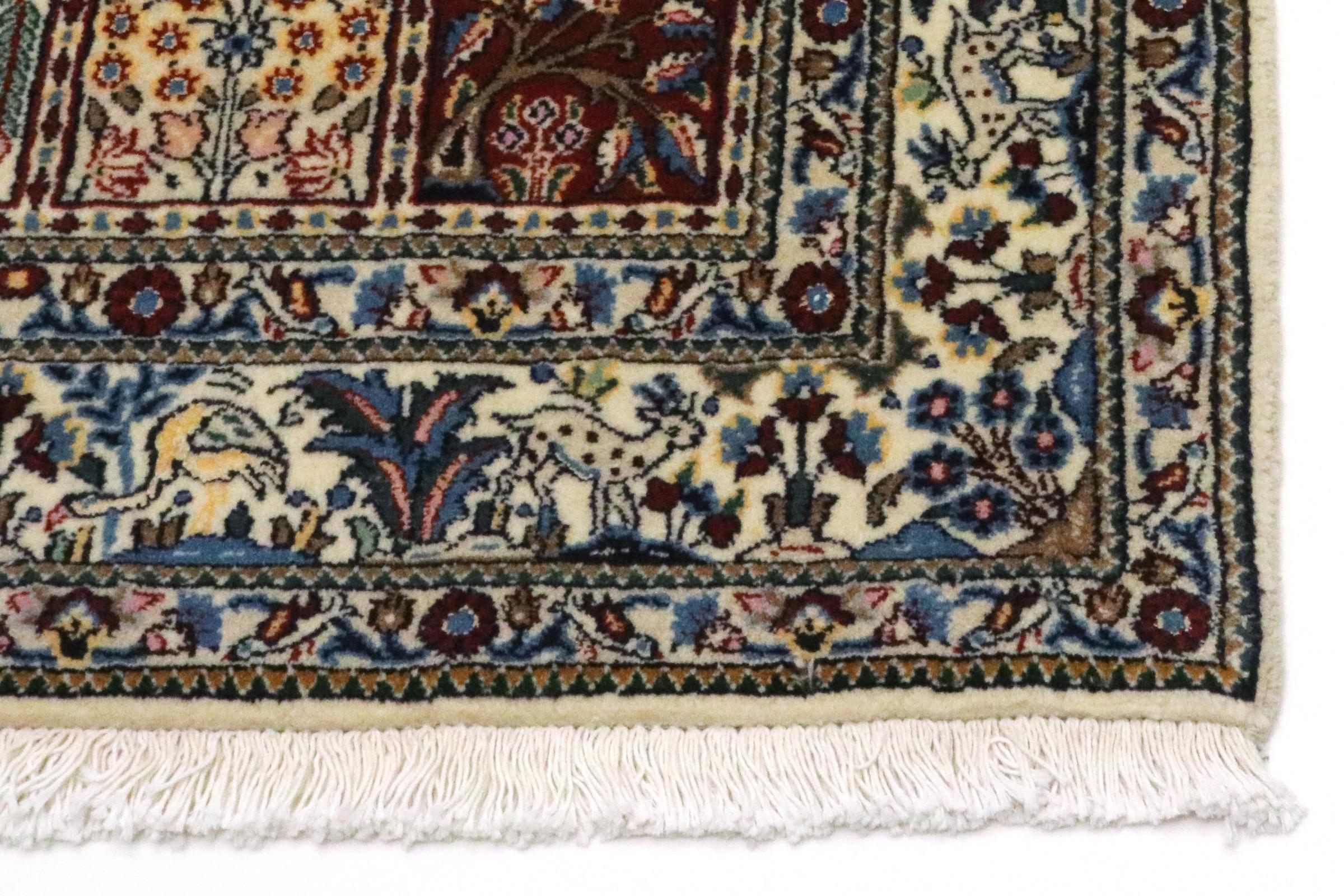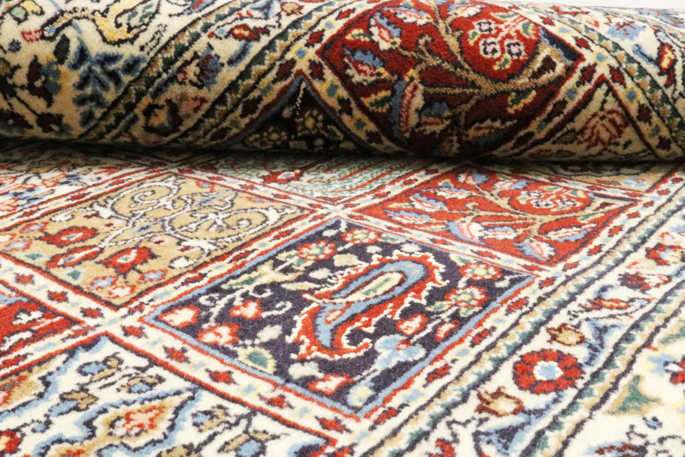 Este tapete de Moud, uma cidade situada 300 km a sul de Mashhad, impressiona à primeira vista. O padrão típico Herati ou desenho de jardim é apreciado por conhecedores e amantes de tapetes persas genuínos. Se procura um tapete feito à mão de excelente qualidade com um design muito distinto e caraterístico, está absolutamente certo com este tipo de tapete.