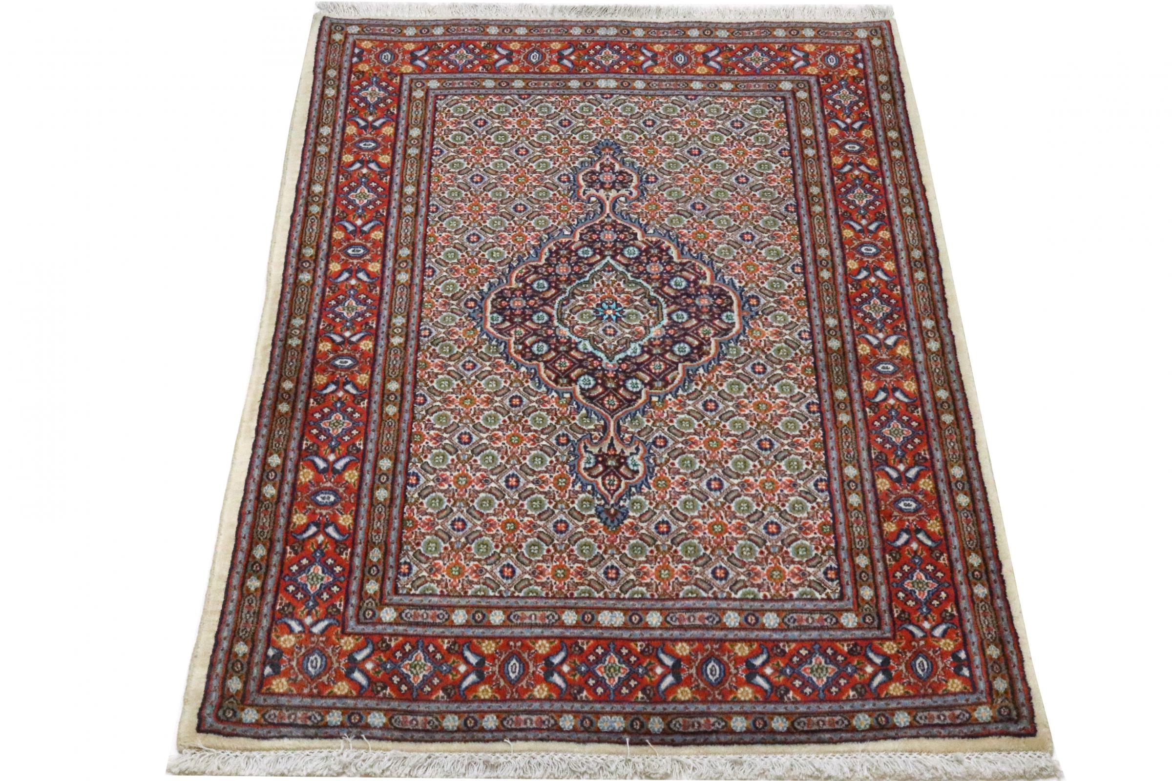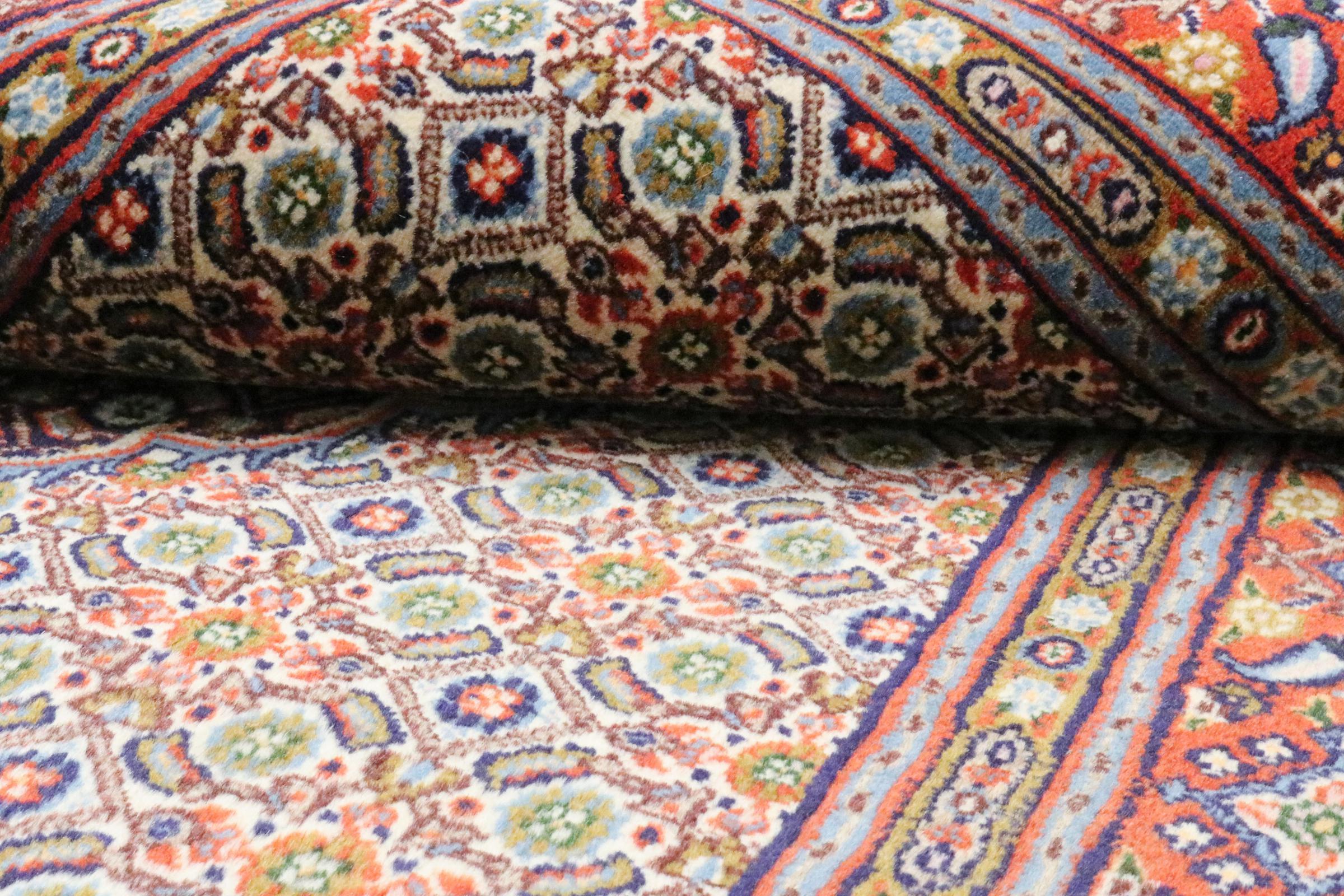 Este tapete de Moud, uma cidade situada 300 km a sul de Mashhad, impressiona à primeira vista. O padrão típico Herati ou desenho de jardim é apreciado por conhecedores e amantes de tapetes persas genuínos. Se procura um tapete feito à mão de excelente qualidade com um design muito distinto e caraterístico, está absolutamente certo com este tipo de tapete.