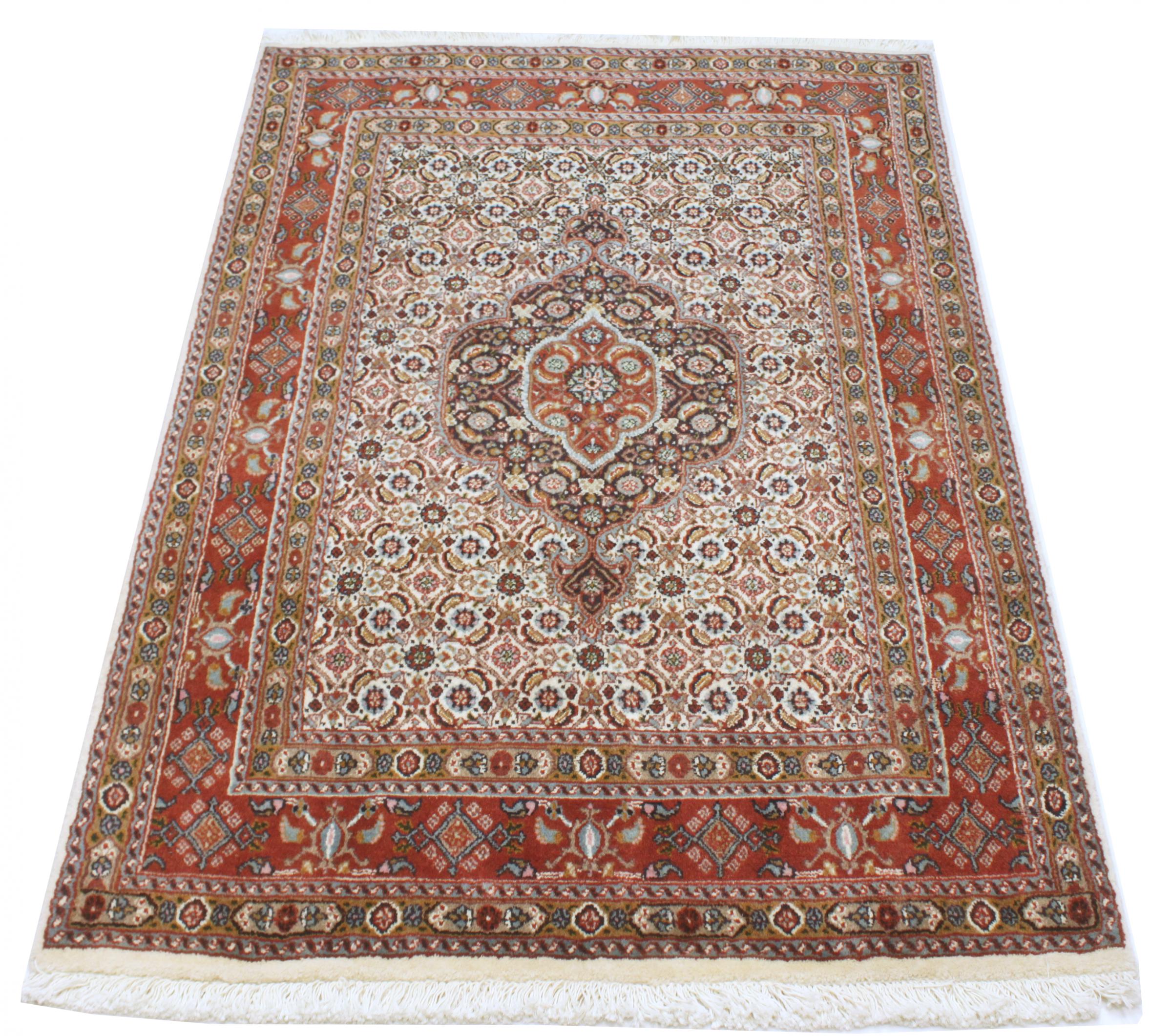 Este tapete de Moud, uma cidade situada 300 km a sul de Mashhad, impressiona à primeira vista. O padrão típico Herati ou desenho de jardim é apreciado por conhecedores e amantes de tapetes persas genuínos. Se procura um tapete feito à mão de excelente qualidade com um design muito distinto e caraterístico, está absolutamente certo com este tipo de tapete.