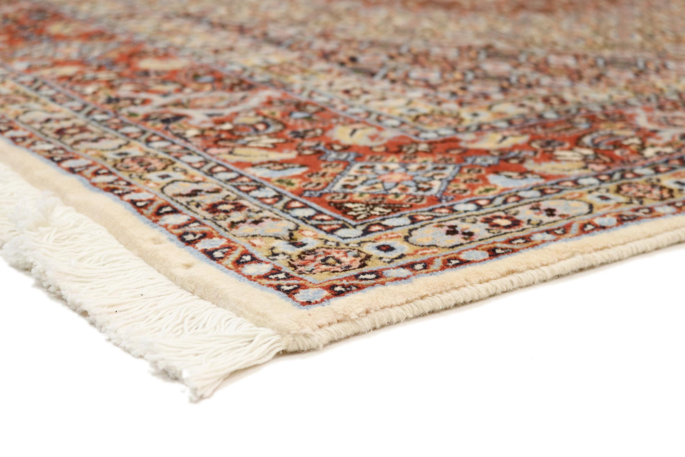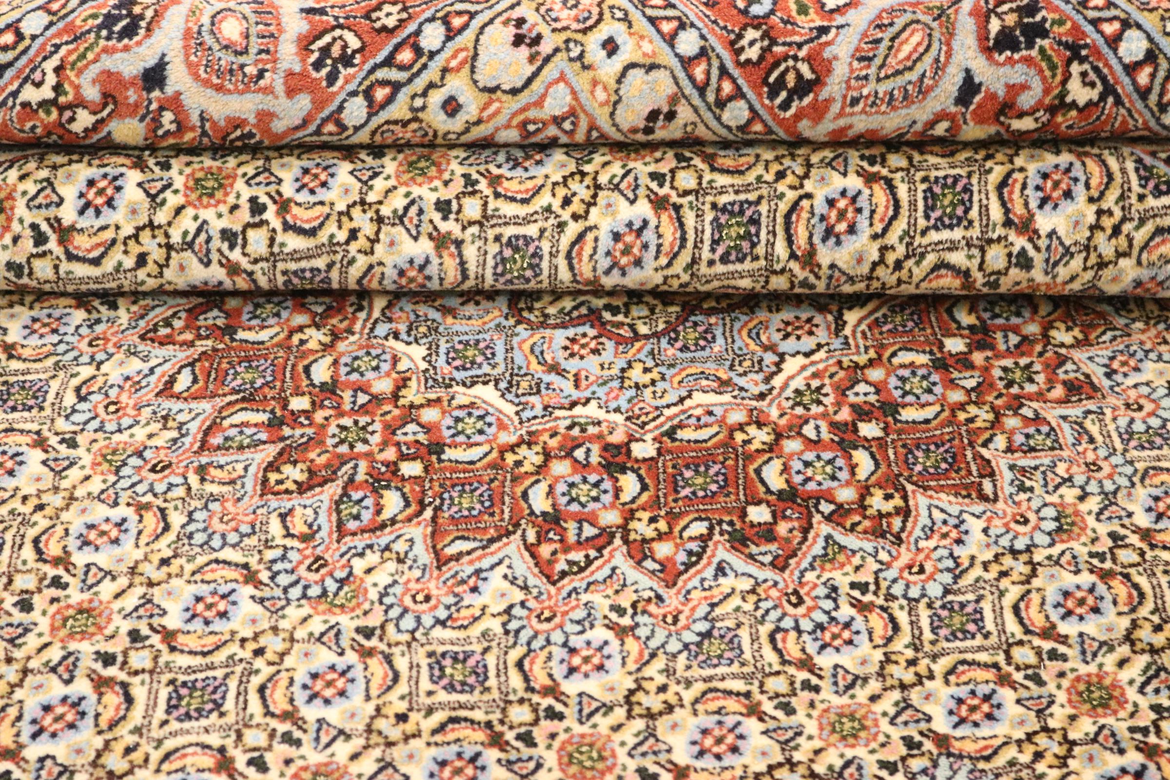 Este tapete de Moud, uma cidade situada 300 km a sul de Mashhad, impressiona à primeira vista. O padrão típico Herati ou desenho de jardim é apreciado por conhecedores e amantes de tapetes persas genuínos. Se procura um tapete feito à mão de excelente qualidade com um design muito distinto e caraterístico, está absolutamente certo com este tipo de tapete.