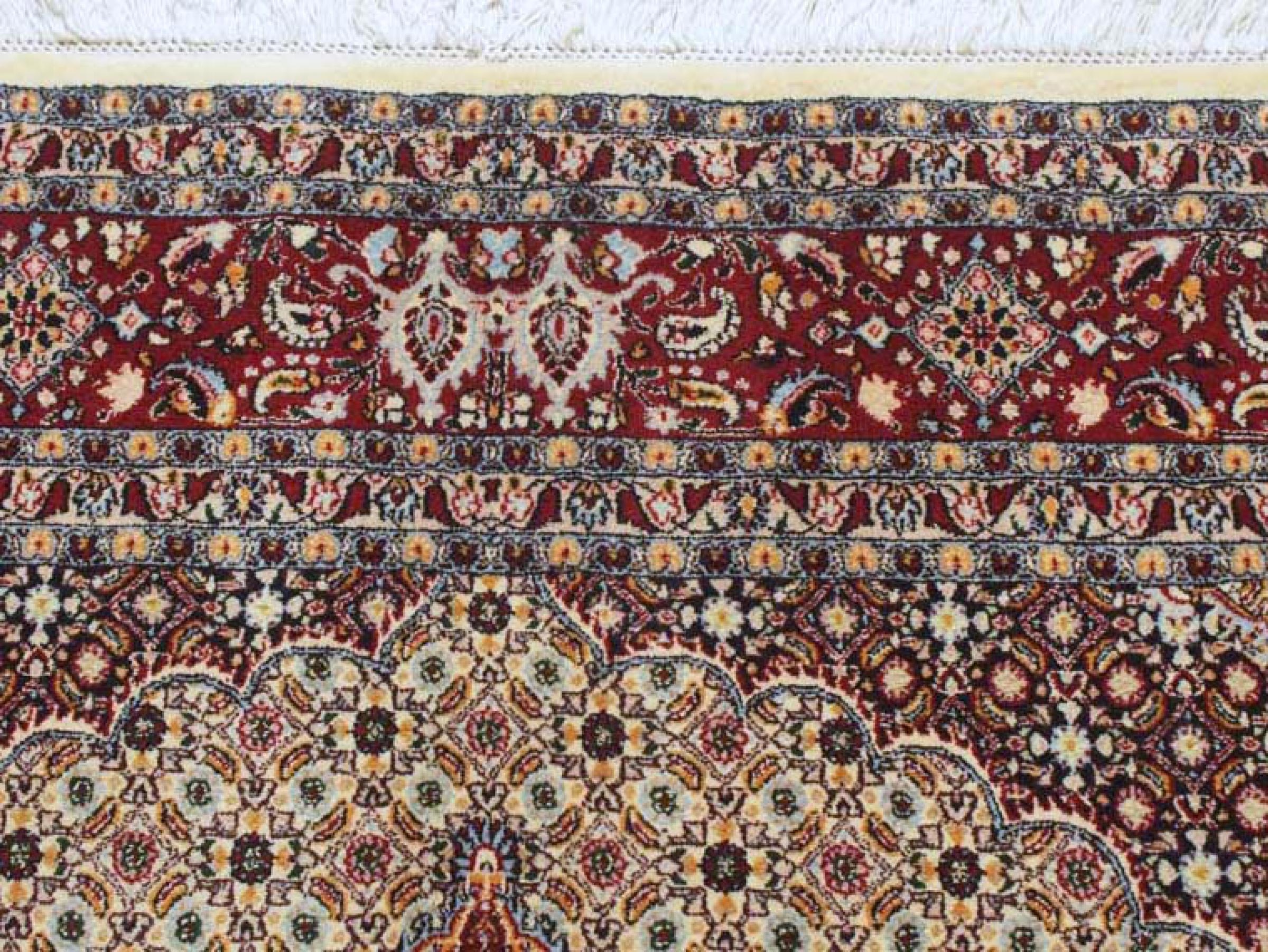 Este tapete de Moud, uma cidade situada 300 km a sul de Mashhad, impressiona à primeira vista. O padrão típico Herati ou desenho de jardim é apreciado por conhecedores e amantes de tapetes persas genuínos. Se procura um tapete feito à mão de excelente qualidade com um design muito distinto e caraterístico, está absolutamente certo com este tipo de tapete.