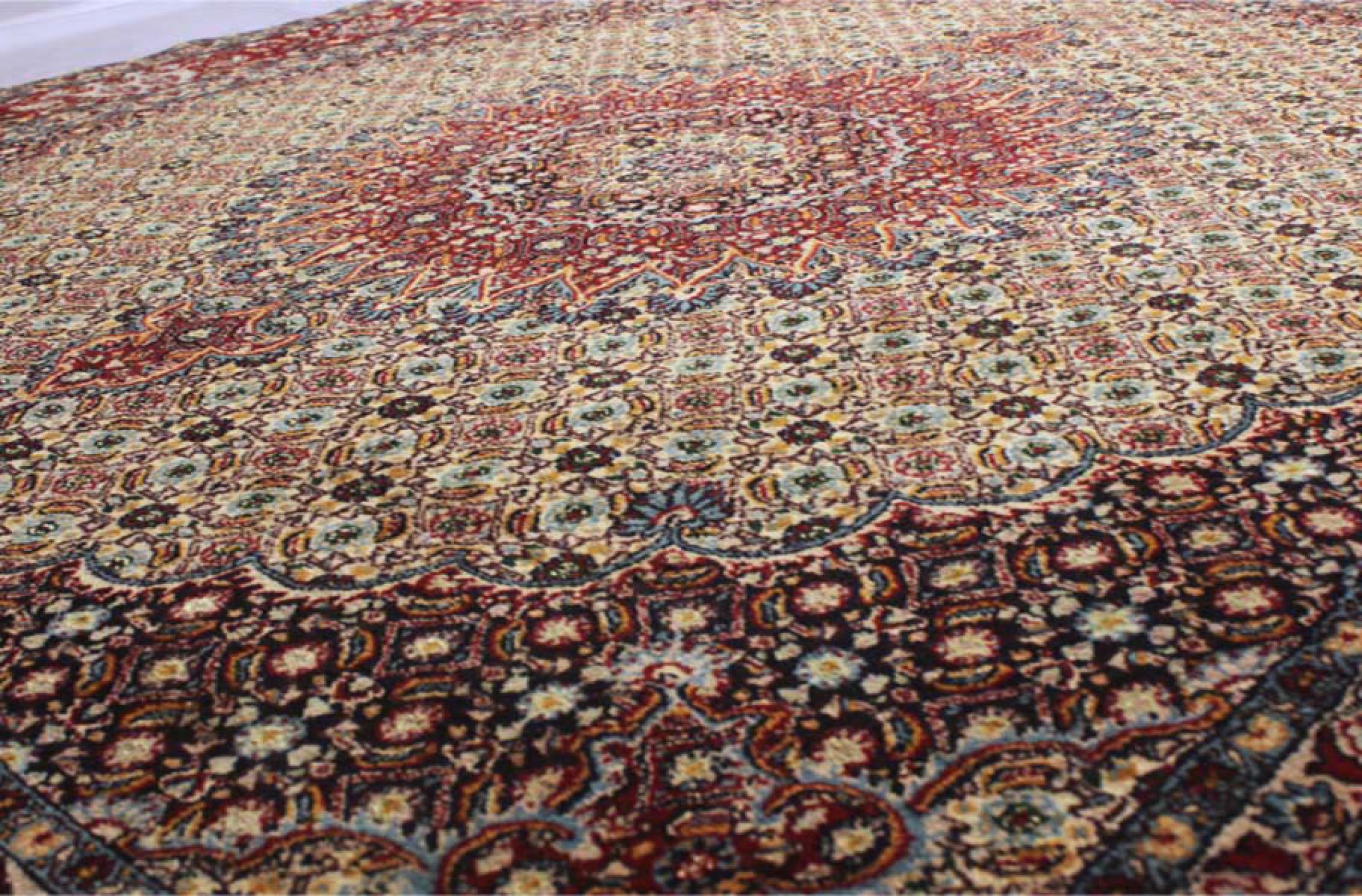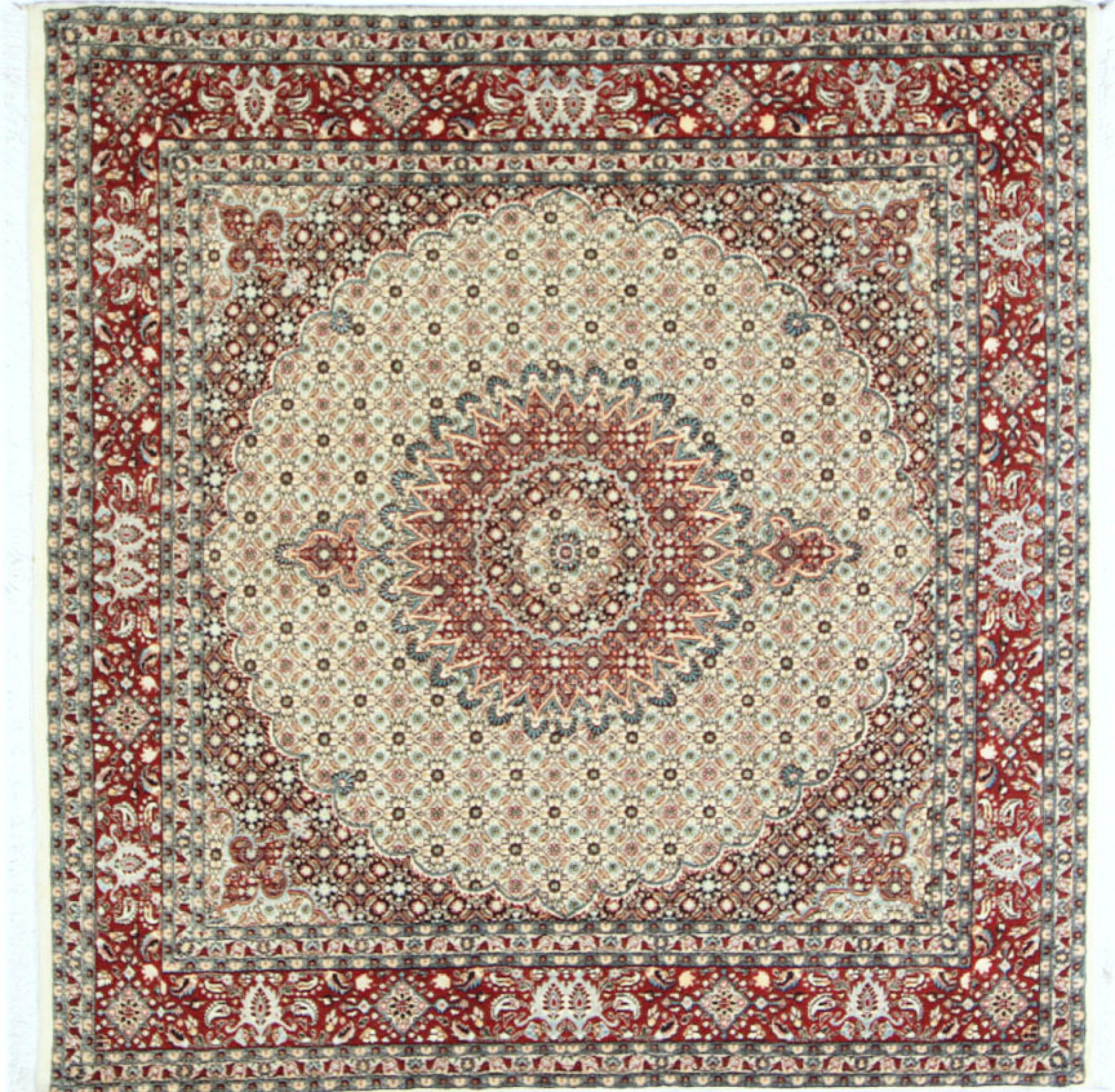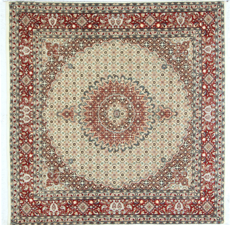 Nº do Tapete: 56434007637727 Tamanho: 200x196 cm Espessura: aproximadamente 12 mm Nós: 320 000 - 360 000 / m² Processamento: Atado à mão Veludo: Lã tecida à mão Urdidura: Algodão Origem: Pérsia / Iran Idade: Novo Peso: aproximadamente 14 kg Em armazém: Único - Apenas 1 em stock