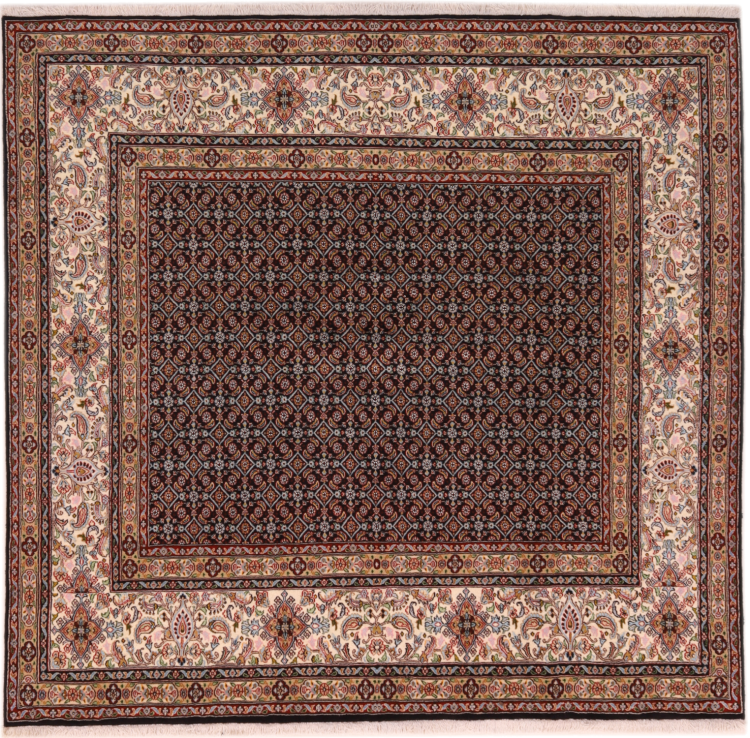 Nº do Tapete: 212678005223406 Tamanho: 201x193 cm Espessura: aproximadamente 12 mm Nós: 320 000 - 360 000 / m² Processamento: Atado à mão Veludo: Lã com seda Urdidura: Algodão Origem: Pérsia / Iran Idade: Novo Peso: aproximadamente 14 kg Em armazém: Único - Apenas 1 em stock