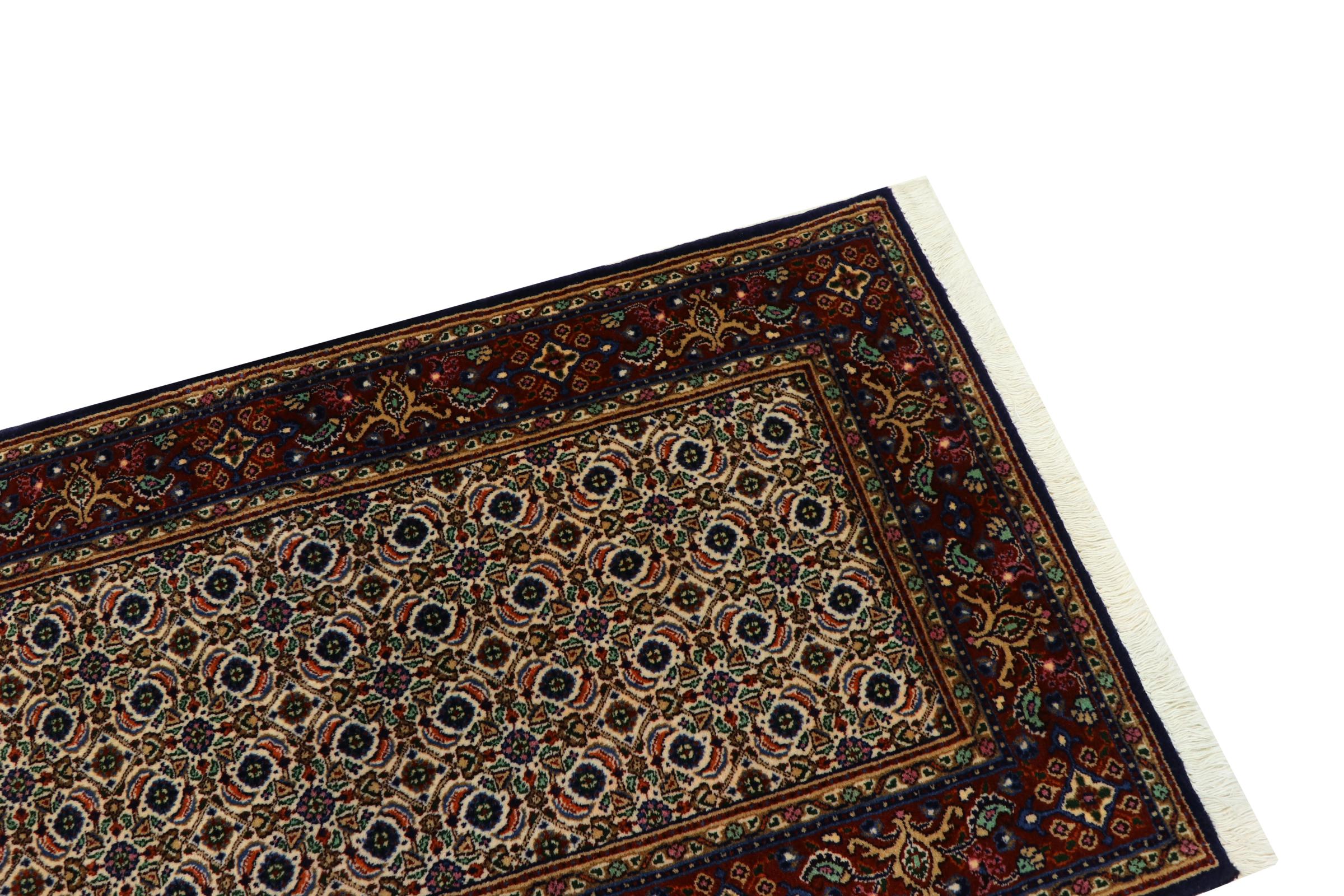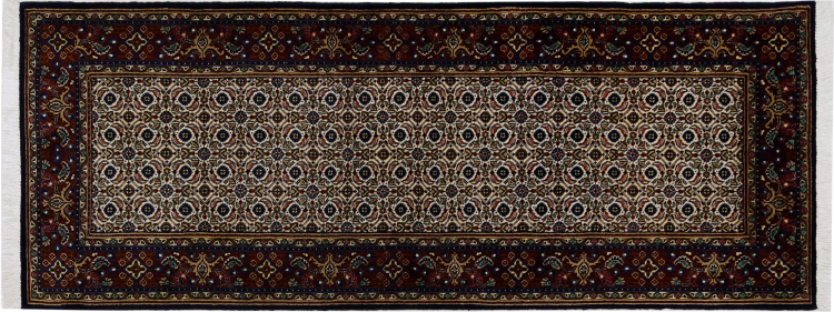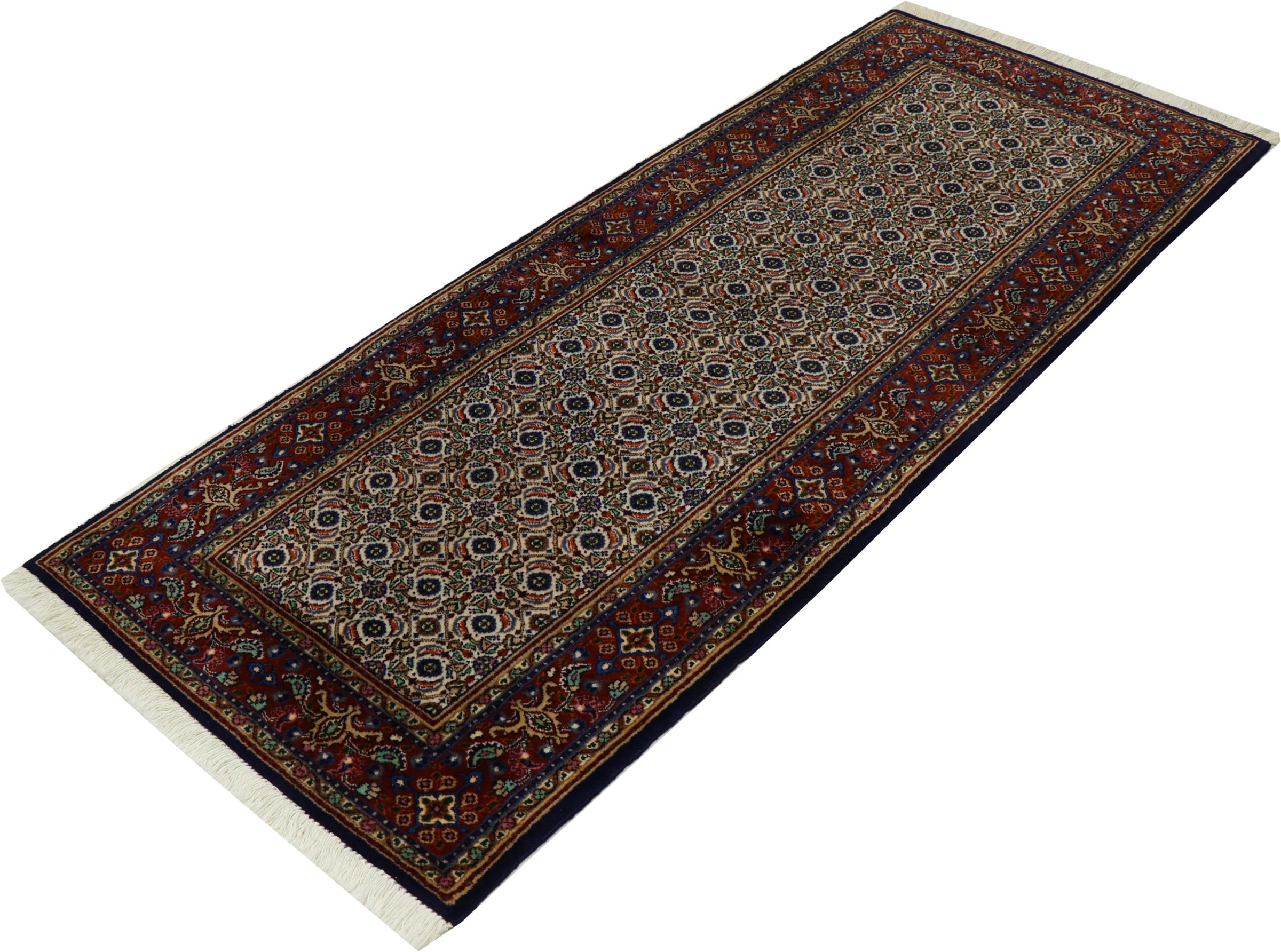 Este tapete de Moud, uma cidade situada 300 km a sul de Mashhad, impressiona à primeira vista. O padrão típico Herati ou desenho de jardim é apreciado por conhecedores e amantes de tapetes persas genuínos. Se procura um tapete feito à mão de excelente qualidade com um design muito distinto e caraterístico, está absolutamente certo com este tipo de tapete.