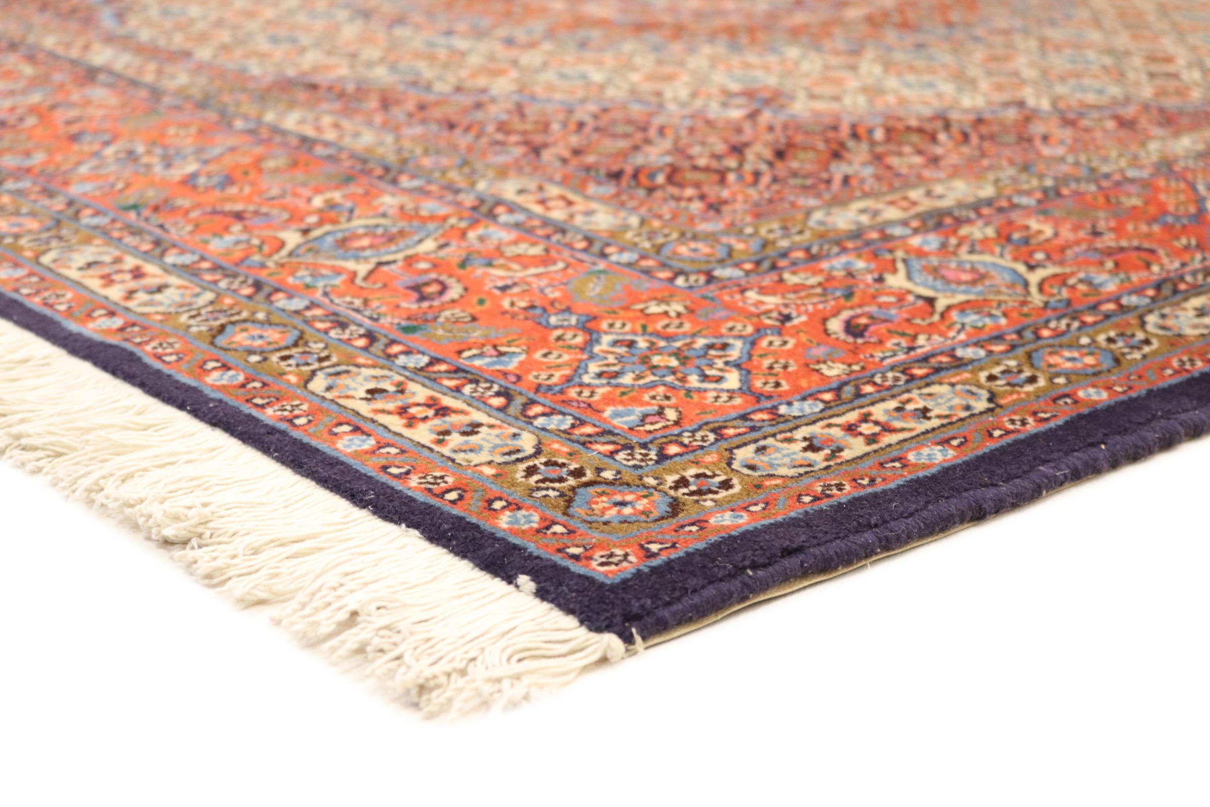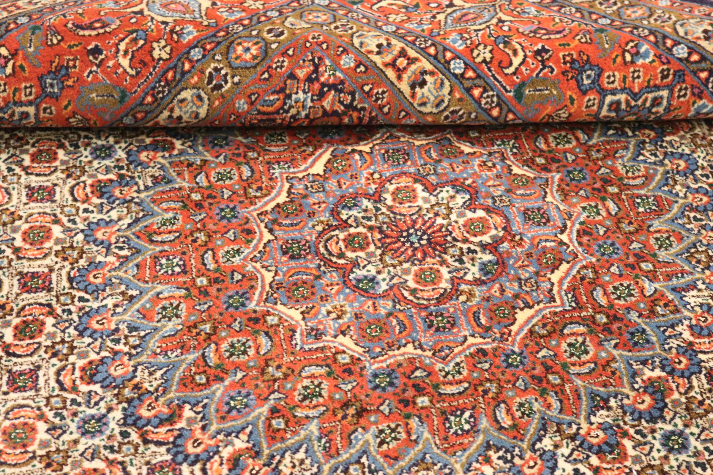 Este tapete de Moud, uma cidade situada 300 km a sul de Mashhad, impressiona à primeira vista. O padrão típico Herati ou desenho de jardim é apreciado por conhecedores e amantes de tapetes persas genuínos. Se procura um tapete feito à mão de excelente qualidade com um design muito distinto e caraterístico, está absolutamente certo com este tipo de tapete.