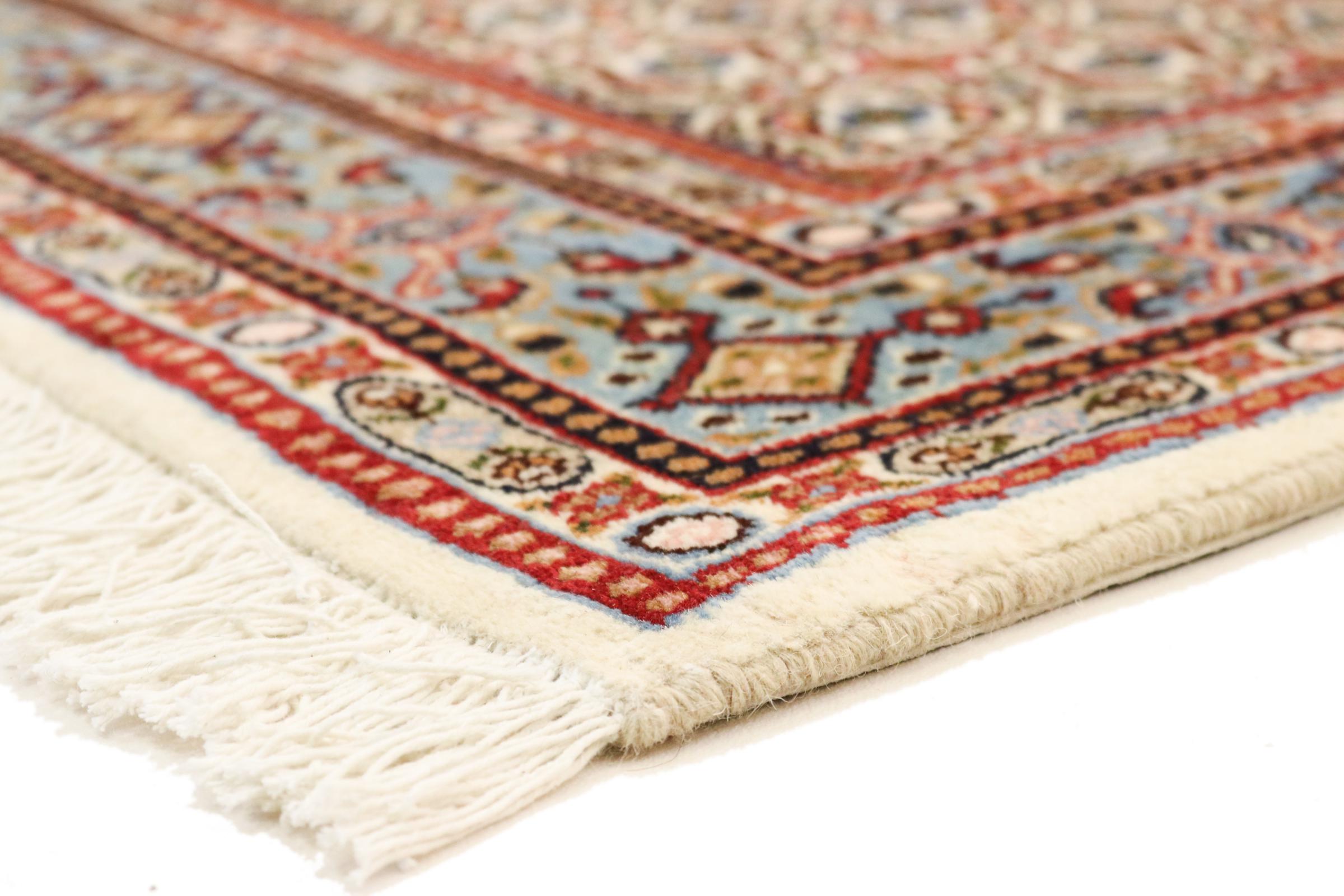 Este tapete de Moud, uma cidade situada 300 km a sul de Mashhad, impressiona à primeira vista. O padrão típico Herati ou desenho de jardim é apreciado por conhecedores e amantes de tapetes persas genuínos. Se procura um tapete feito à mão de excelente qualidade com um design muito distinto e caraterístico, está absolutamente certo com este tipo de tapete.