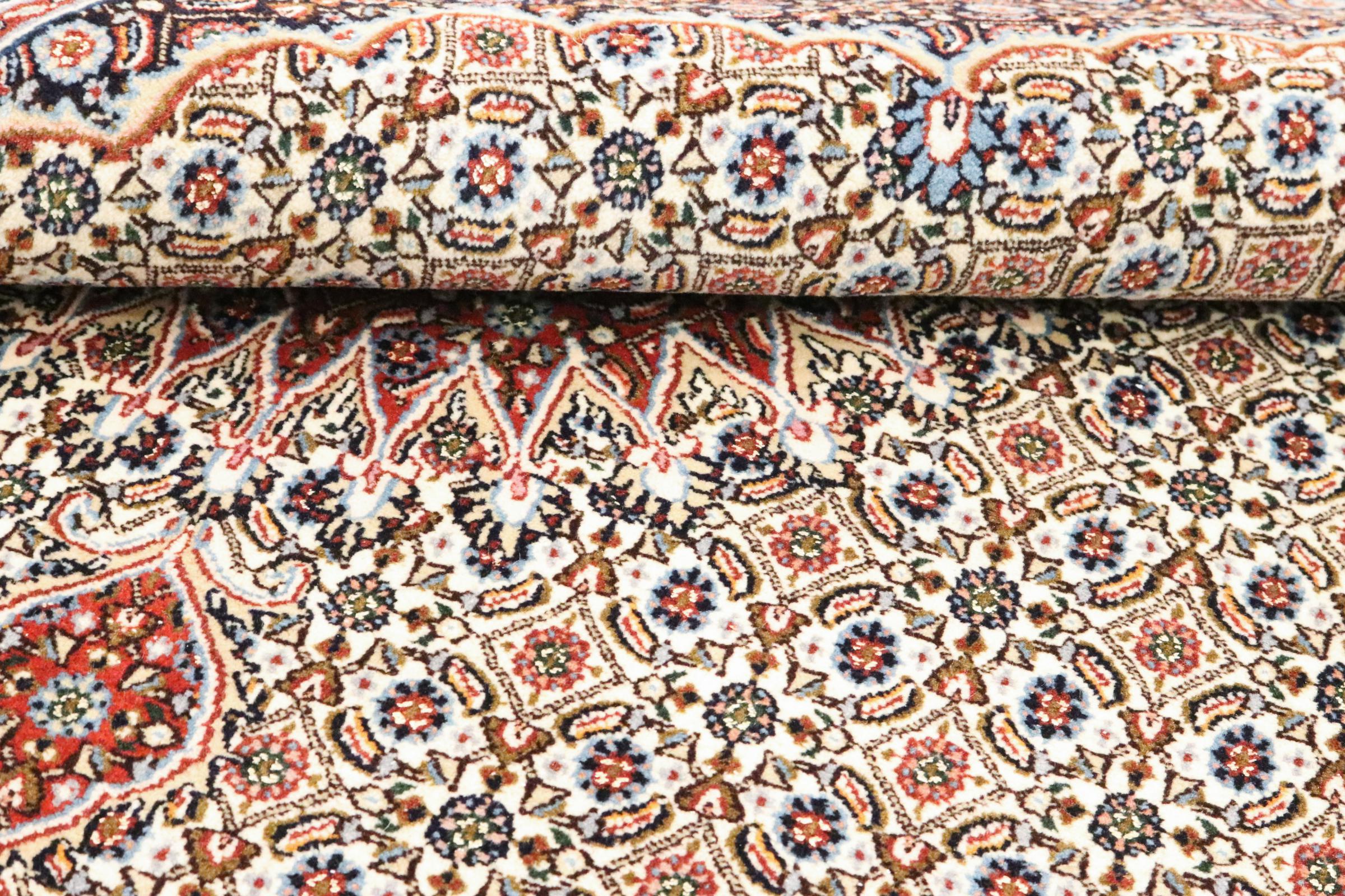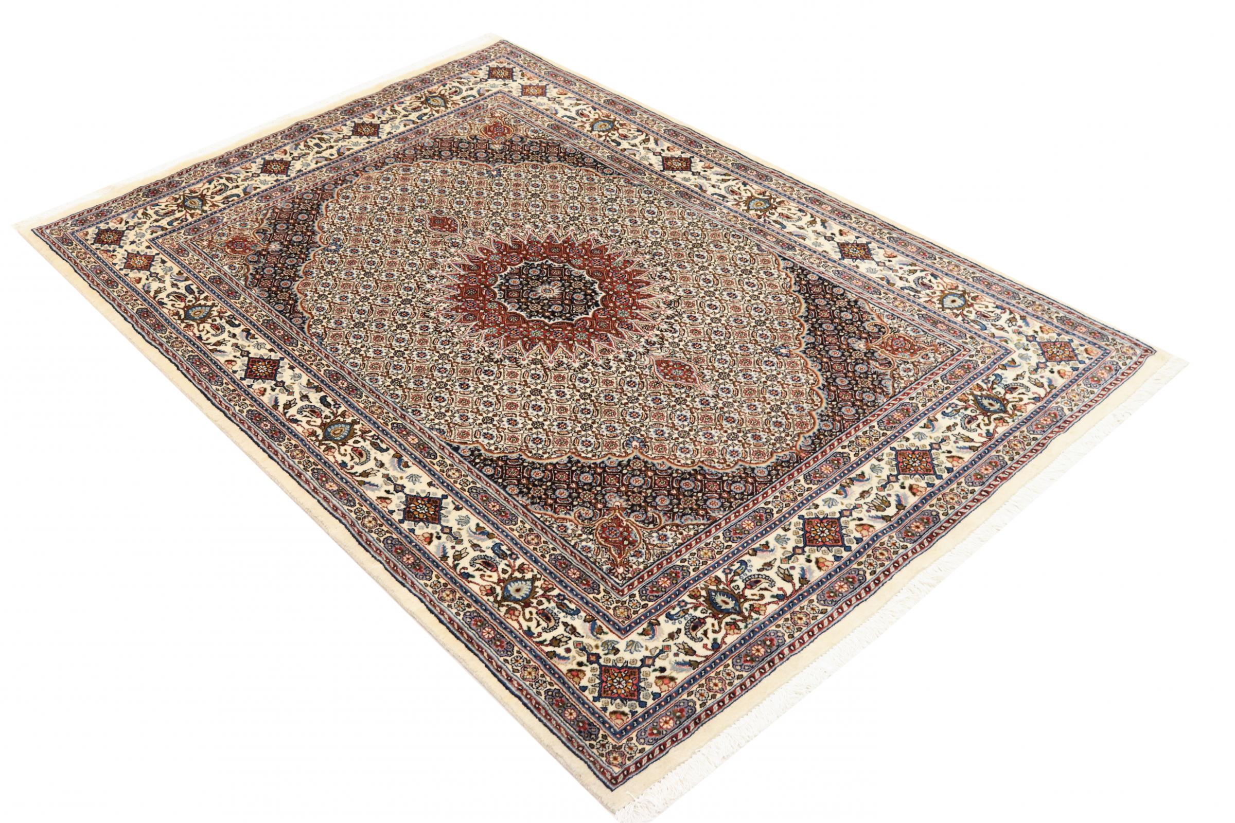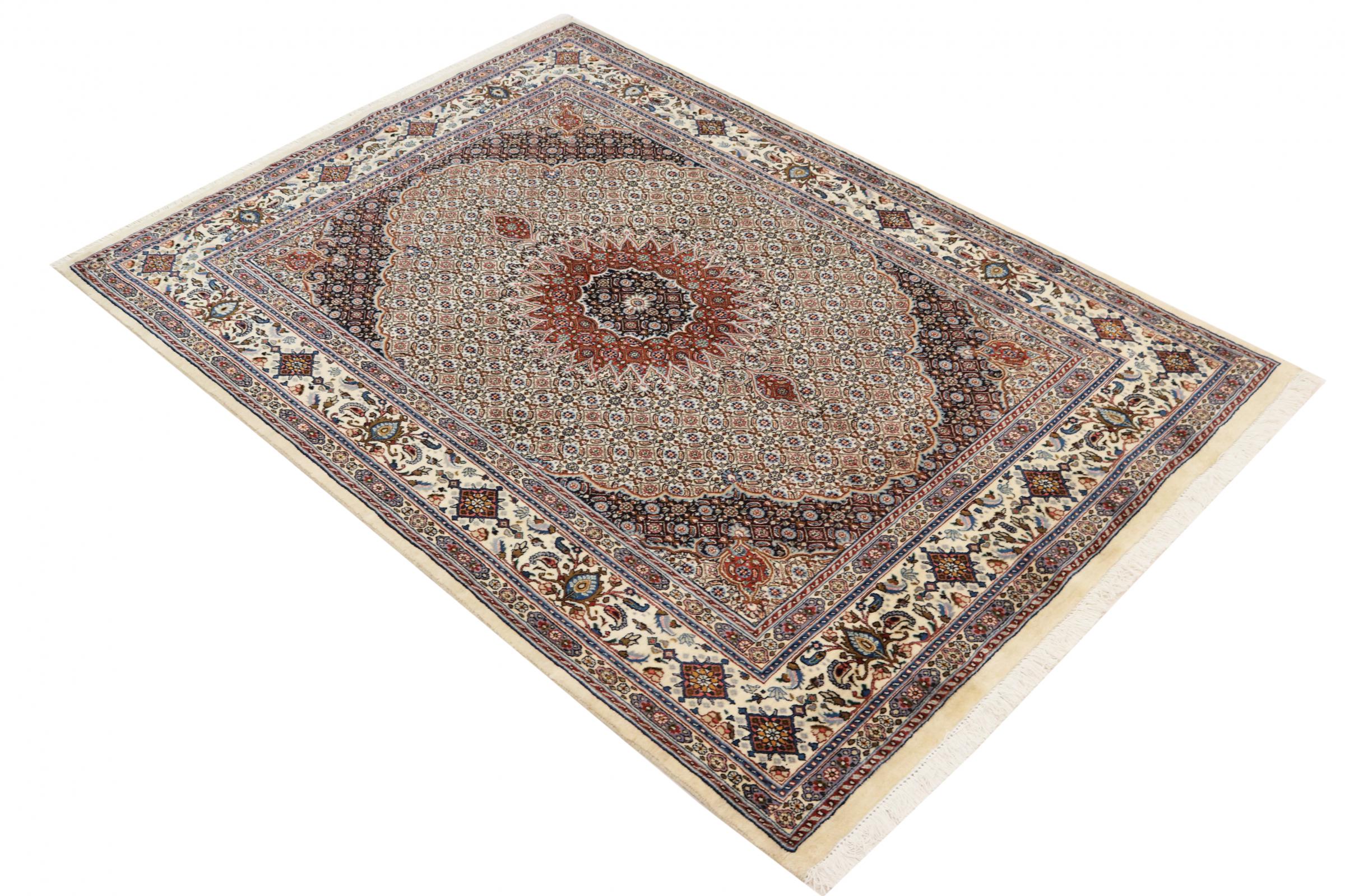 Este tapete de Moud, uma cidade situada 300 km a sul de Mashhad, impressiona à primeira vista. O padrão típico Herati ou desenho de jardim é apreciado por conhecedores e amantes de tapetes persas genuínos. Se procura um tapete feito à mão de excelente qualidade com um design muito distinto e caraterístico, está absolutamente certo com este tipo de tapete.