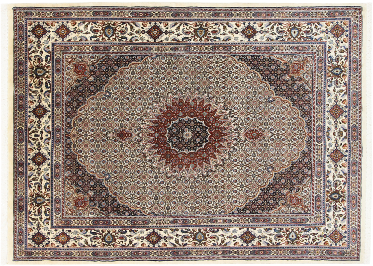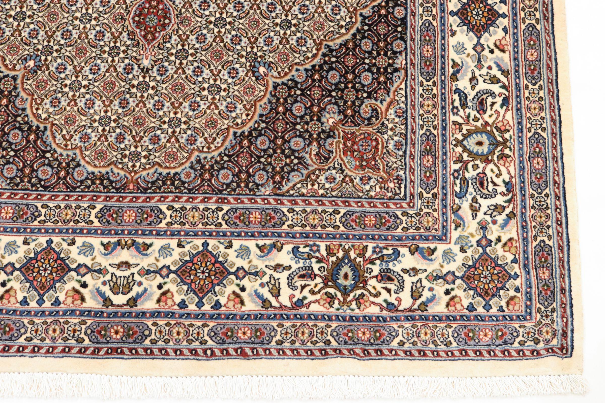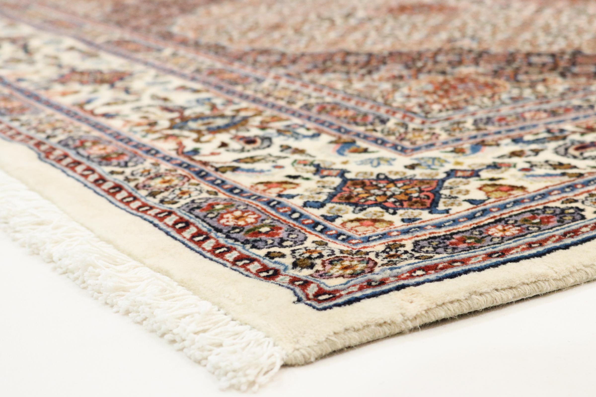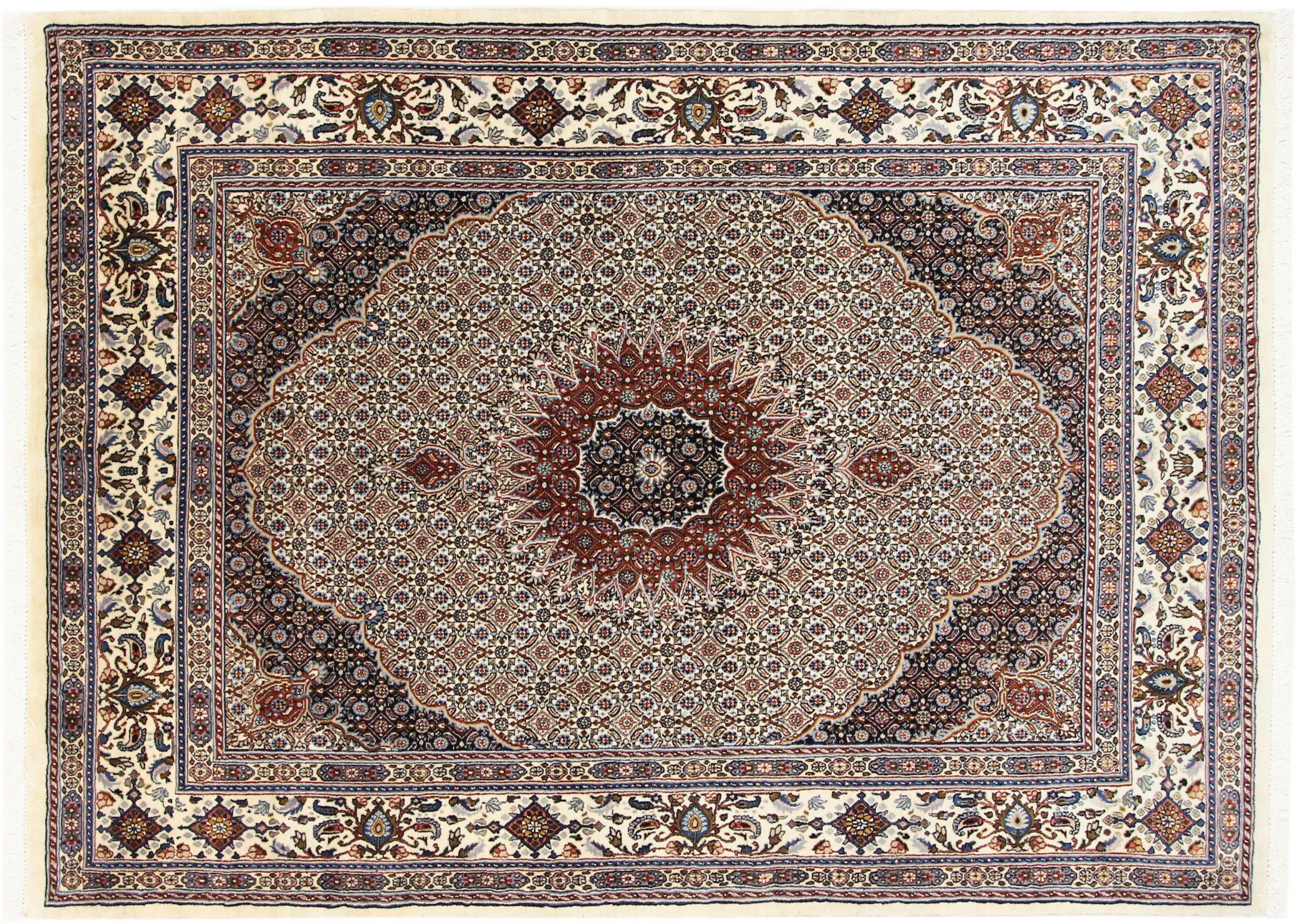Este tapete de Moud, uma cidade situada 300 km a sul de Mashhad, impressiona à primeira vista. O padrão típico Herati ou desenho de jardim é apreciado por conhecedores e amantes de tapetes persas genuínos. Se procura um tapete feito à mão de excelente qualidade com um design muito distinto e caraterístico, está absolutamente certo com este tipo de tapete.