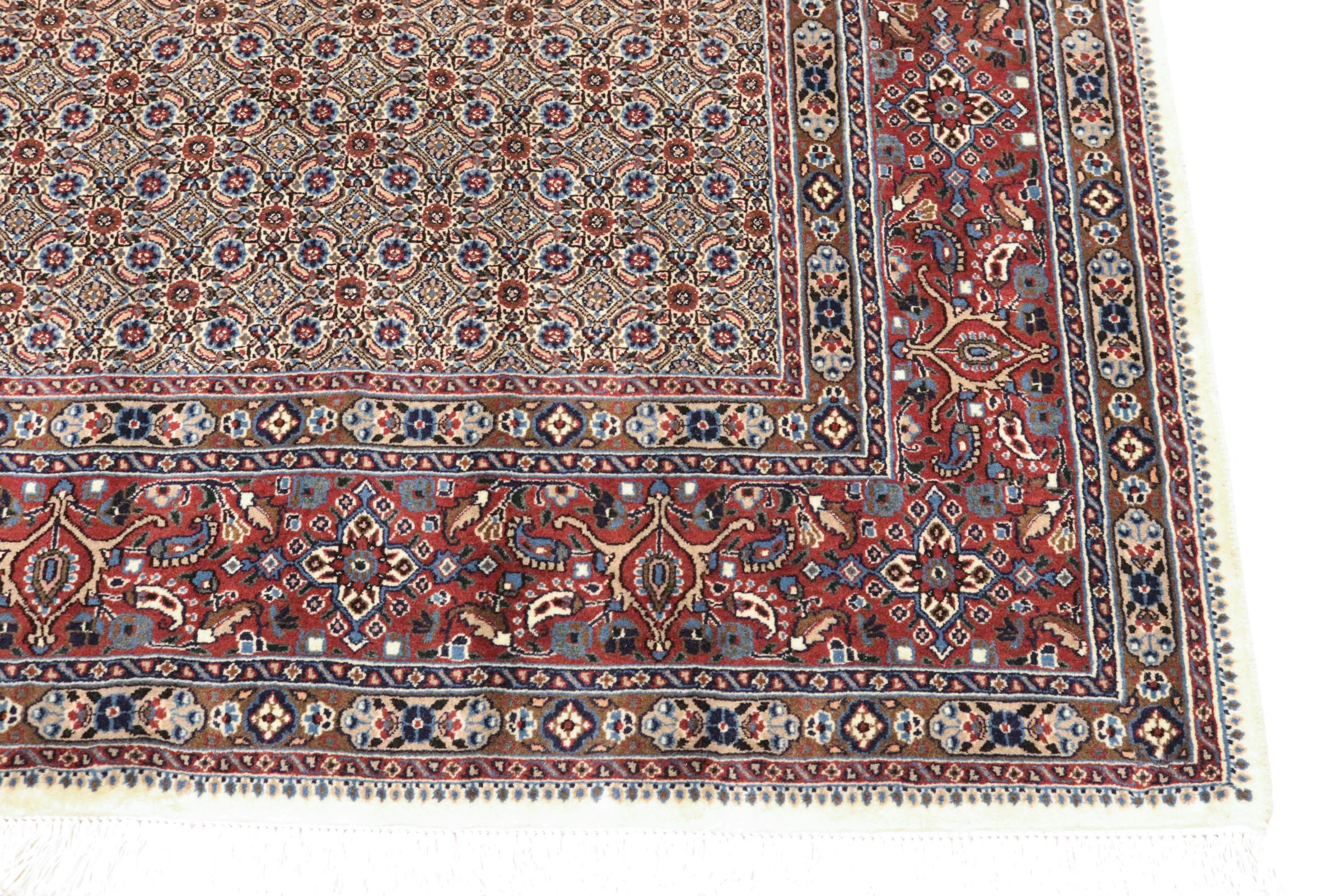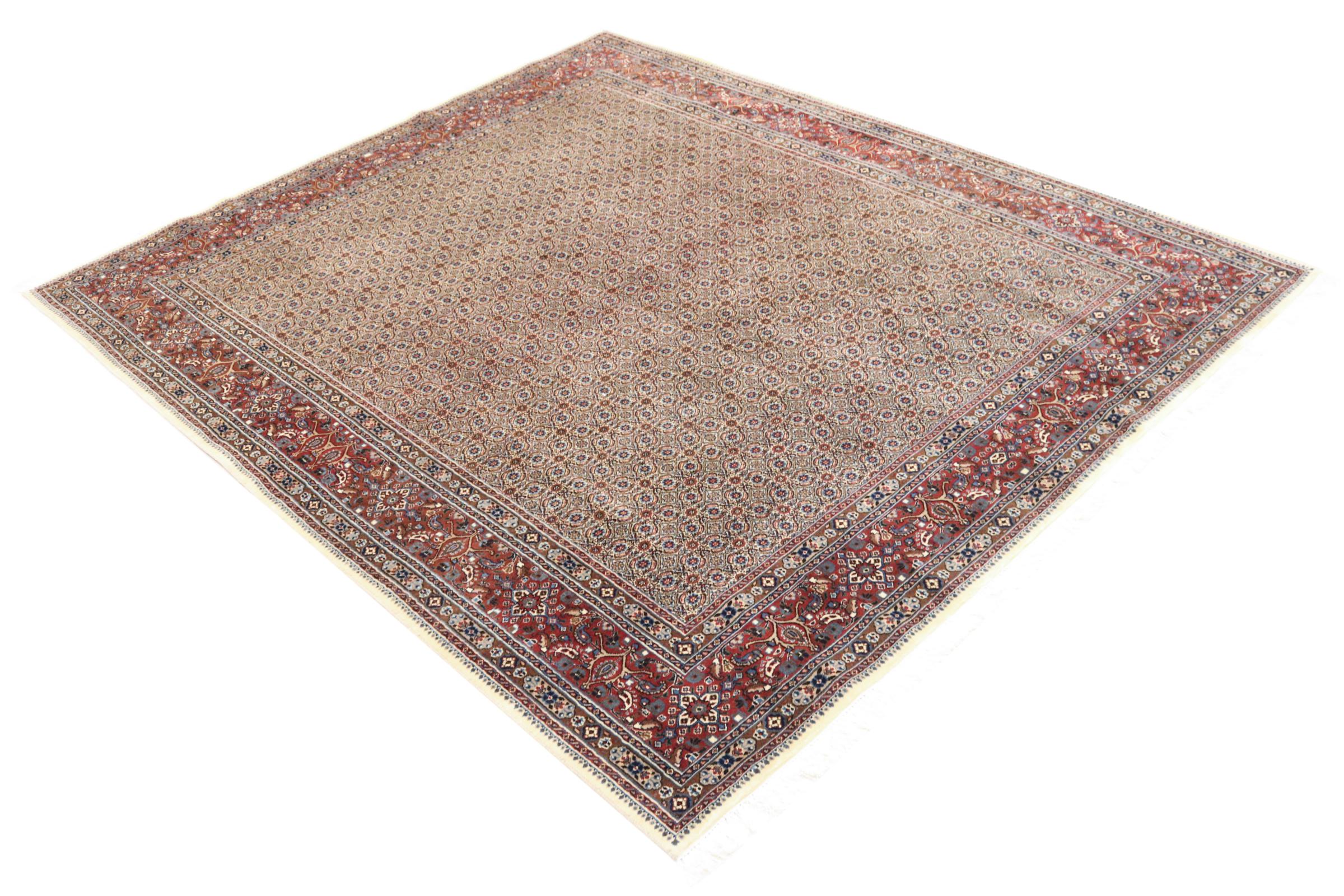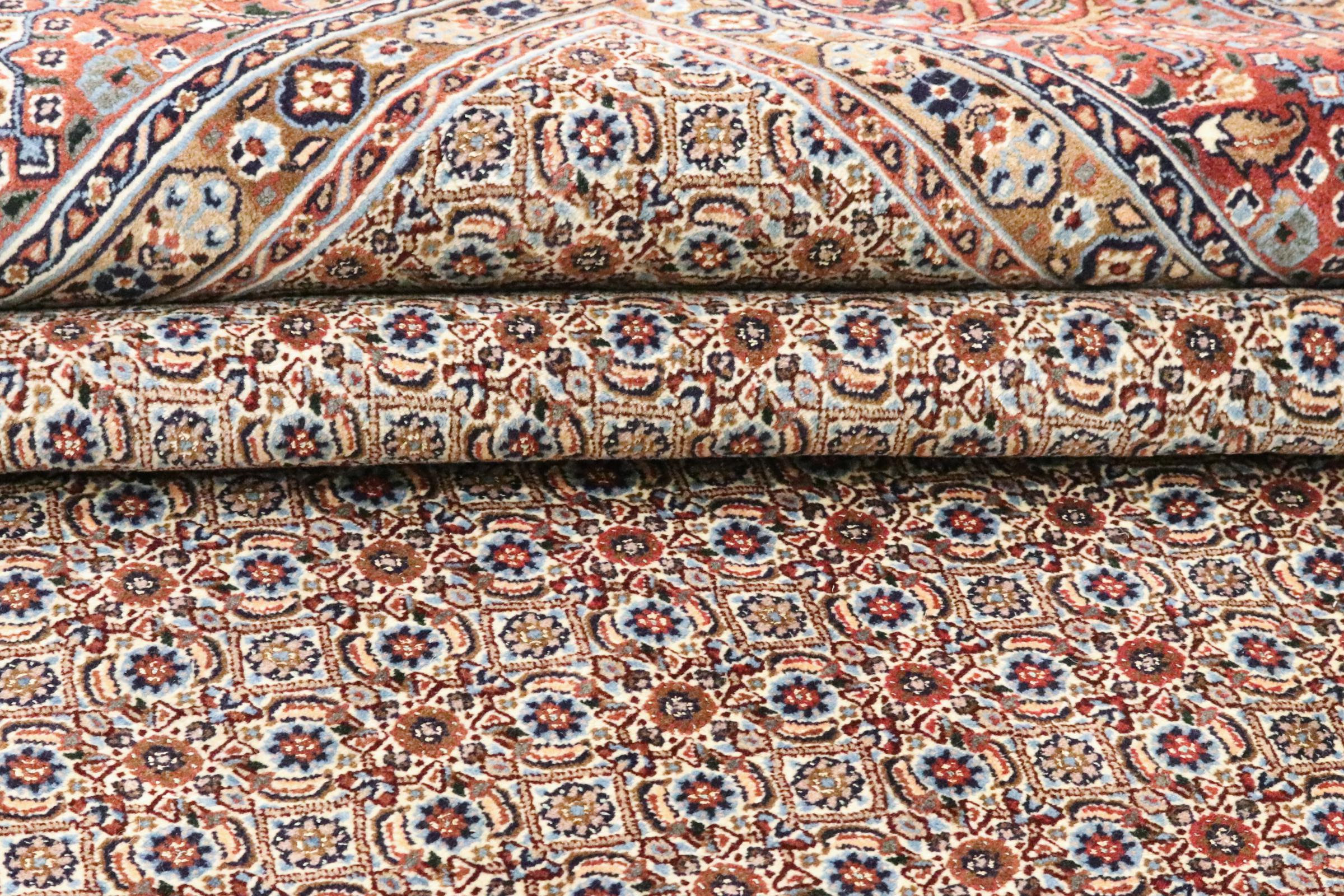 Este tapete de Moud, uma cidade situada 300 km a sul de Mashhad, impressiona à primeira vista. O padrão típico Herati ou desenho de jardim é apreciado por conhecedores e amantes de tapetes persas genuínos. Se procura um tapete feito à mão de excelente qualidade com um design muito distinto e caraterístico, está absolutamente certo com este tipo de tapete.