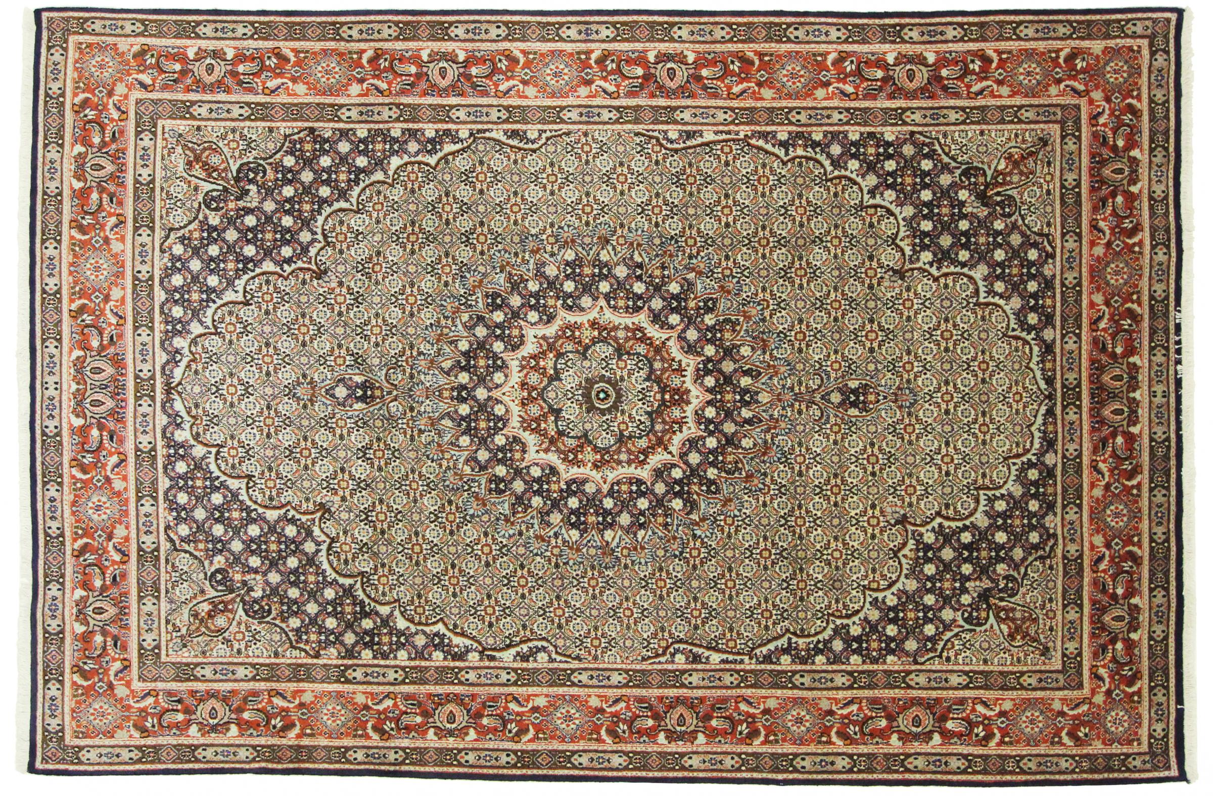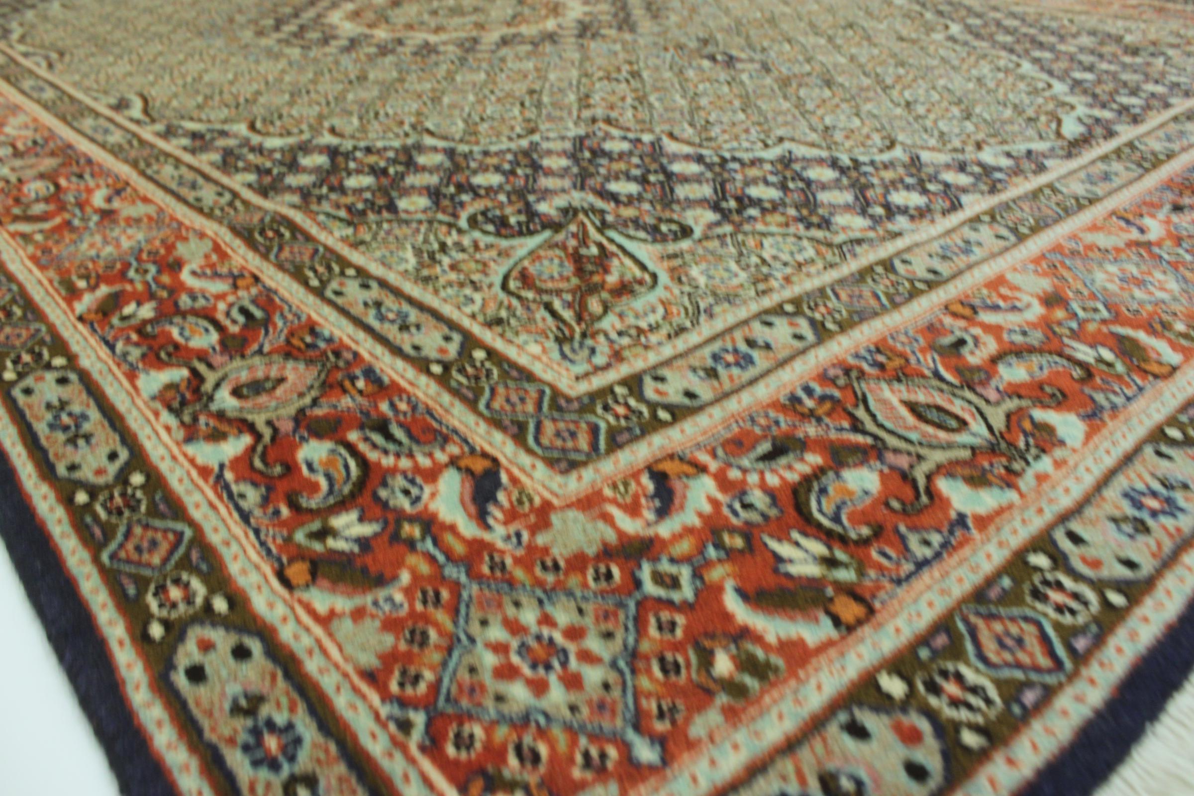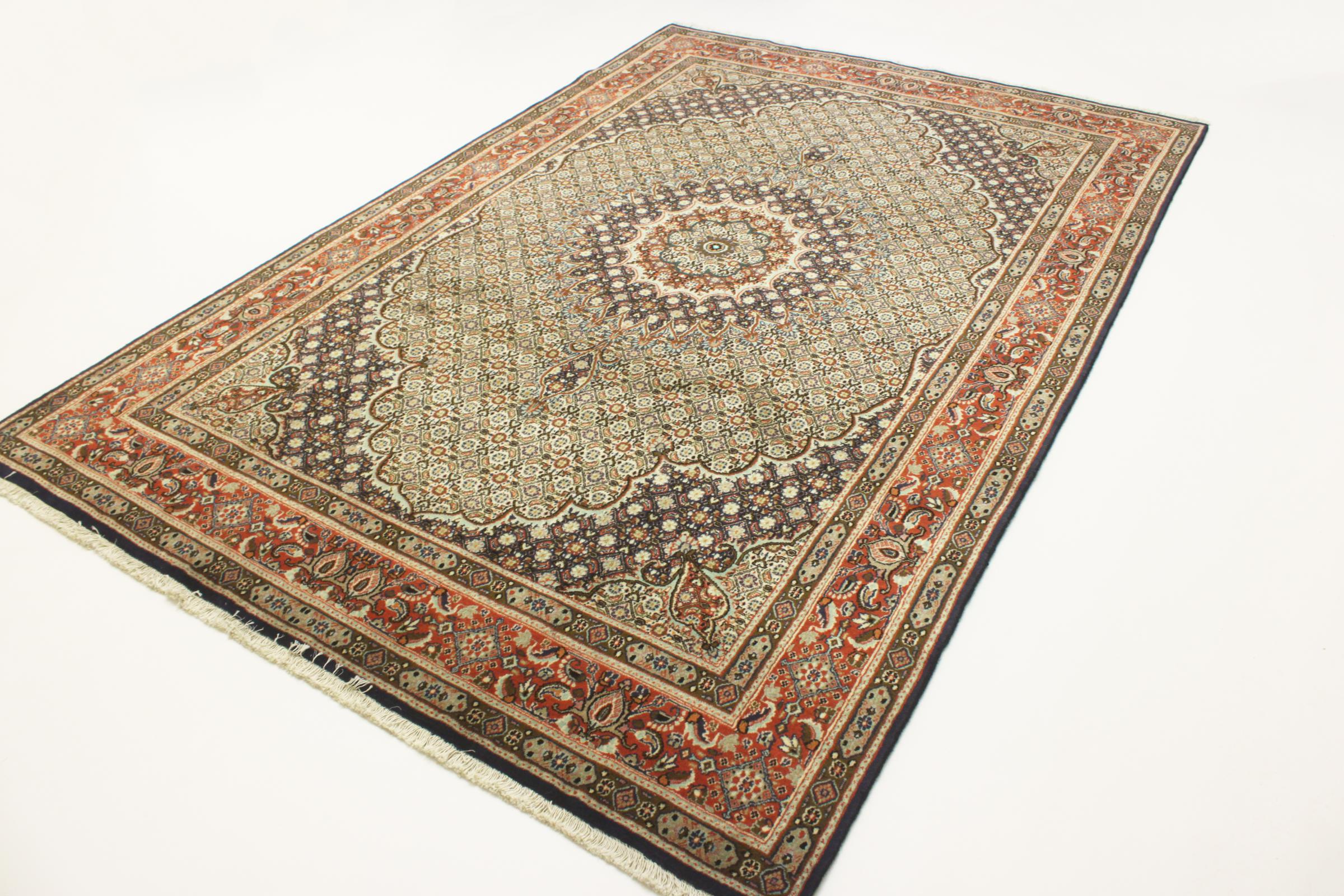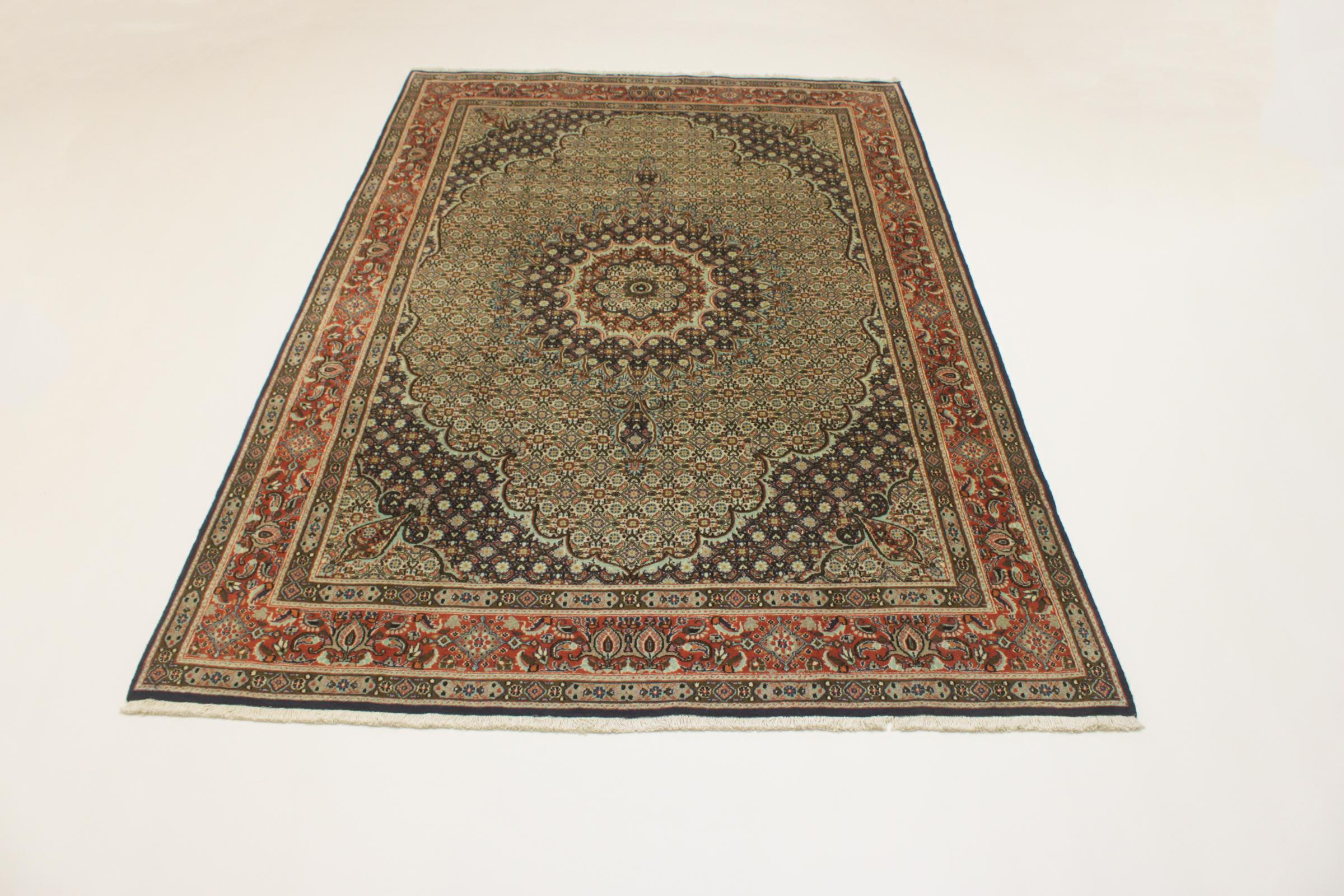 Este tapete de Moud, uma cidade situada 300 km a sul de Mashhad, impressiona à primeira vista. O padrão típico Herati ou desenho de jardim é apreciado por conhecedores e amantes de tapetes persas genuínos. Se procura um tapete feito à mão de excelente qualidade com um design muito distinto e caraterístico, está absolutamente certo com este tipo de tapete.