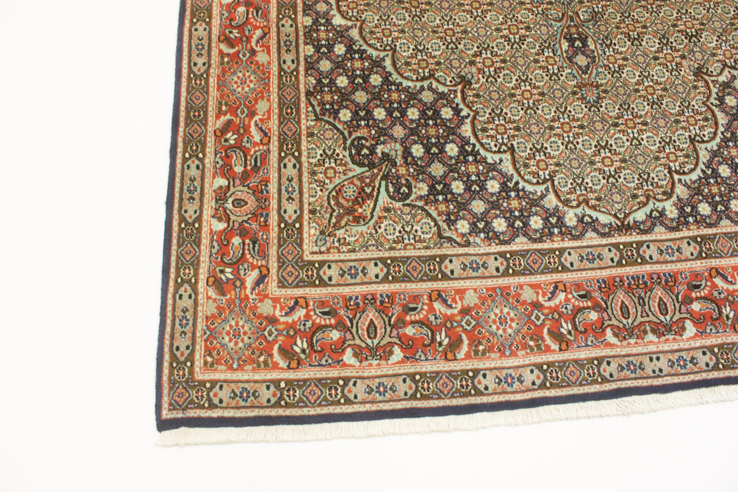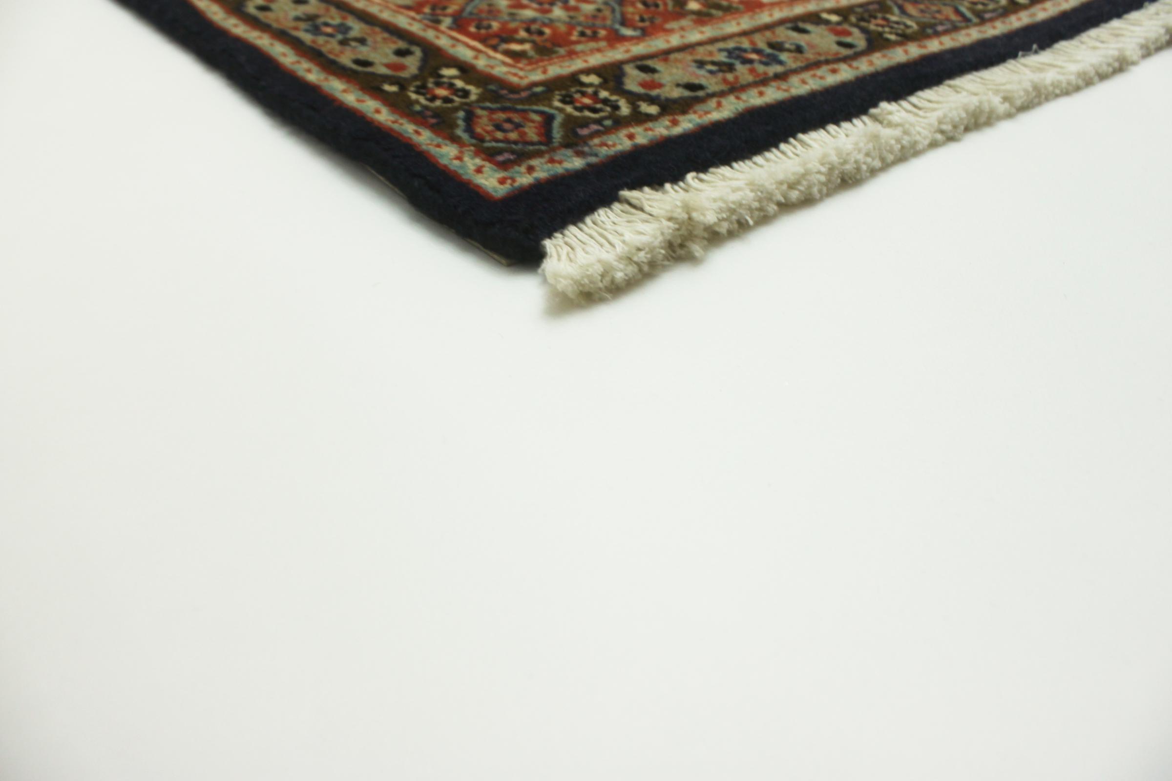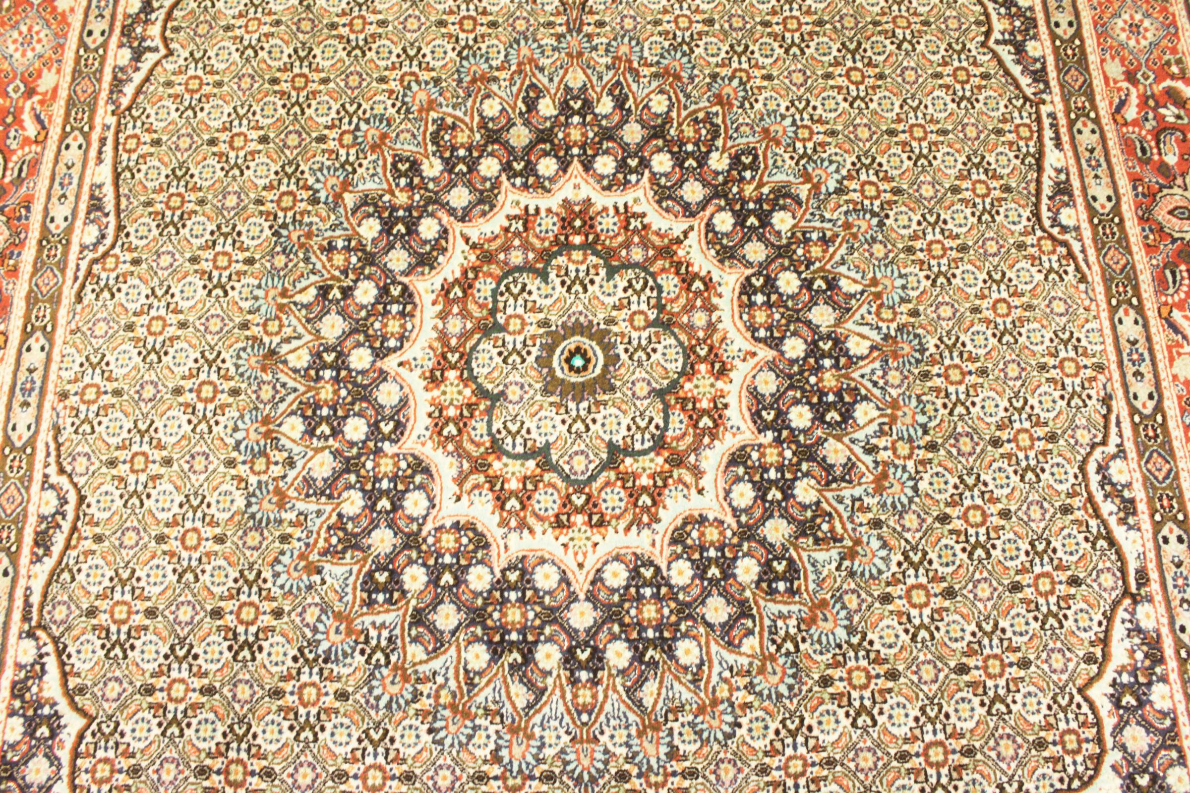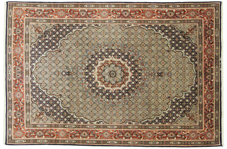 Este tapete de Moud, uma cidade situada 300 km a sul de Mashhad, impressiona à primeira vista. O padrão típico Herati ou desenho de jardim é apreciado por conhecedores e amantes de tapetes persas genuínos. Se procura um tapete feito à mão de excelente qualidade com um design muito distinto e caraterístico, está absolutamente certo com este tipo de tapete.