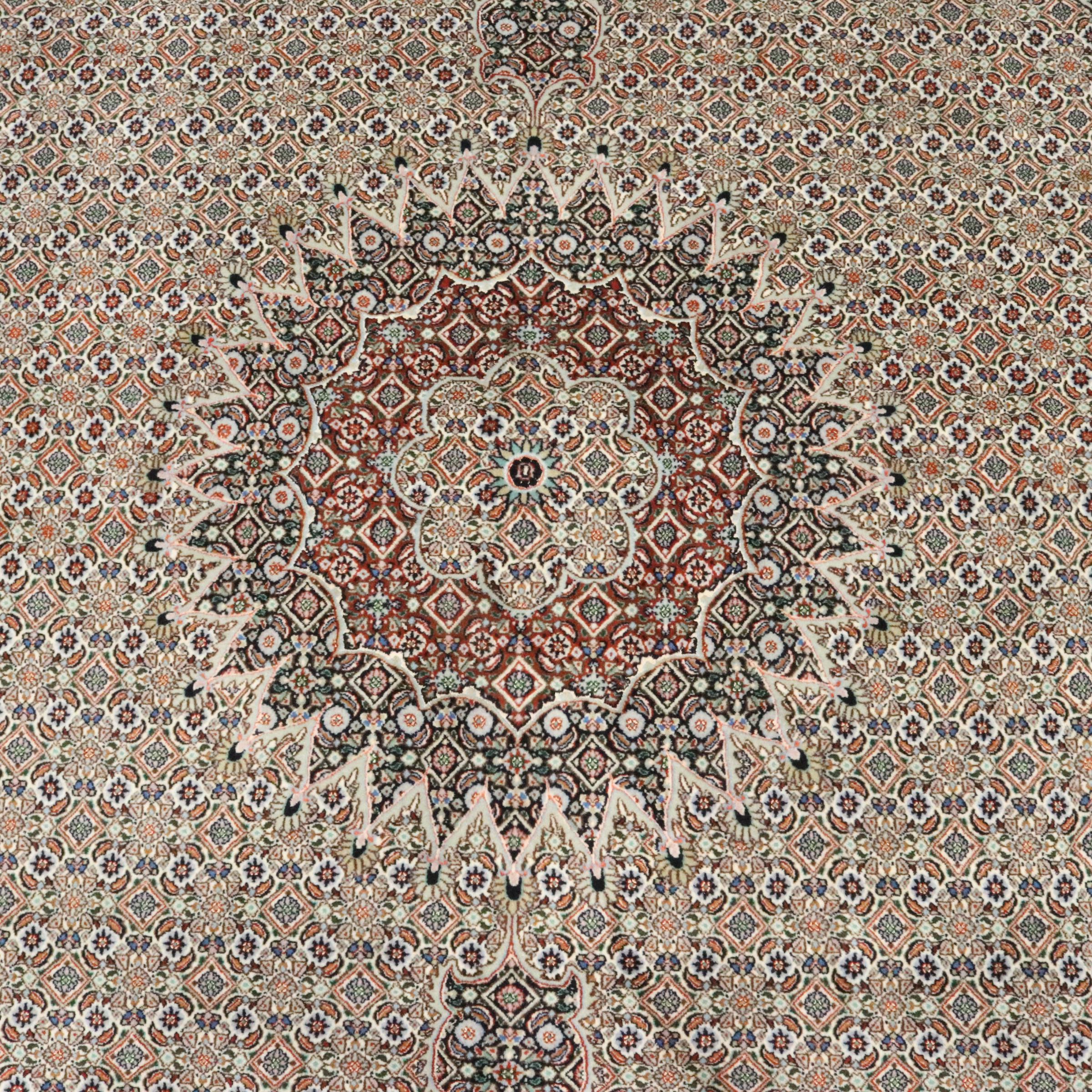 Nº do Tapete: 242695007867914 Tamanho: 341x248 cm Espessura: aproximadamente 12 mm Nós: 290 000 - 320 000 / m² Processamento: Atado à mão Veludo: Lã com seda Urdidura: Algodão Origem: Pérsia / Iran Idade: Novo Peso: aproximadamente 30 kg Em armazém: Único - Apenas 1 em stock
