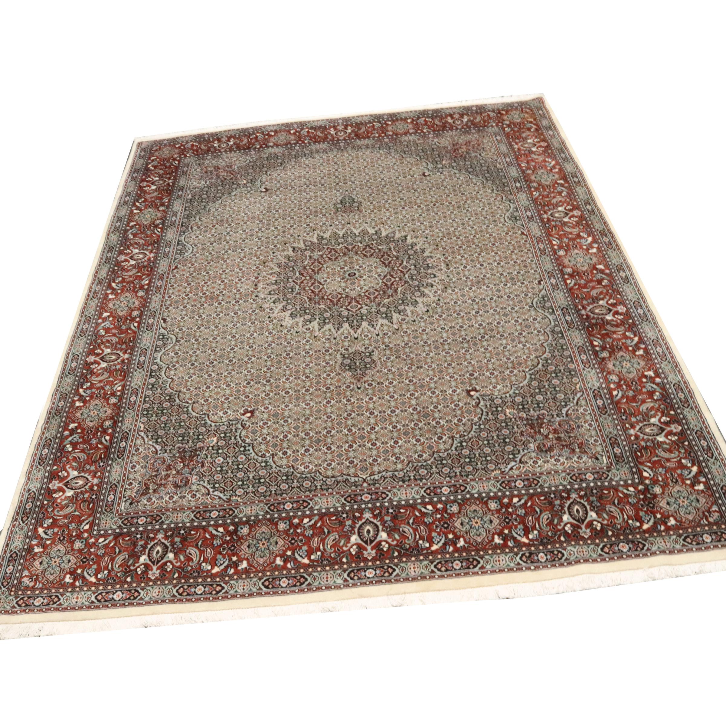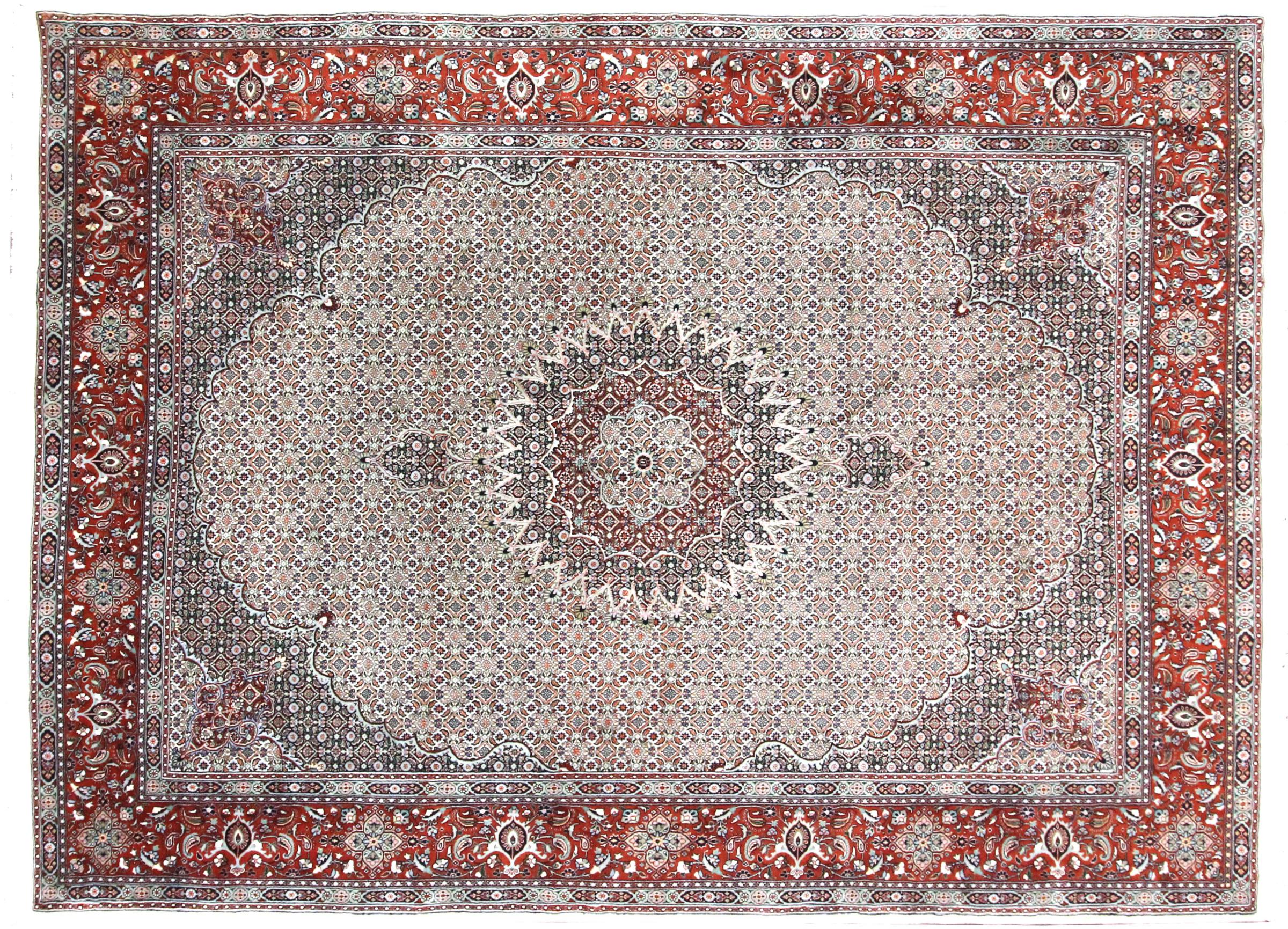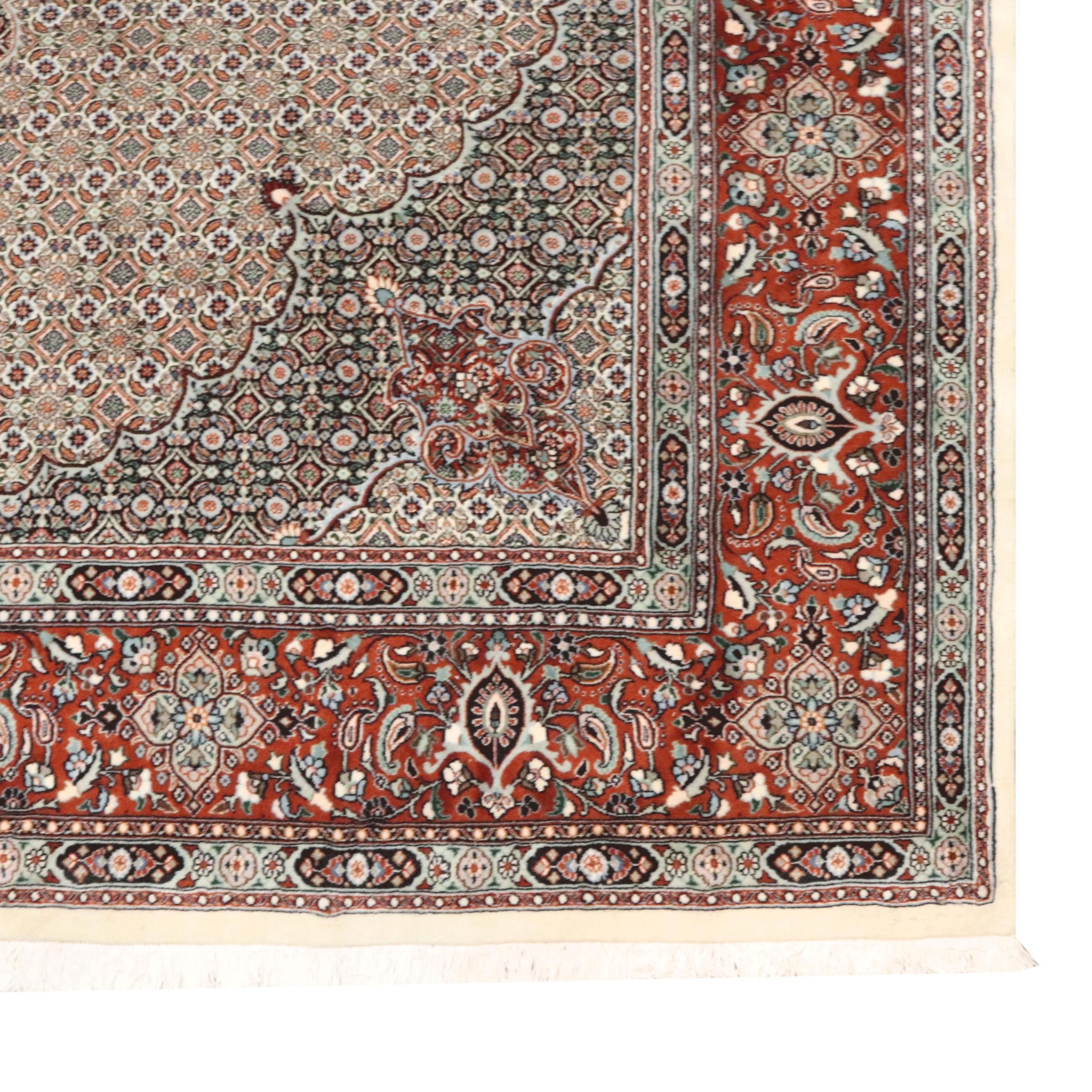 Este tapete de Moud, uma cidade situada 300 km a sul de Mashhad, impressiona à primeira vista. O padrão típico Herati ou desenho de jardim é apreciado por conhecedores e amantes de tapetes persas genuínos. Se procura um tapete feito à mão de excelente qualidade com um design muito distinto e caraterístico, está absolutamente certo com este tipo de tapete.