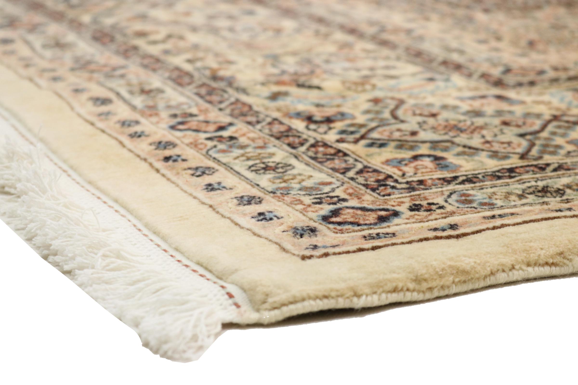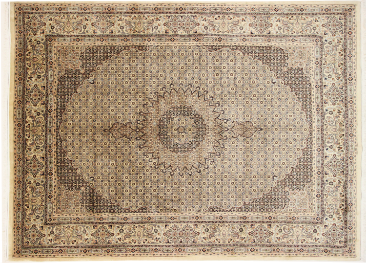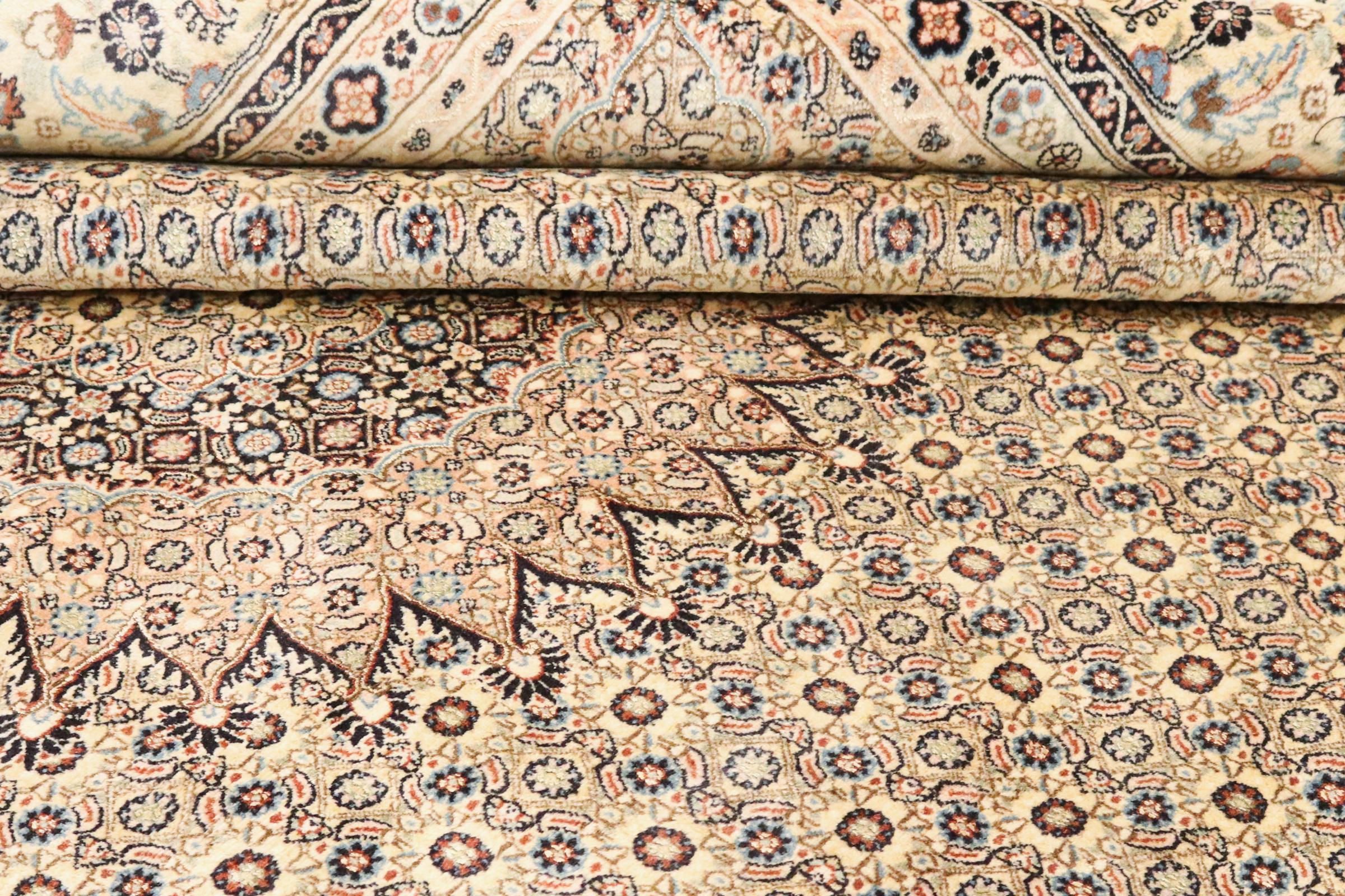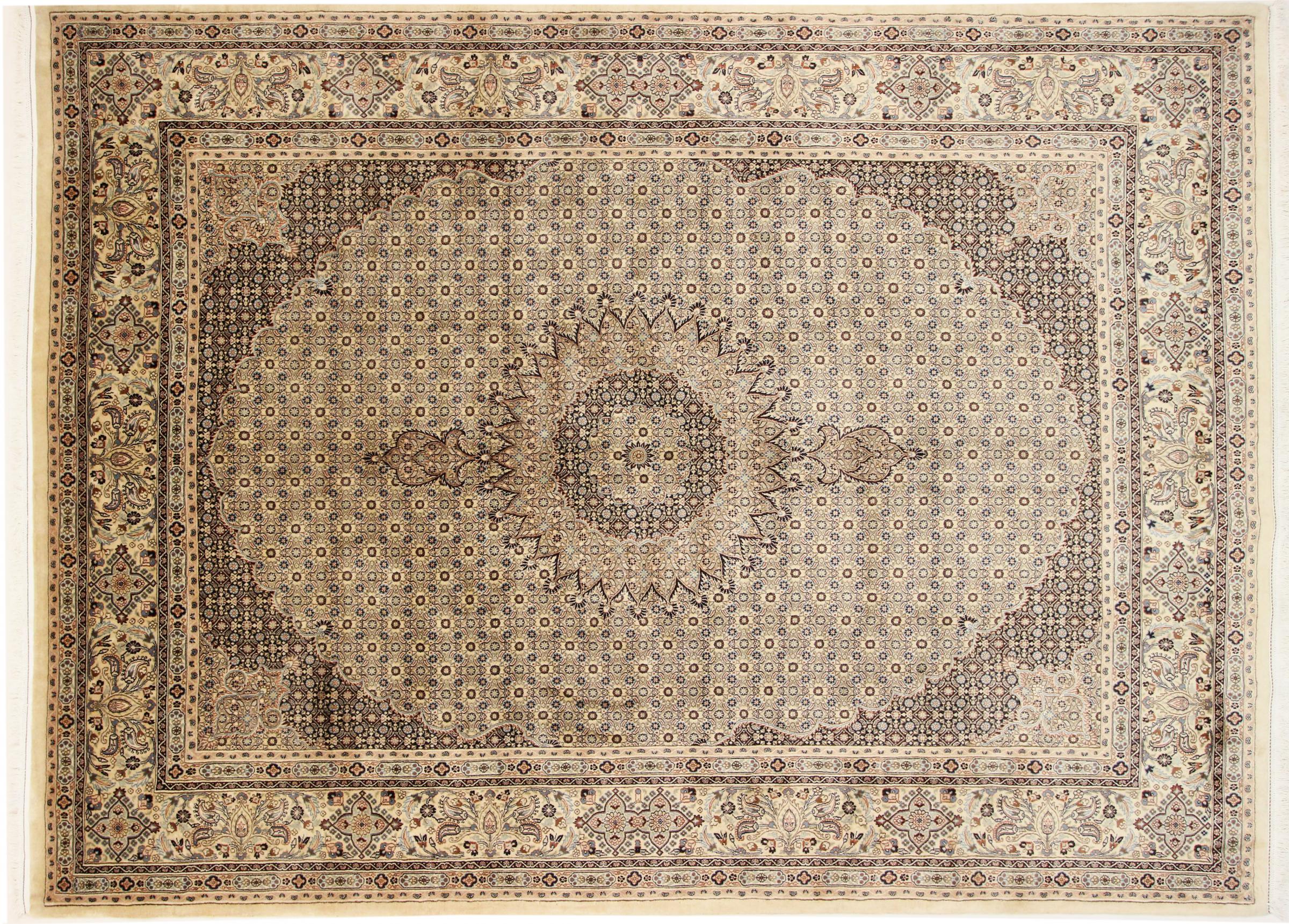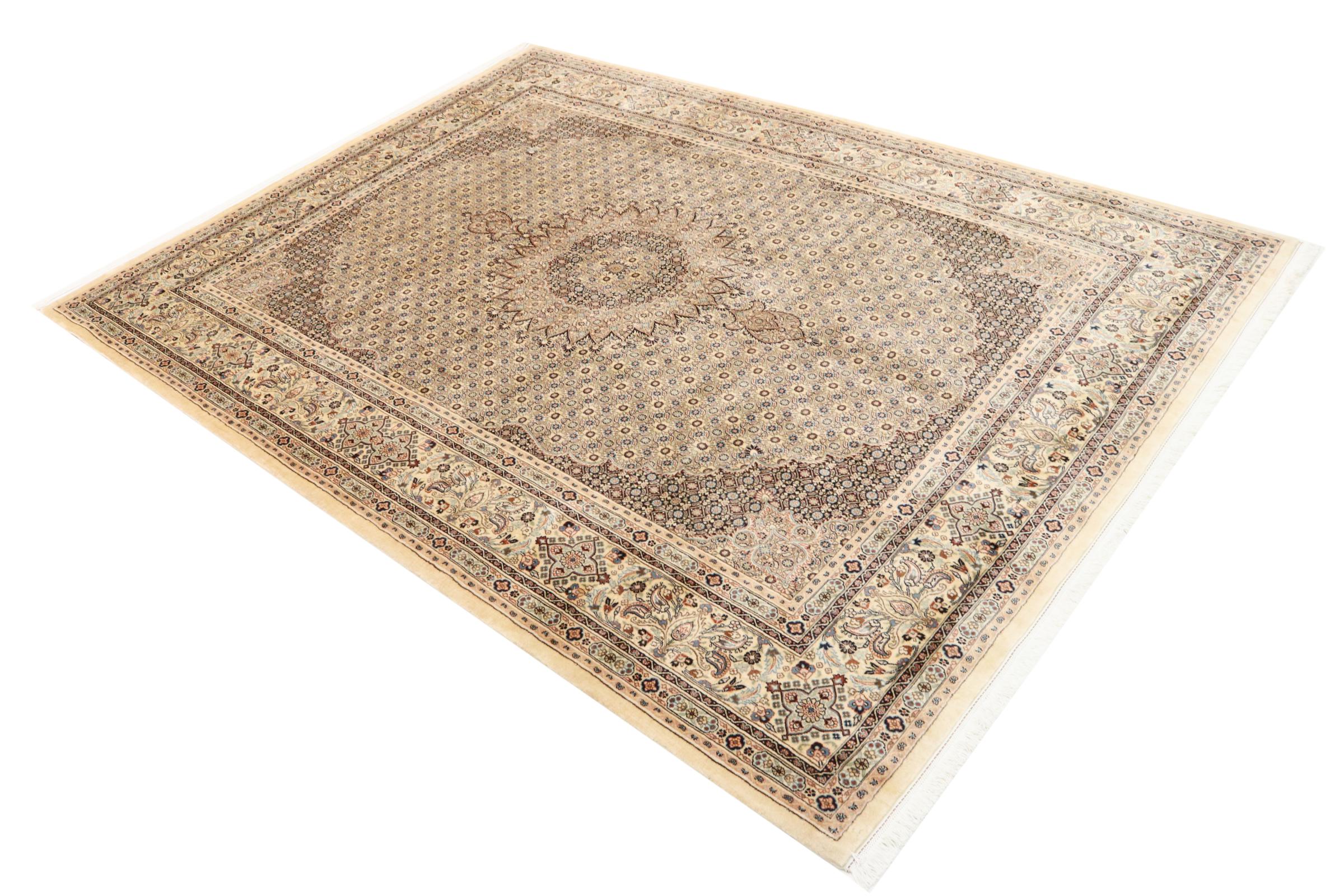 Nº do Tapete: 128550004078125 Tamanho: 347x251 cm Espessura: aproximadamente 12 mm Nós: 320 000 - 350 000 / m² Processamento: Atado à mão Veludo: Lã com seda Urdidura: Algodão Origem: Pérsia / Iran Idade: Novo Peso: aproximadamente 30 kg Em armazém: Único - Apenas 1 em stock