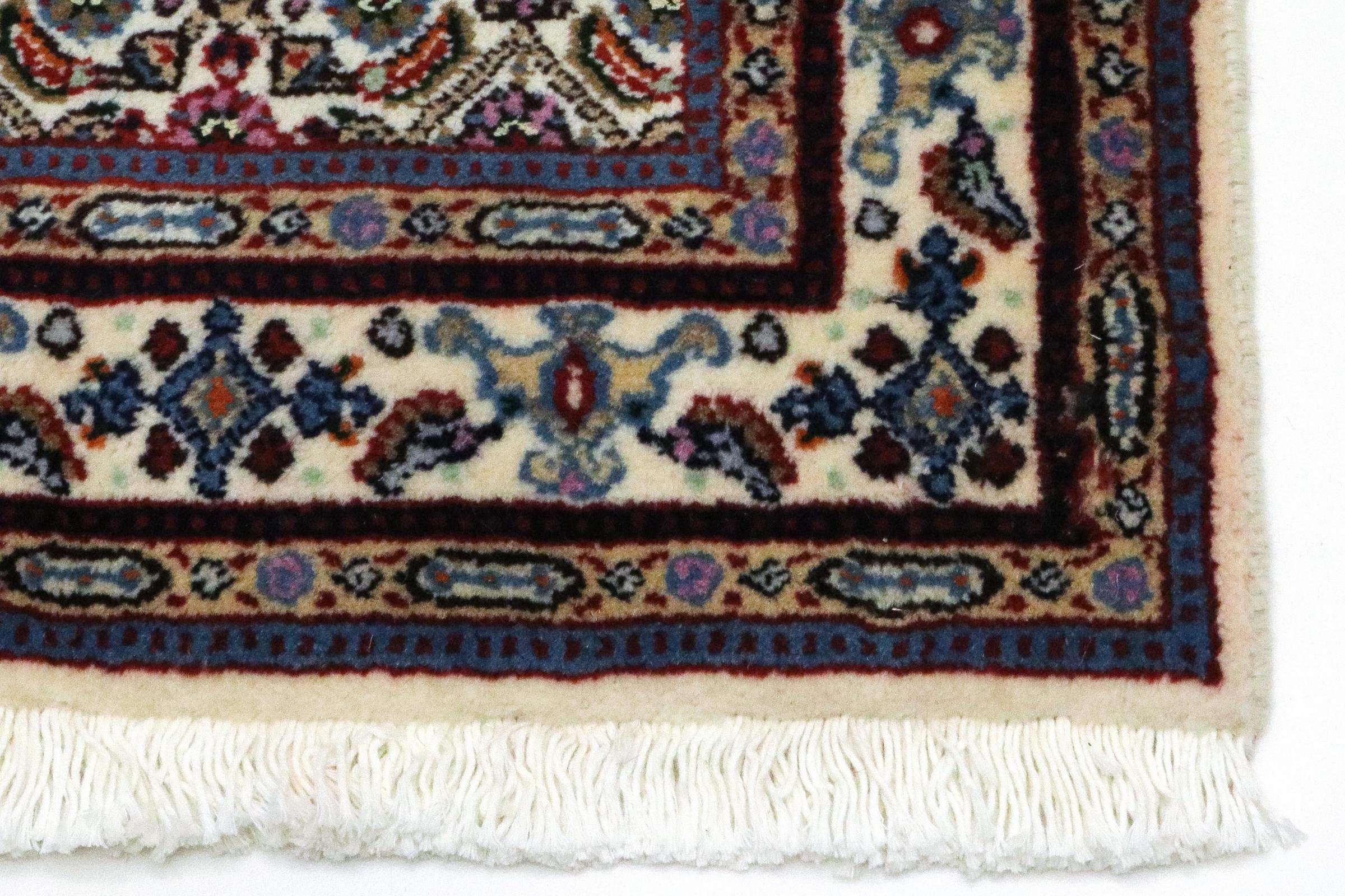 Este tapete de Moud, uma cidade situada 300 km a sul de Mashhad, impressiona à primeira vista. O padrão típico Herati ou desenho de jardim é apreciado por conhecedores e amantes de tapetes persas genuínos. Se procura um tapete feito à mão de excelente qualidade com um design muito distinto e caraterístico, está absolutamente certo com este tipo de tapete.