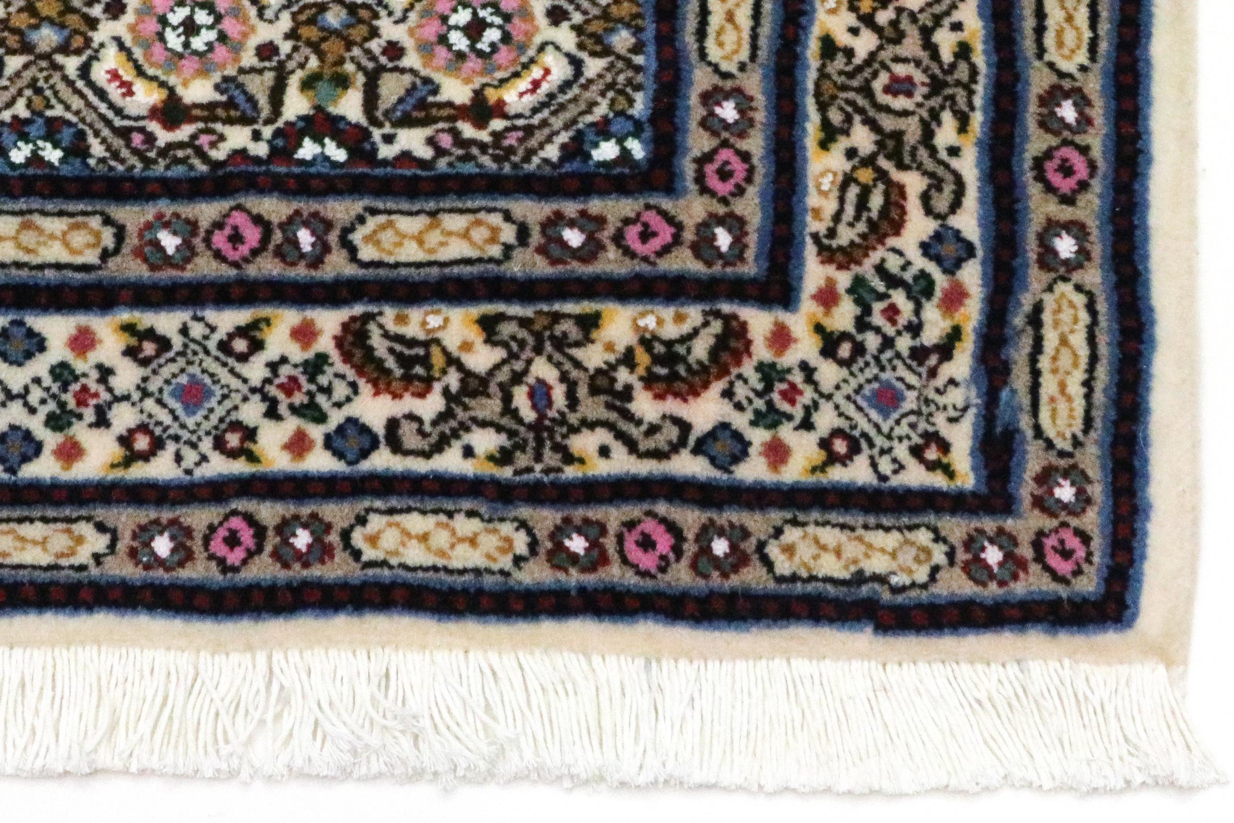 Este tapete de Moud, uma cidade situada 300 km a sul de Mashhad, impressiona à primeira vista. O padrão típico Herati ou desenho de jardim é apreciado por conhecedores e amantes de tapetes persas genuínos. Se procura um tapete feito à mão de excelente qualidade com um design muito distinto e caraterístico, está absolutamente certo com este tipo de tapete.