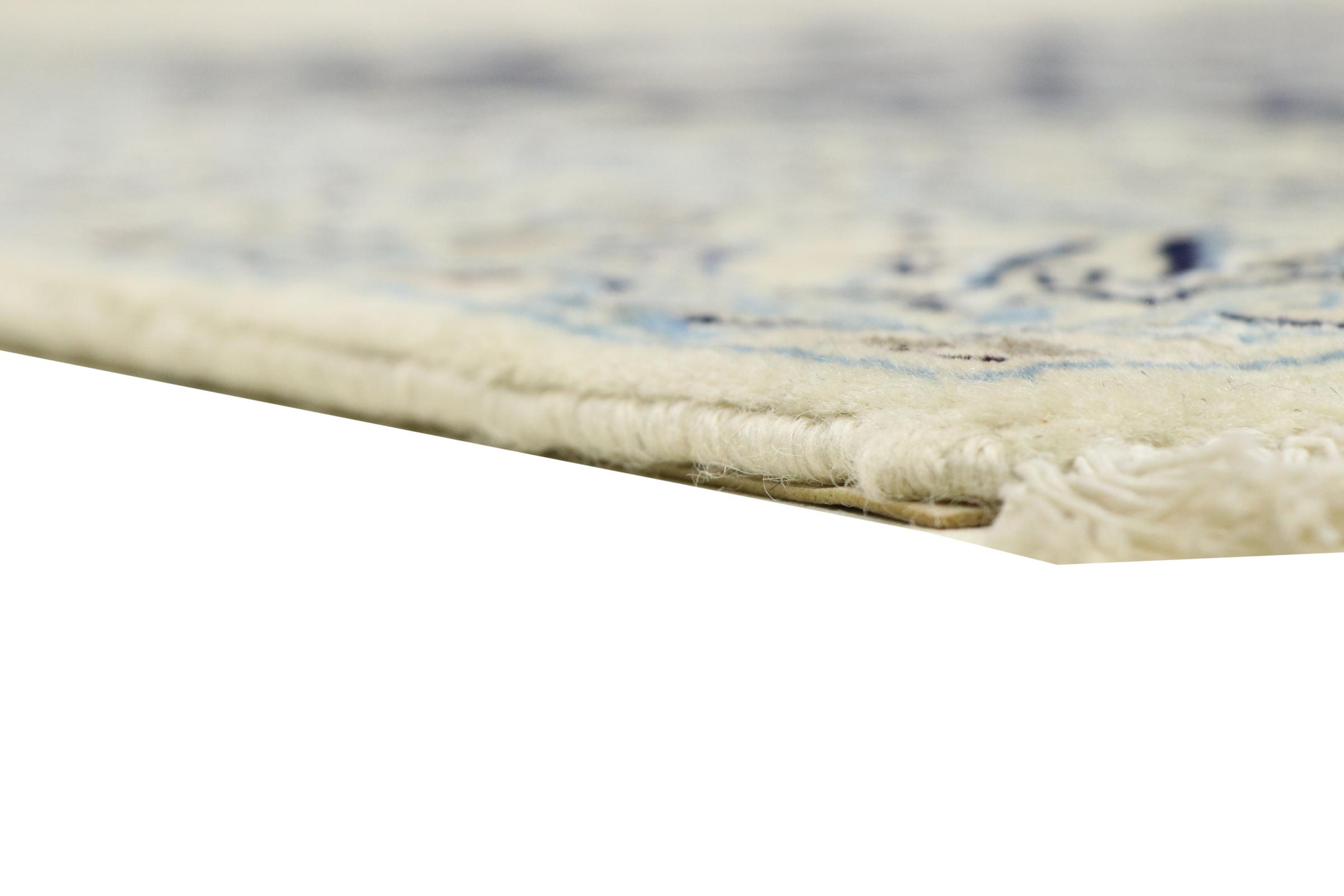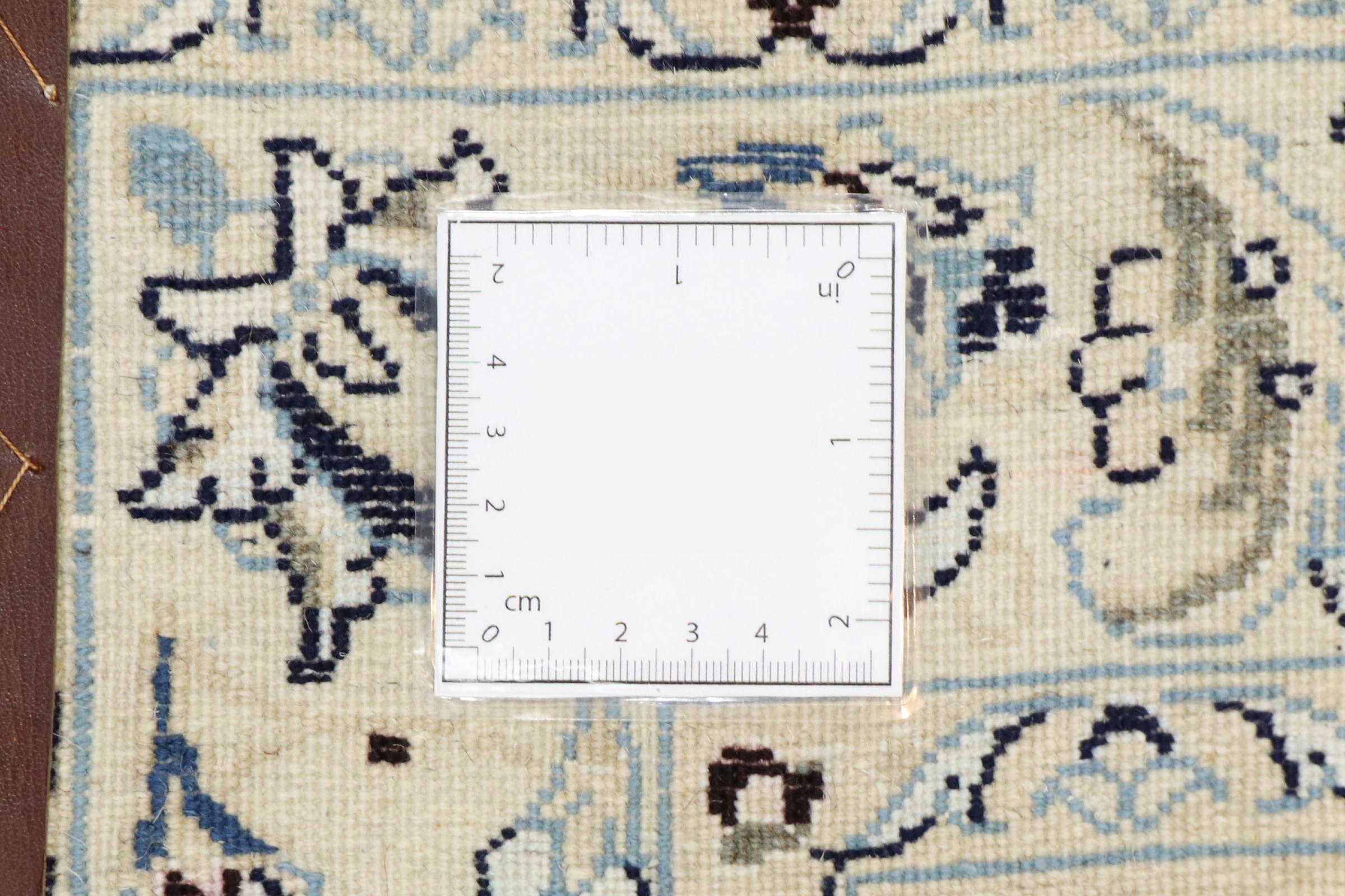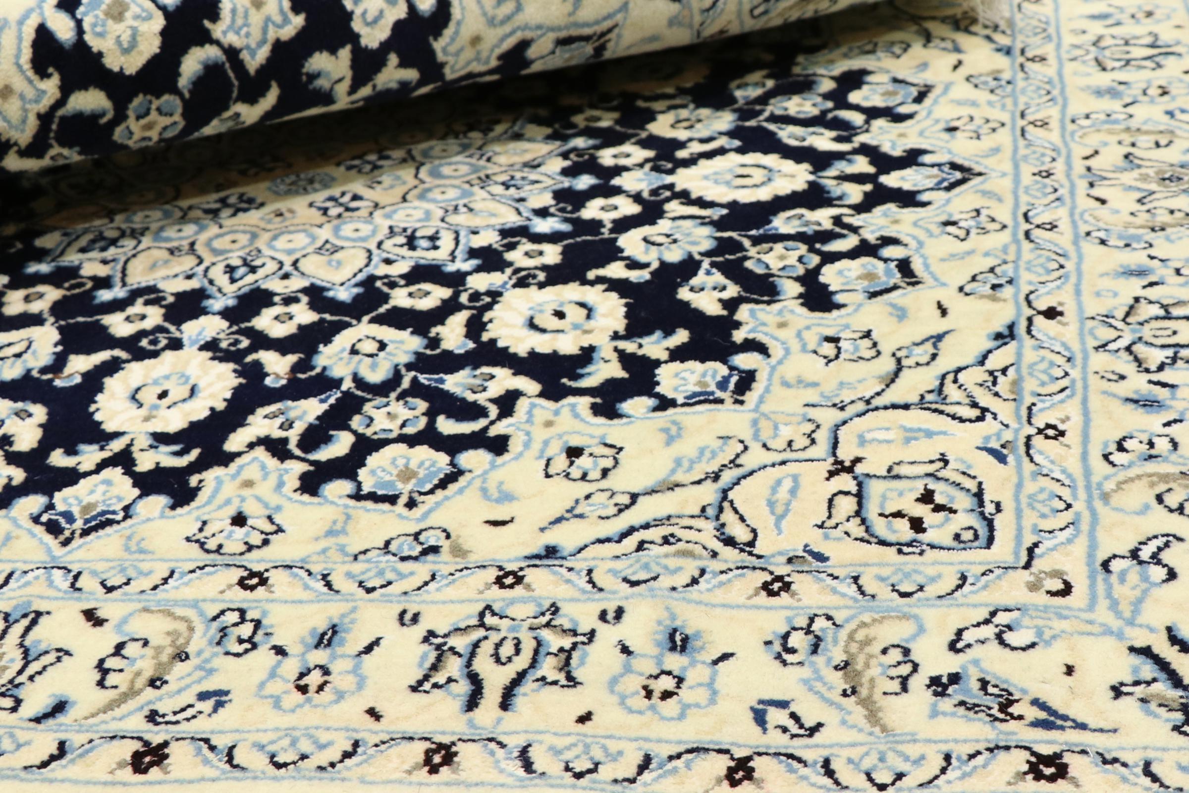 Este tapete Nain é classificado como 9La. A excelente qualidade e o belo desenho oriental com os seus padrões curvilíneos farão as delícias de qualquer comprador. Este tapete persa foi feito à mão na cidade de Nain, que fica na extremidade ocidental do deserto de Dasht-e-Kavir, a partir de lã de alta qualidade e seda natural. 9La Nain são claramente mais finos do que um 12La e já mostram belos detalhes.