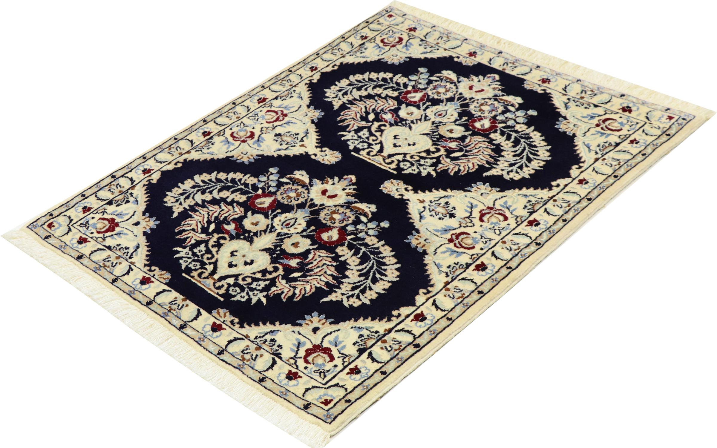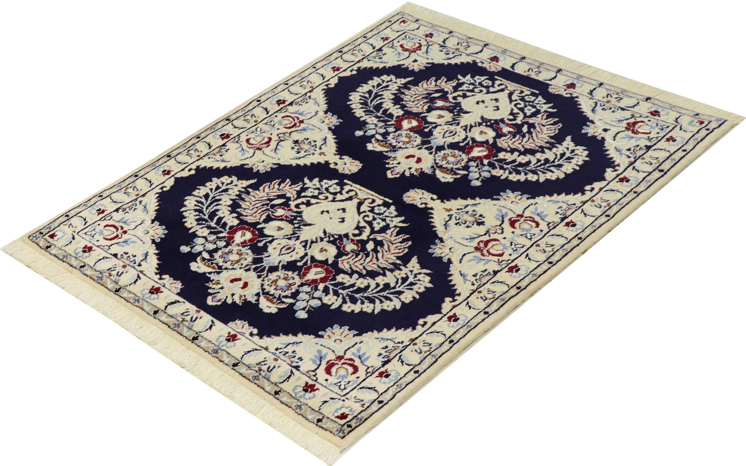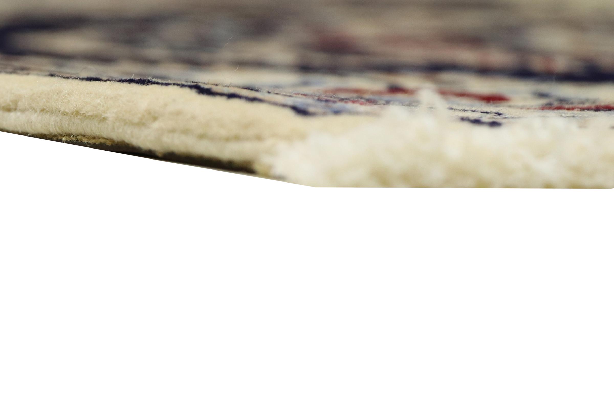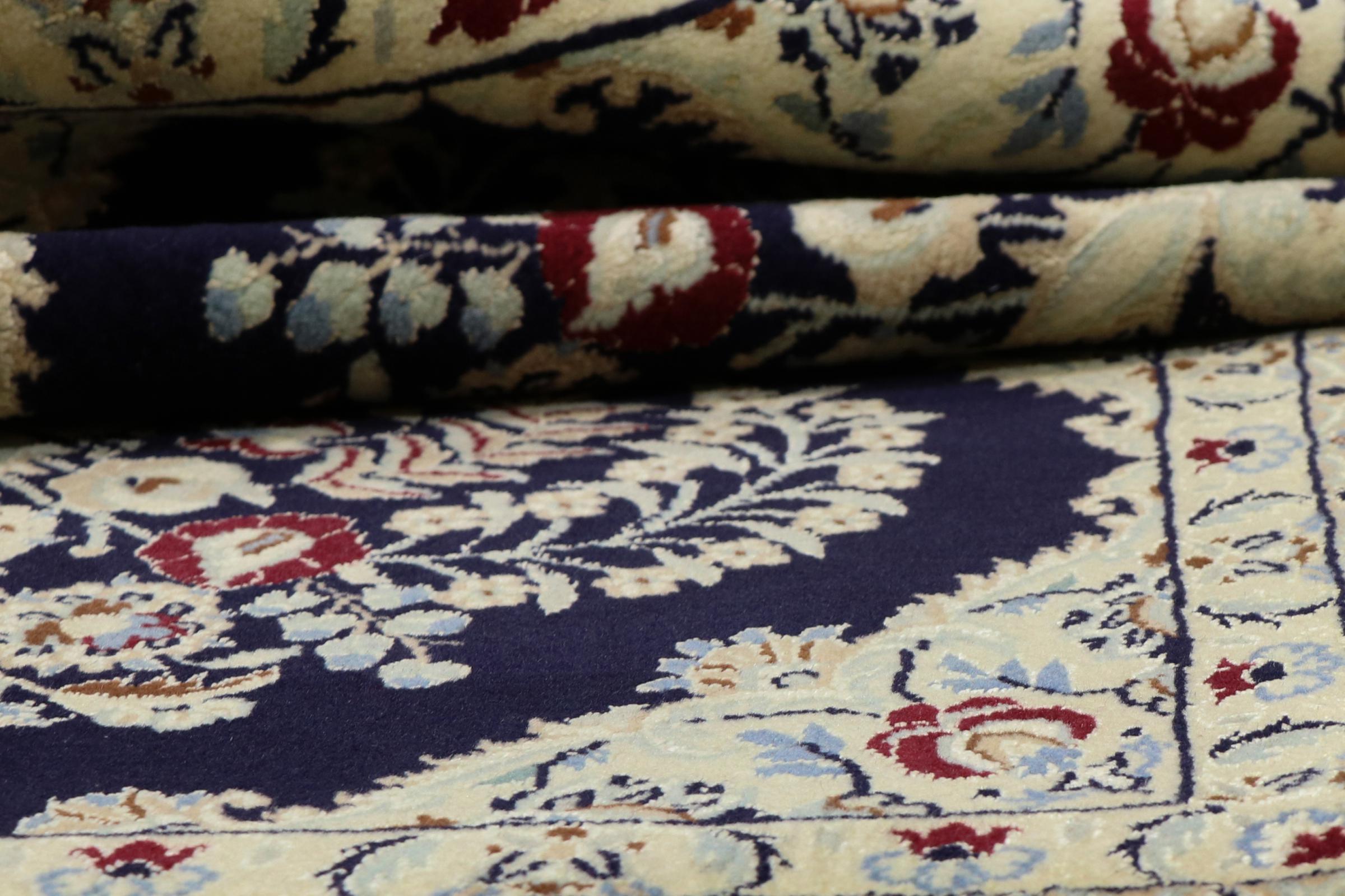 Este tapete Nain é classificado como 9La. A excelente qualidade e o belo desenho oriental com os seus padrões curvilíneos farão as delícias de qualquer comprador. Este tapete persa foi feito à mão na cidade de Nain, que fica na extremidade ocidental do deserto de Dasht-e-Kavir, a partir de lã de alta qualidade e seda natural. 9La Nain são claramente mais finos do que um 12La e já mostram belos detalhes.