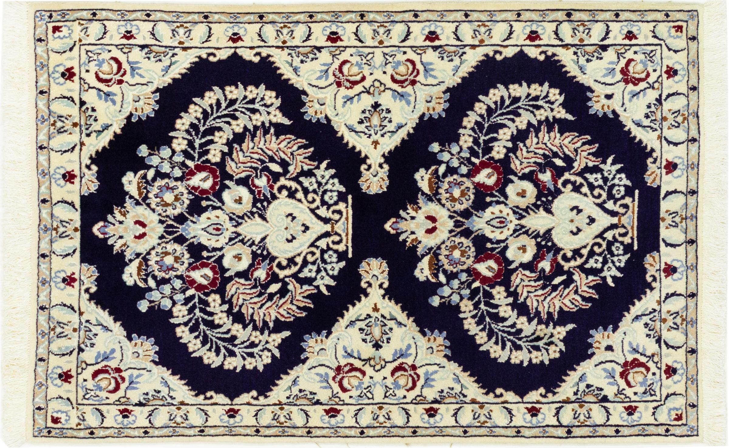 Nº do Tapete: 303471002074001 Tamanho: 110x71 cm Espessura: aproximadamente 5 mm Nós: 640 000 / m² Processamento: Atado à mão Veludo: Lã de cortiça com seda Urdidura: Algodão Origem: Pérsia / Iran Idade: Novo Peso: aproximadamente 3 kg Em armazém: Único - Apenas 1 em stock