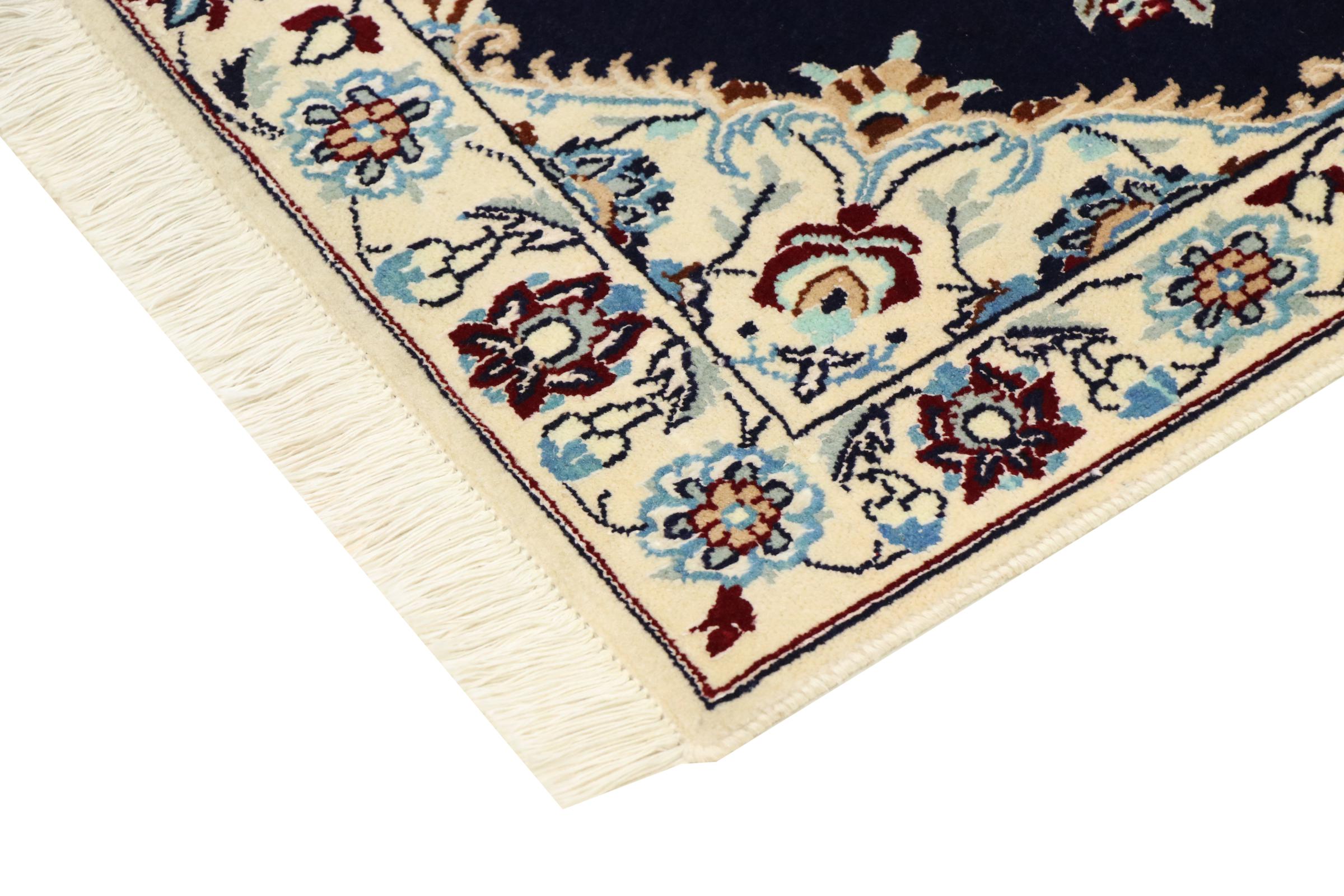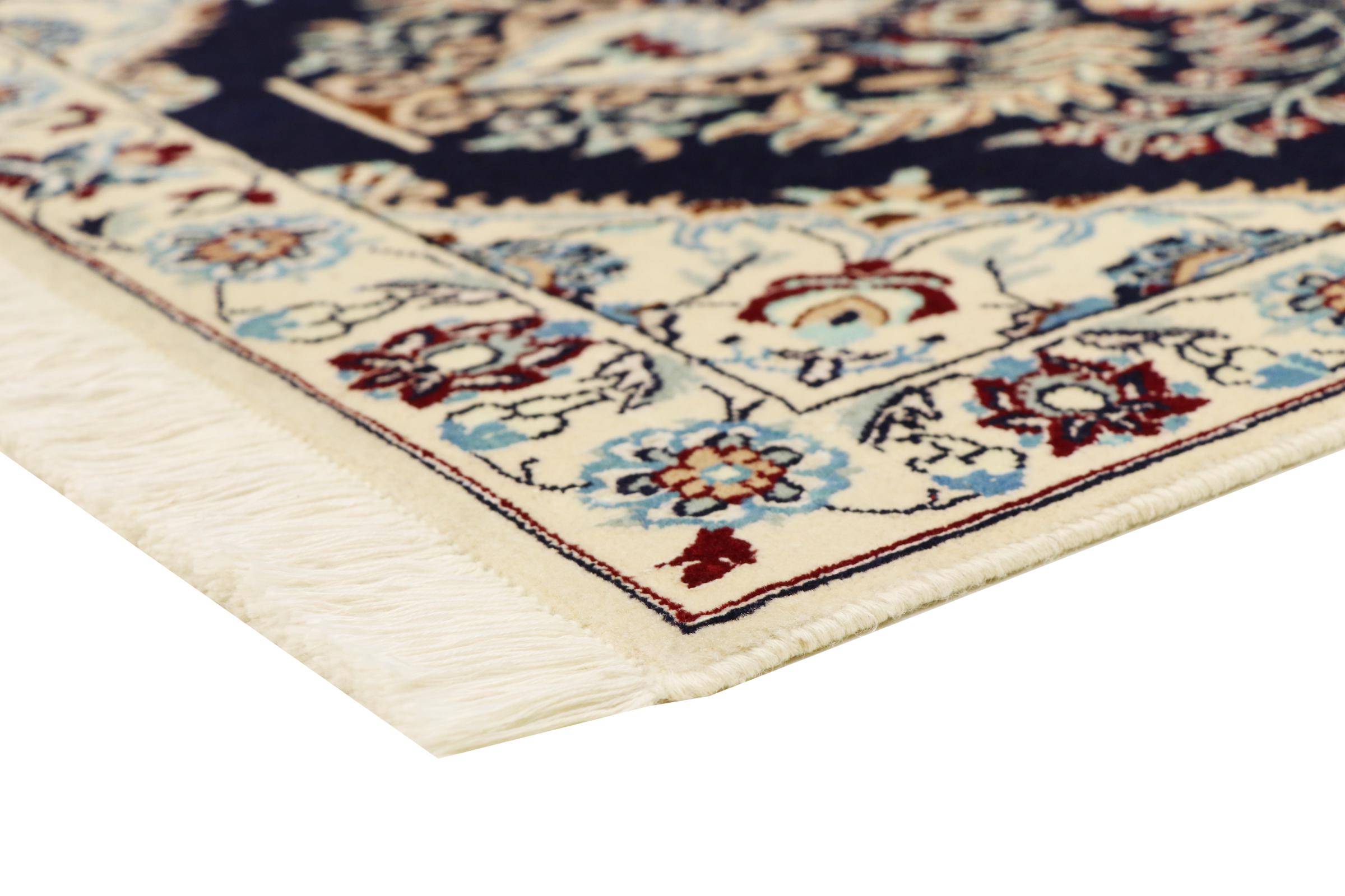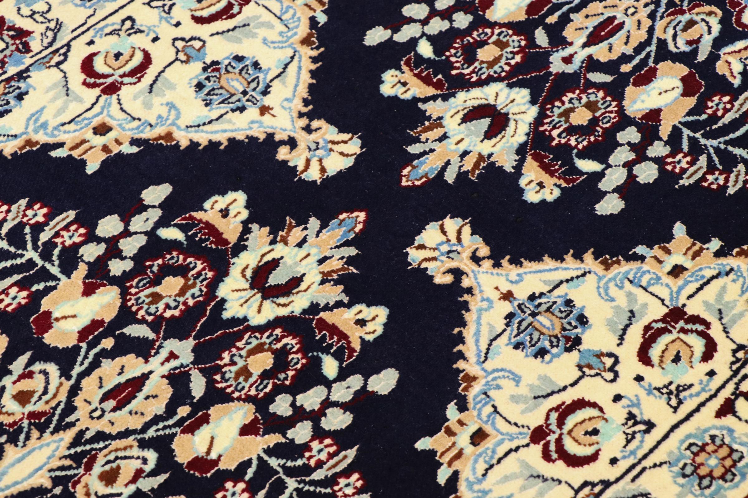 Este tapete Nain é classificado como 9La. A excelente qualidade e o belo desenho oriental com os seus padrões curvilíneos farão as delícias de qualquer comprador. Este tapete persa foi feito à mão na cidade de Nain, que fica na extremidade ocidental do deserto de Dasht-e-Kavir, a partir de lã de alta qualidade e seda natural. 9La Nain são claramente mais finos do que um 12La e já mostram belos detalhes.