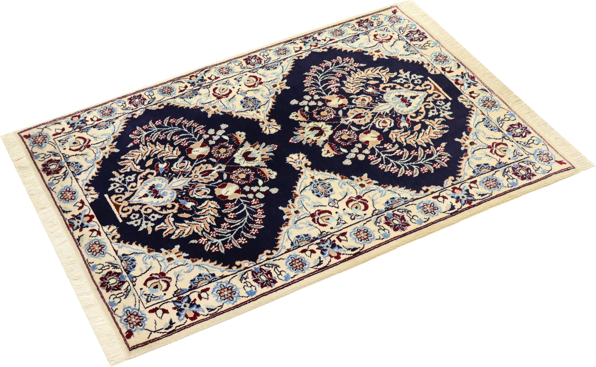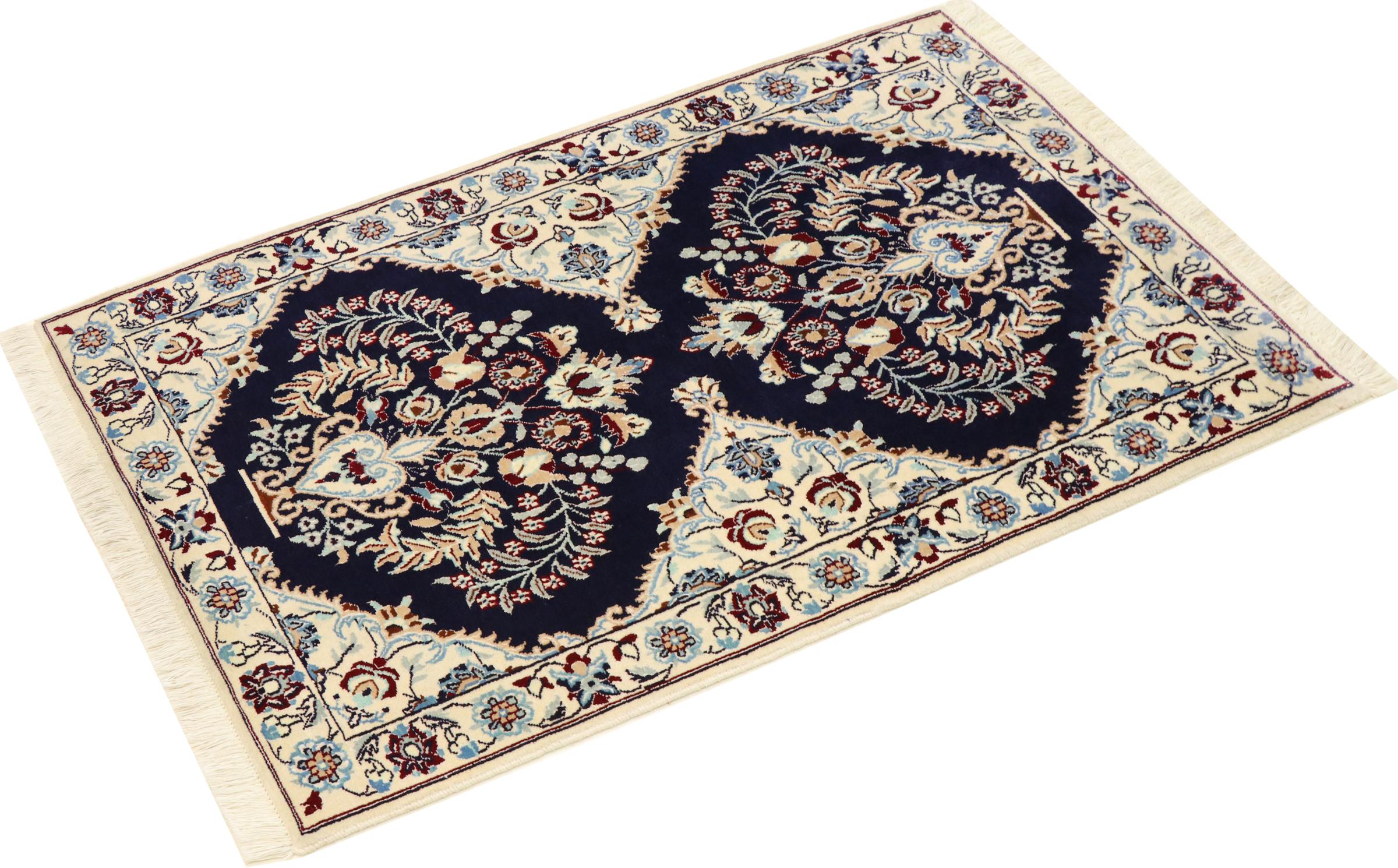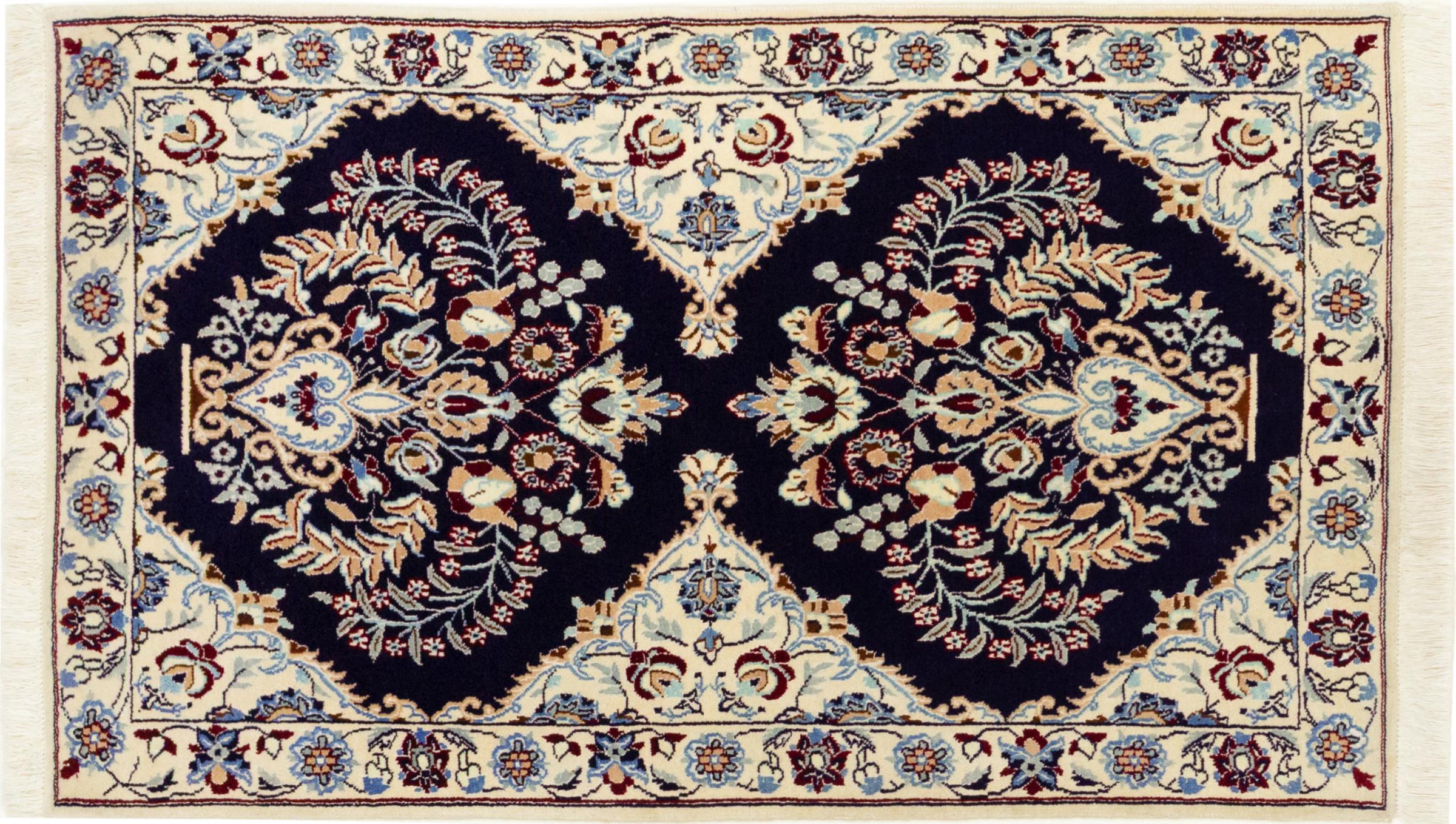 Este tapete Nain é classificado como 9La. A excelente qualidade e o belo desenho oriental com os seus padrões curvilíneos farão as delícias de qualquer comprador. Este tapete persa foi feito à mão na cidade de Nain, que fica na extremidade ocidental do deserto de Dasht-e-Kavir, a partir de lã de alta qualidade e seda natural. 9La Nain são claramente mais finos do que um 12La e já mostram belos detalhes.