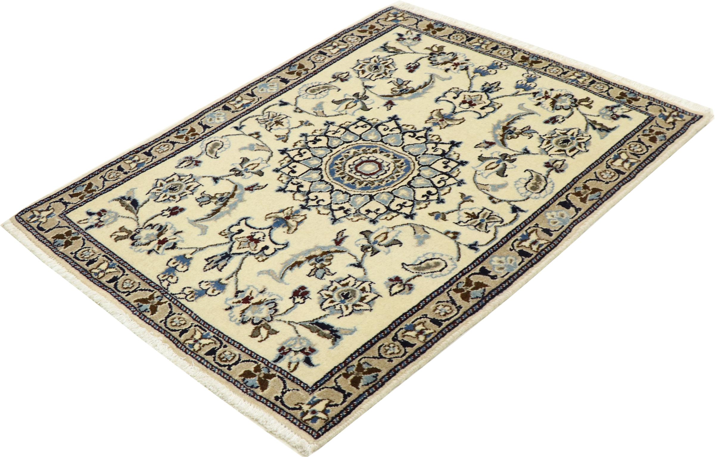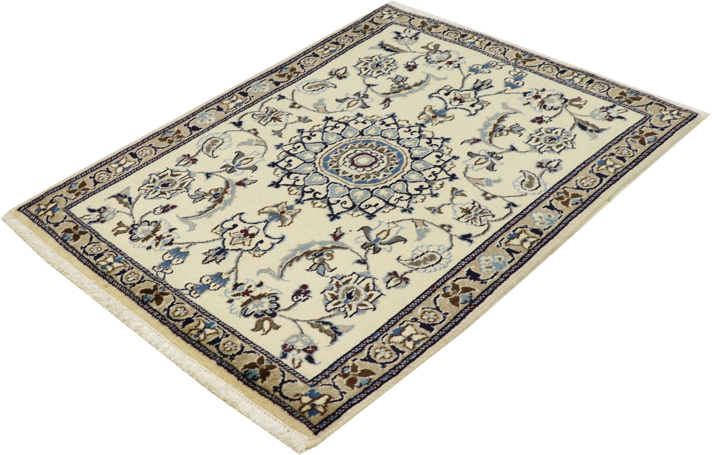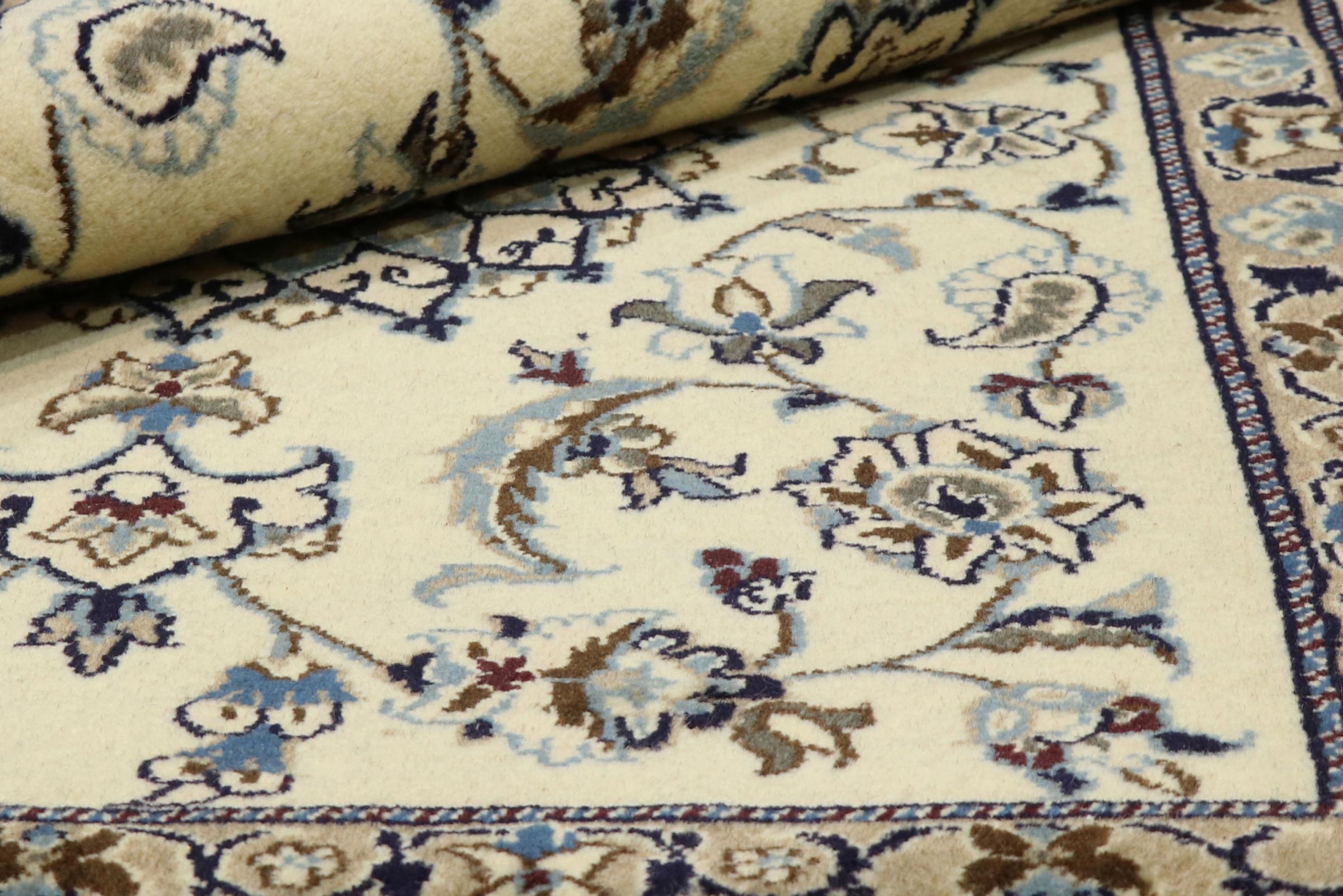 Este tapete Nain é classificado como 12La. Apresenta um aspecto elegante e requintado com a sua coloração típica Naín. Este tapete persa foi feito à mão na cidade de Nain, localizada no extremo oeste do deserto Dasht-e-Kavir, com lã de alta qualidade e seda natural. Com tamanho 12La, não é tão detalhado com ornamentação quanto 9La ou 6La Nain.