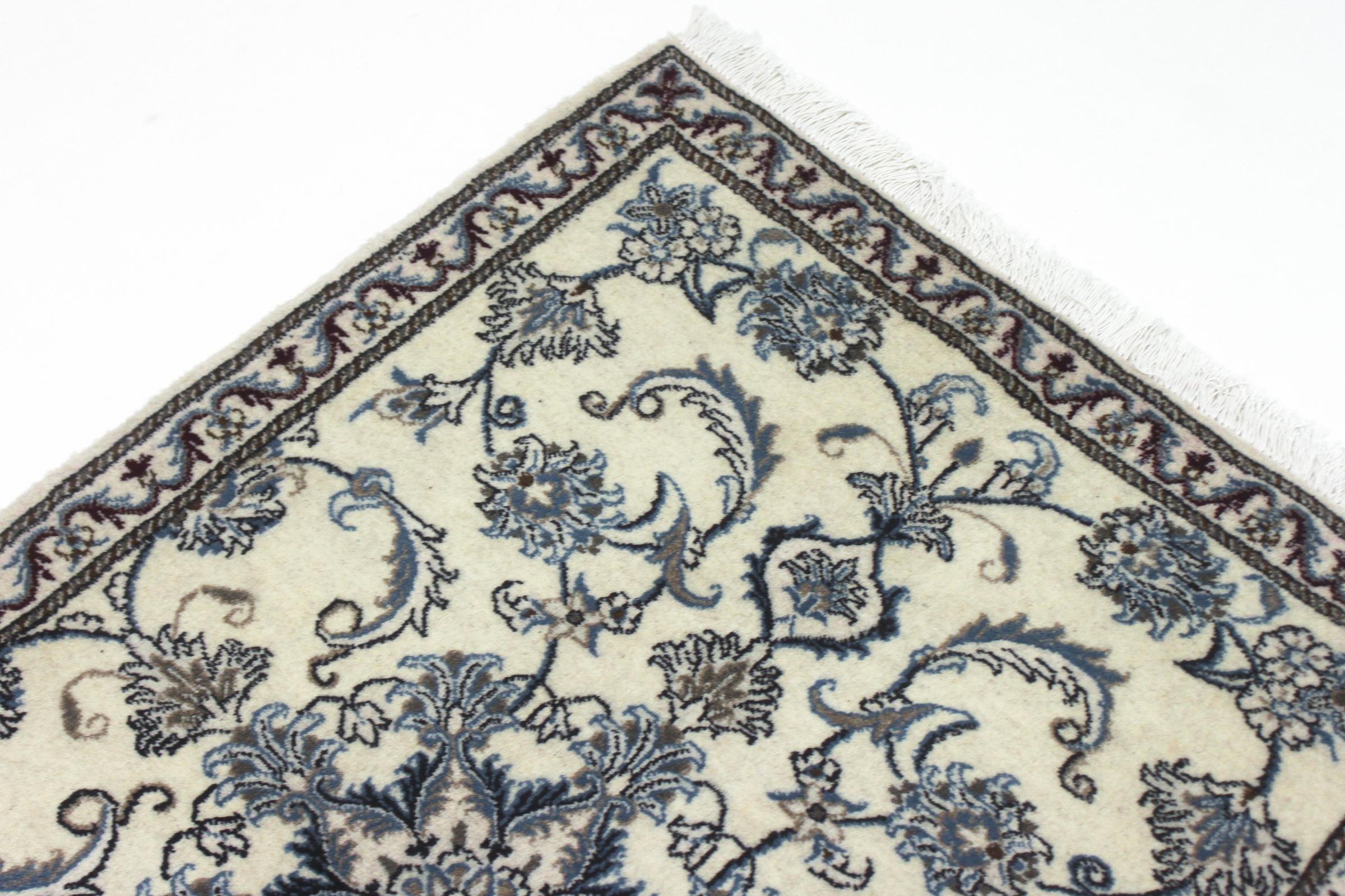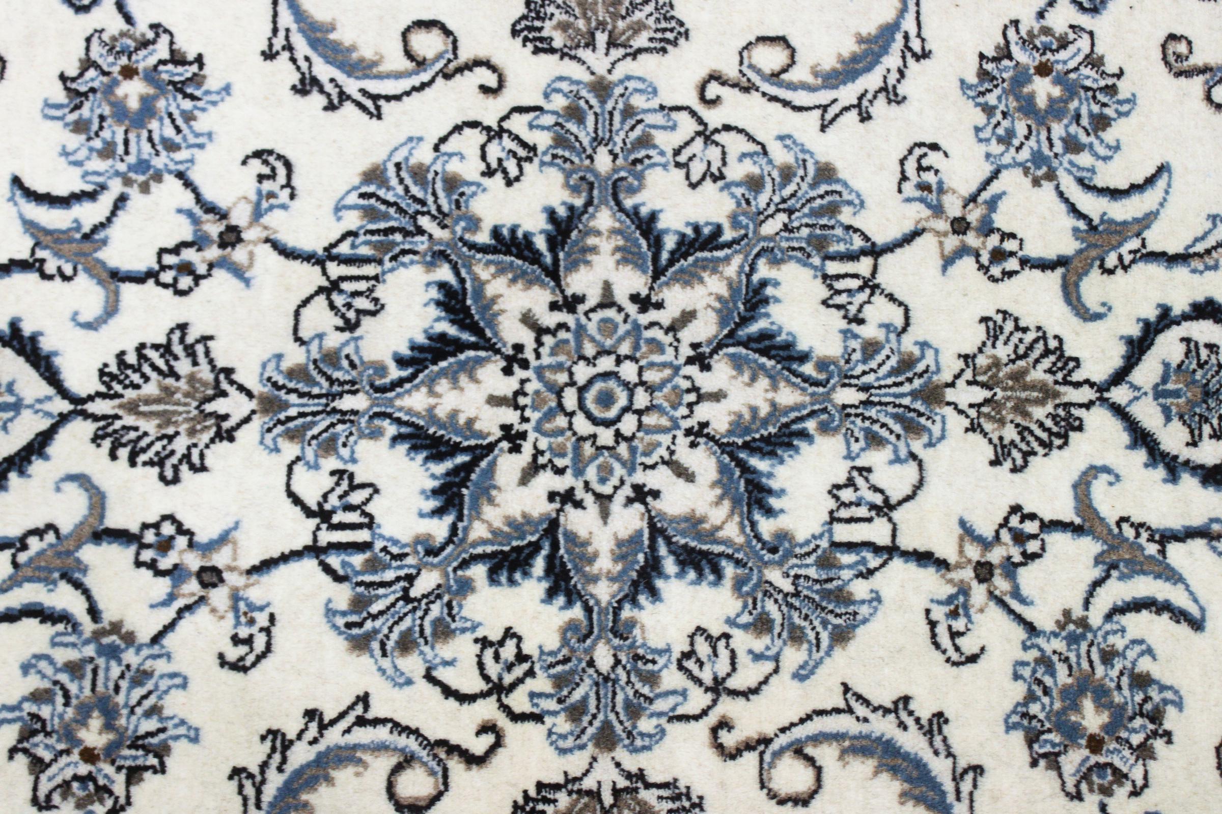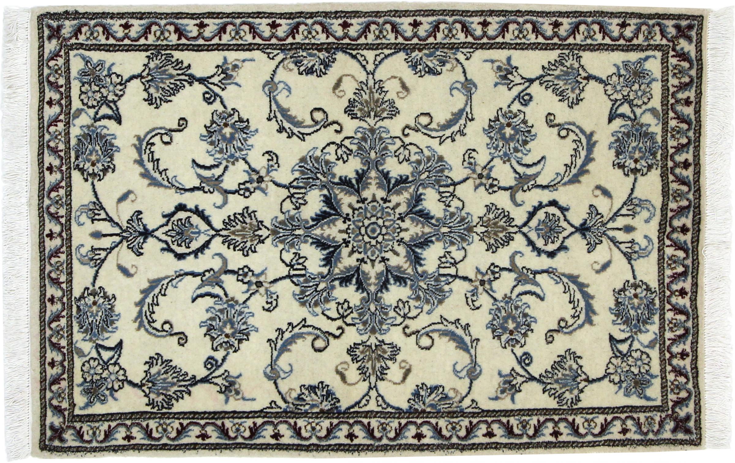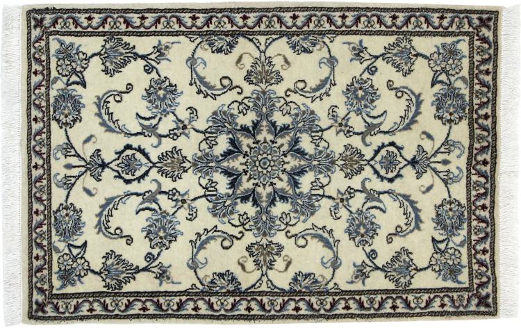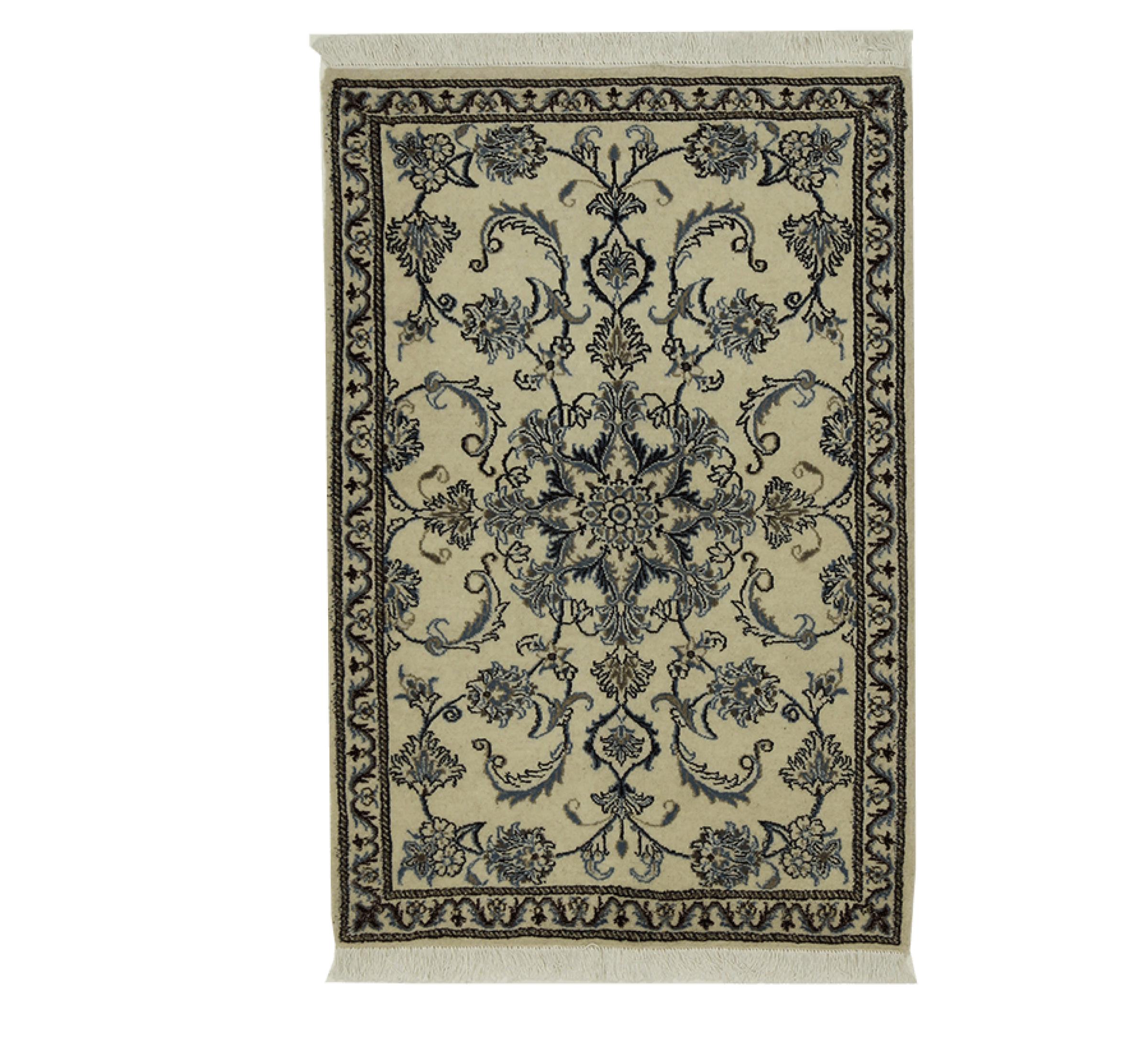 Este tapete Nain é classificado como 12La. Apresenta um aspecto elegante e requintado com a sua coloração típica Naín. Este tapete persa foi feito à mão na cidade de Nain, localizada no extremo oeste do deserto Dasht-e-Kavir, com lã de alta qualidade e seda natural. Com tamanho 12La, não é tão detalhado com ornamentação quanto 9La ou 6La Nain.