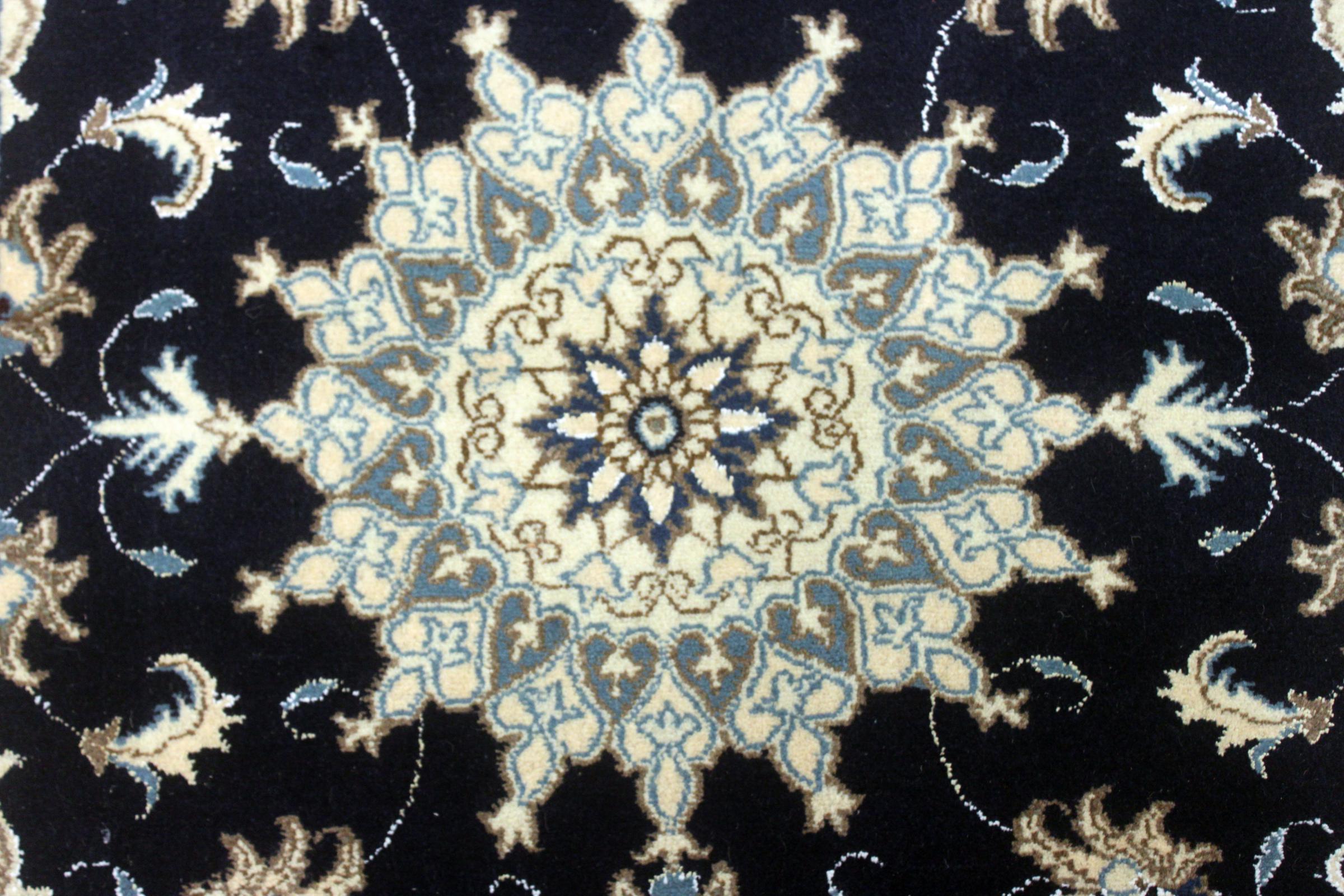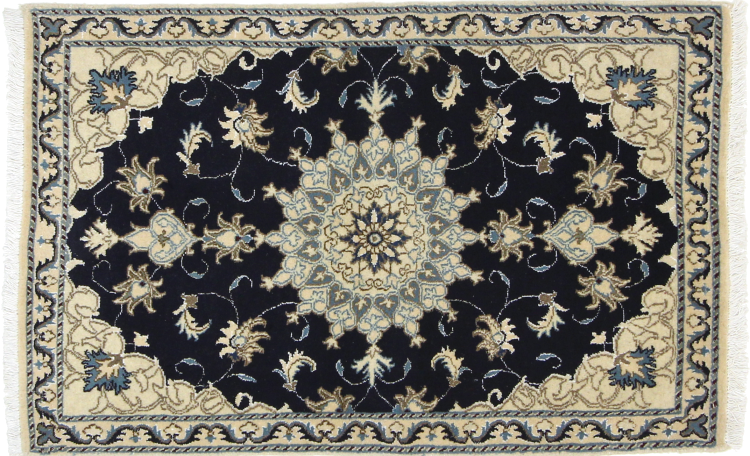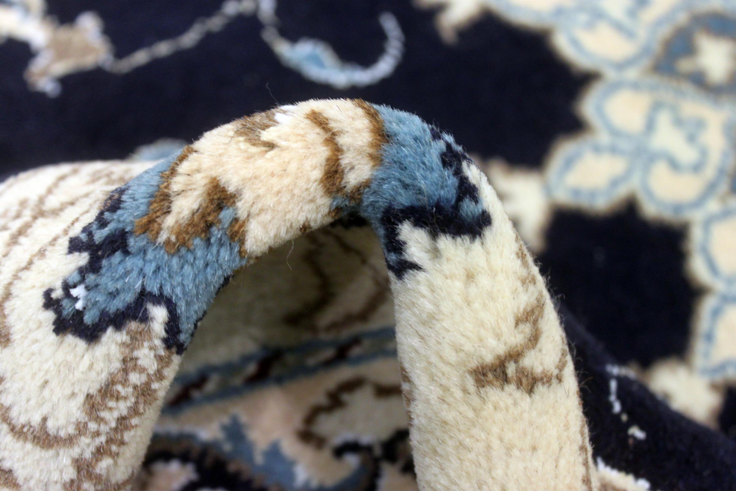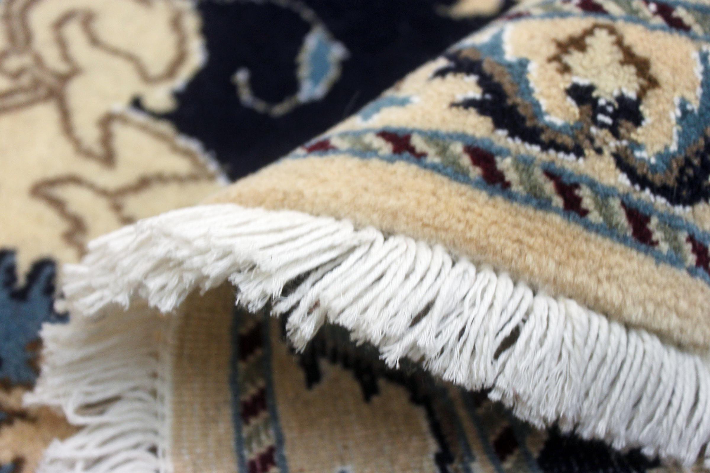 Este tapete Nain é classificado como 12La. Apresenta um aspecto elegante e requintado com a sua coloração típica Naín. Este tapete persa foi feito à mão na cidade de Nain, localizada no extremo oeste do deserto Dasht-e-Kavir, com lã de alta qualidade e seda natural. Com tamanho 12La, não é tão detalhado com ornamentação quanto 9La ou 6La Nain.