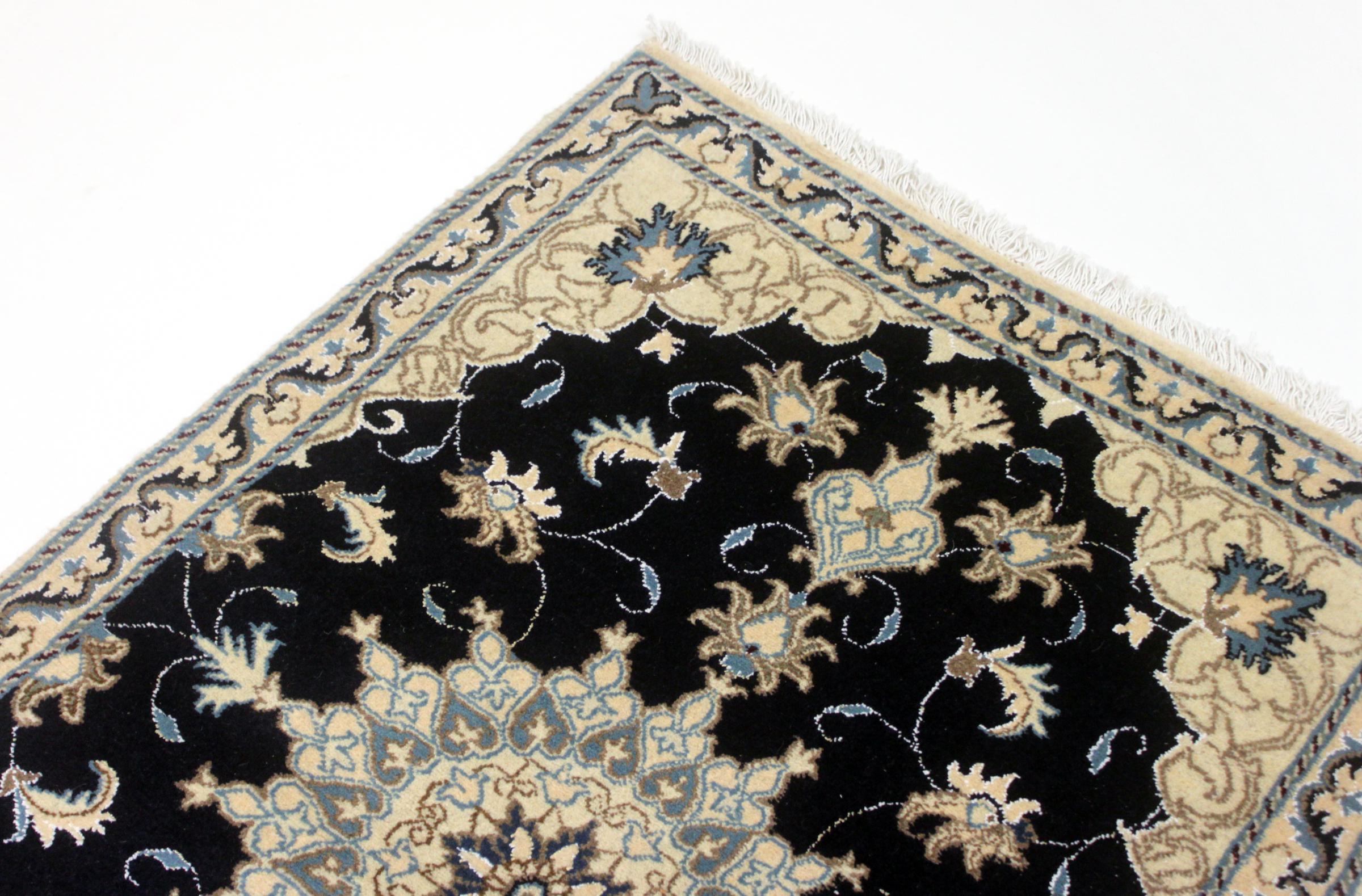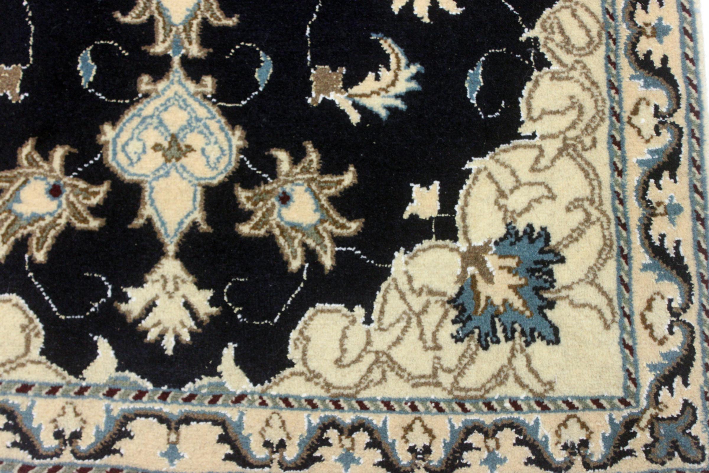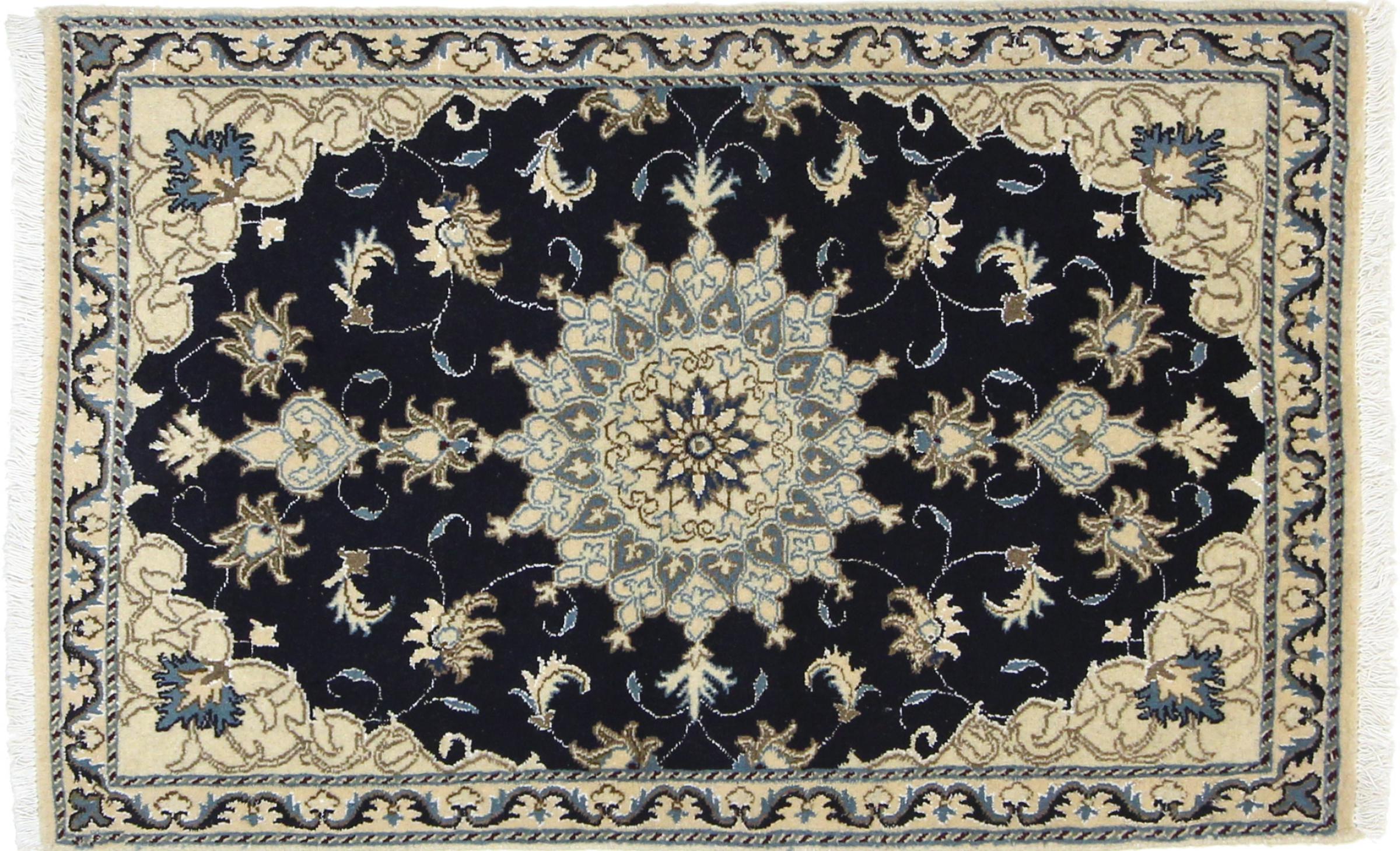 Este tapete Nain é classificado como 12La. Apresenta um aspecto elegante e requintado com a sua coloração típica Naín. Este tapete persa foi feito à mão na cidade de Nain, localizada no extremo oeste do deserto Dasht-e-Kavir, com lã de alta qualidade e seda natural. Com tamanho 12La, não é tão detalhado com ornamentação quanto 9La ou 6La Nain.