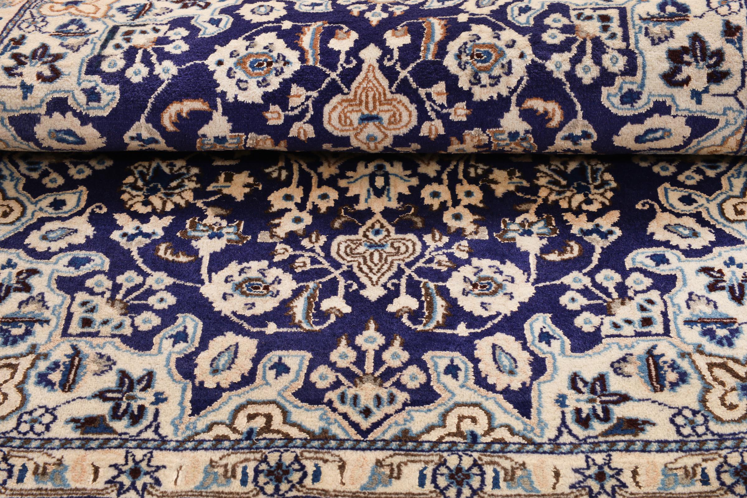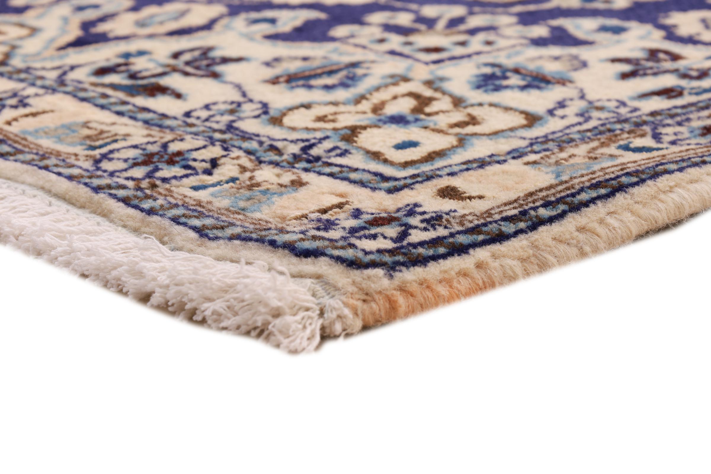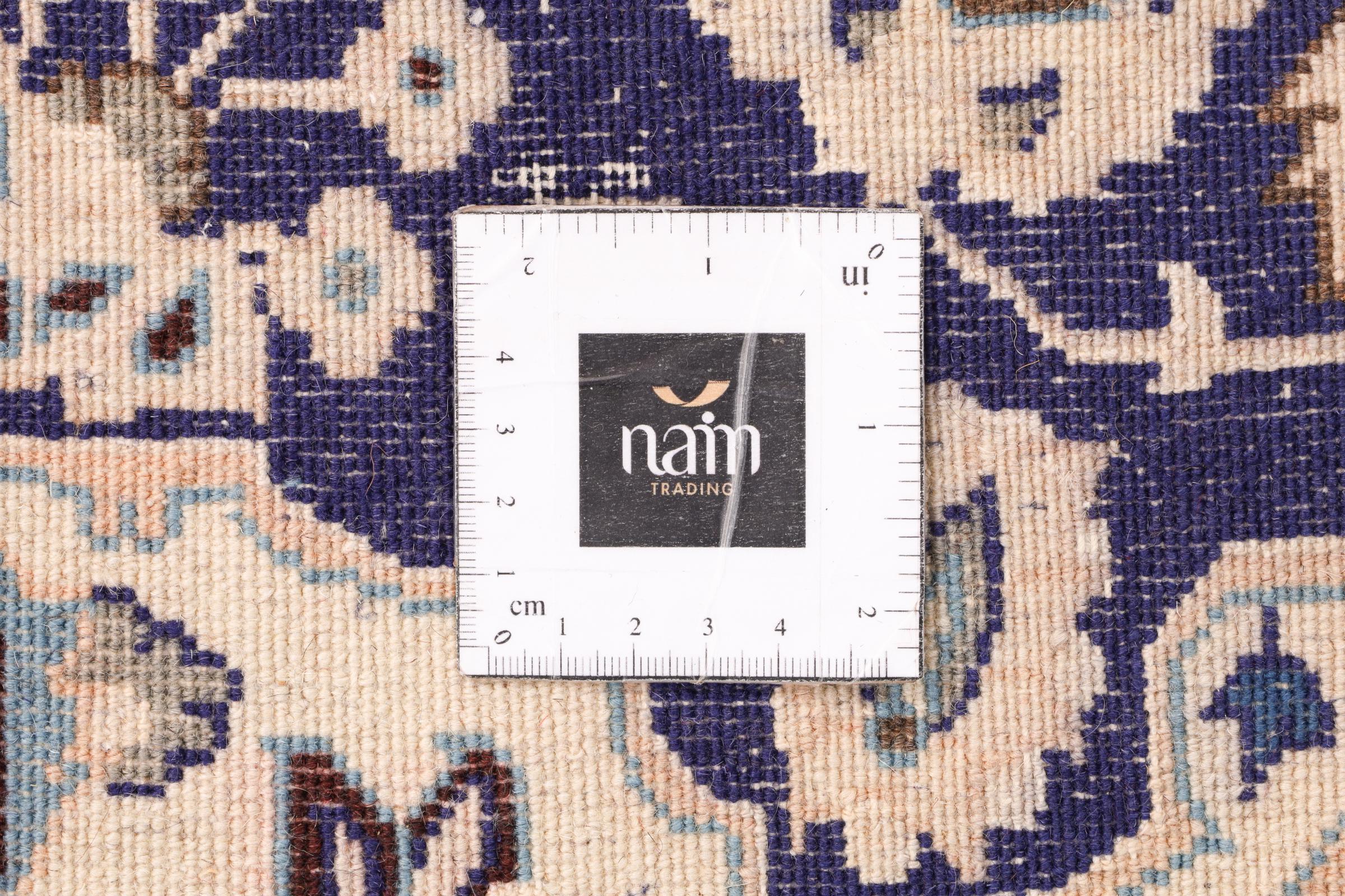 Este tapete Nain é classificado como 9La. A excelente qualidade e o belo desenho oriental com os seus padrões curvilíneos farão as delícias de qualquer comprador. Este tapete persa foi feito à mão na cidade de Nain, que fica na extremidade ocidental do deserto de Dasht-e-Kavir, a partir de lã de alta qualidade e seda natural. 9La Nain são claramente mais finos do que um 12La e já mostram belos detalhes.