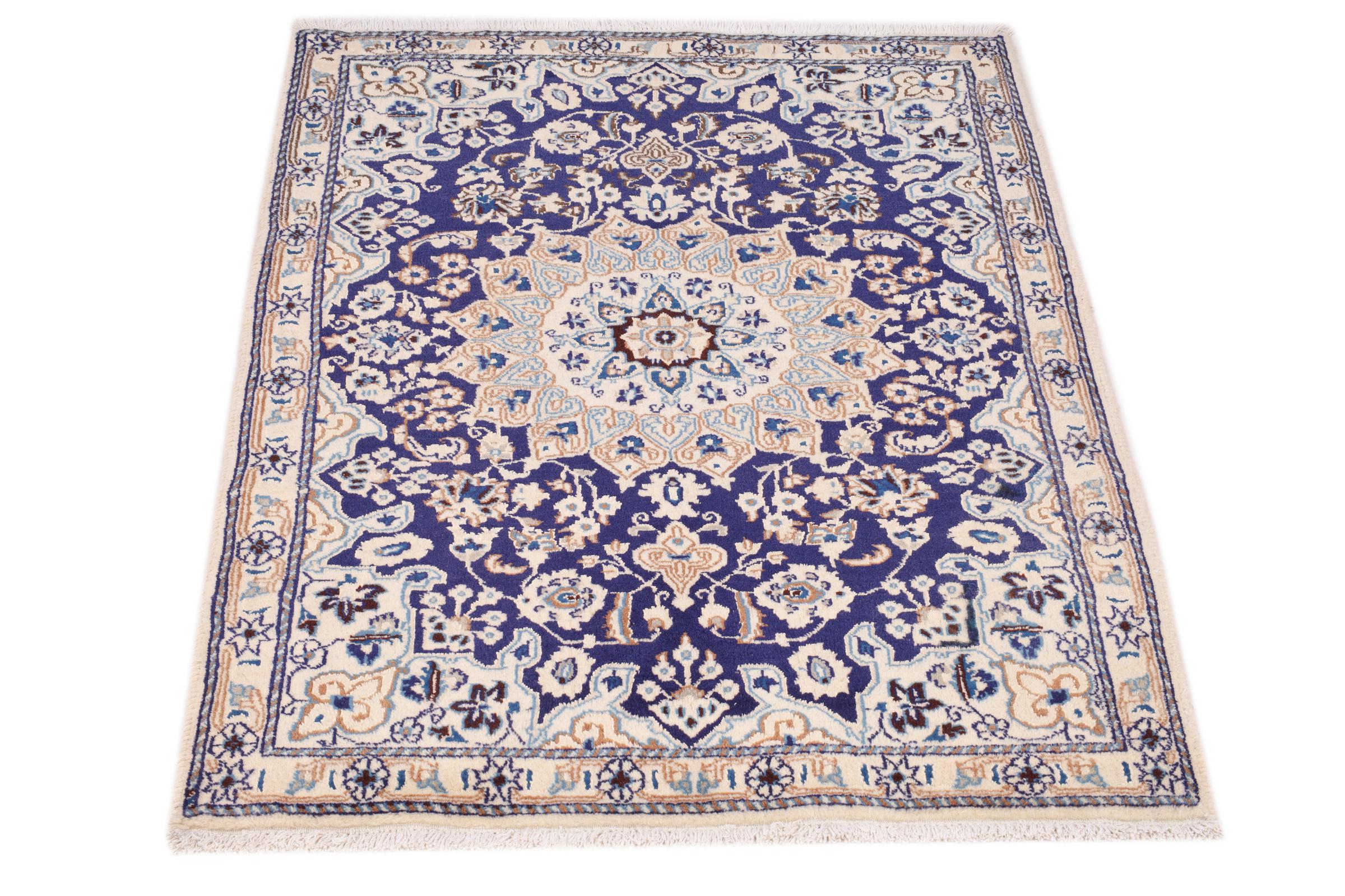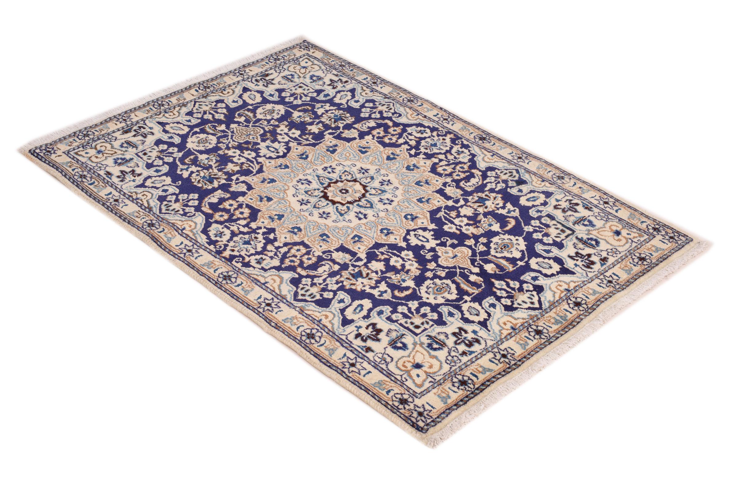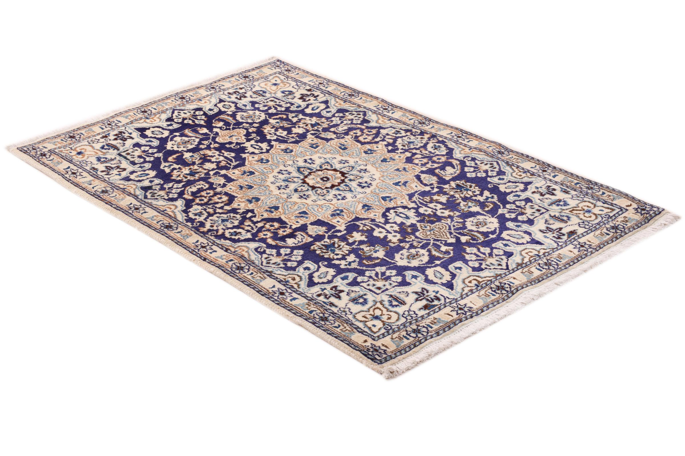 Este tapete Nain é classificado como 9La. A excelente qualidade e o belo desenho oriental com os seus padrões curvilíneos farão as delícias de qualquer comprador. Este tapete persa foi feito à mão na cidade de Nain, que fica na extremidade ocidental do deserto de Dasht-e-Kavir, a partir de lã de alta qualidade e seda natural. 9La Nain são claramente mais finos do que um 12La e já mostram belos detalhes.
