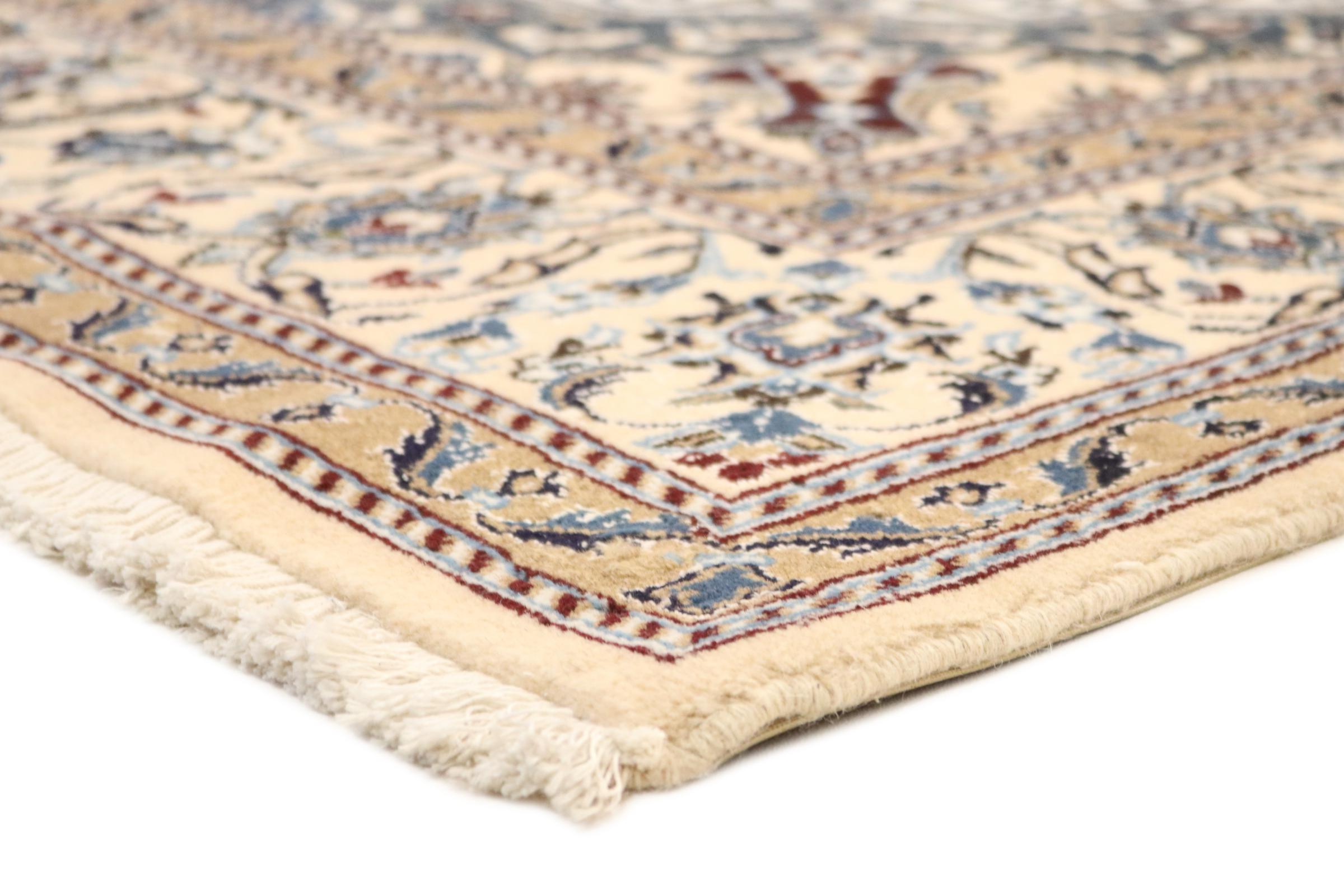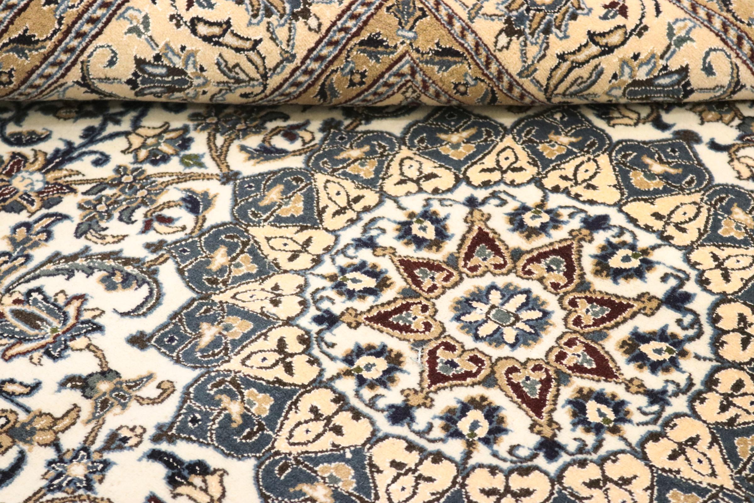 Este tapete Nain é classificado como 12La. Apresenta um aspecto elegante e requintado com a sua coloração típica Naín. Este tapete persa foi feito à mão na cidade de Nain, localizada no extremo oeste do deserto Dasht-e-Kavir, com lã de alta qualidade e seda natural. Com tamanho 12La, não é tão detalhado com ornamentação quanto 9La ou 6La Nain.