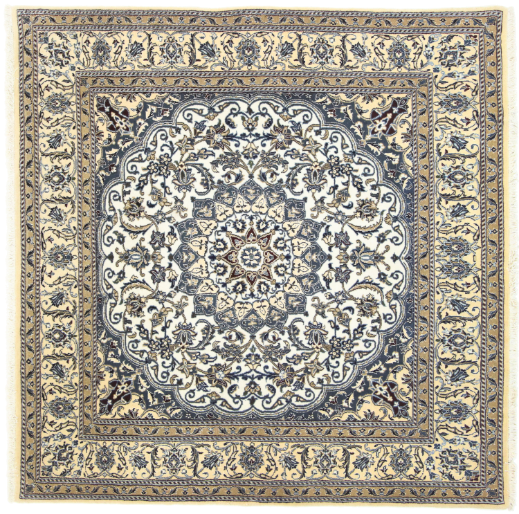 Nº do Tapete: 167926001509192 Tamanho: 197x199 cm Espessura: aproximadamente 12 mm Nós: 200 000 - 250 000 / m² Processamento: Atado à mão Veludo: Lã com seda Urdidura: Algodão Origem: Pérsia / Iran Idade: Novo Peso: aproximadamente 14 kg Em armazém: Único - Apenas 1 em stock