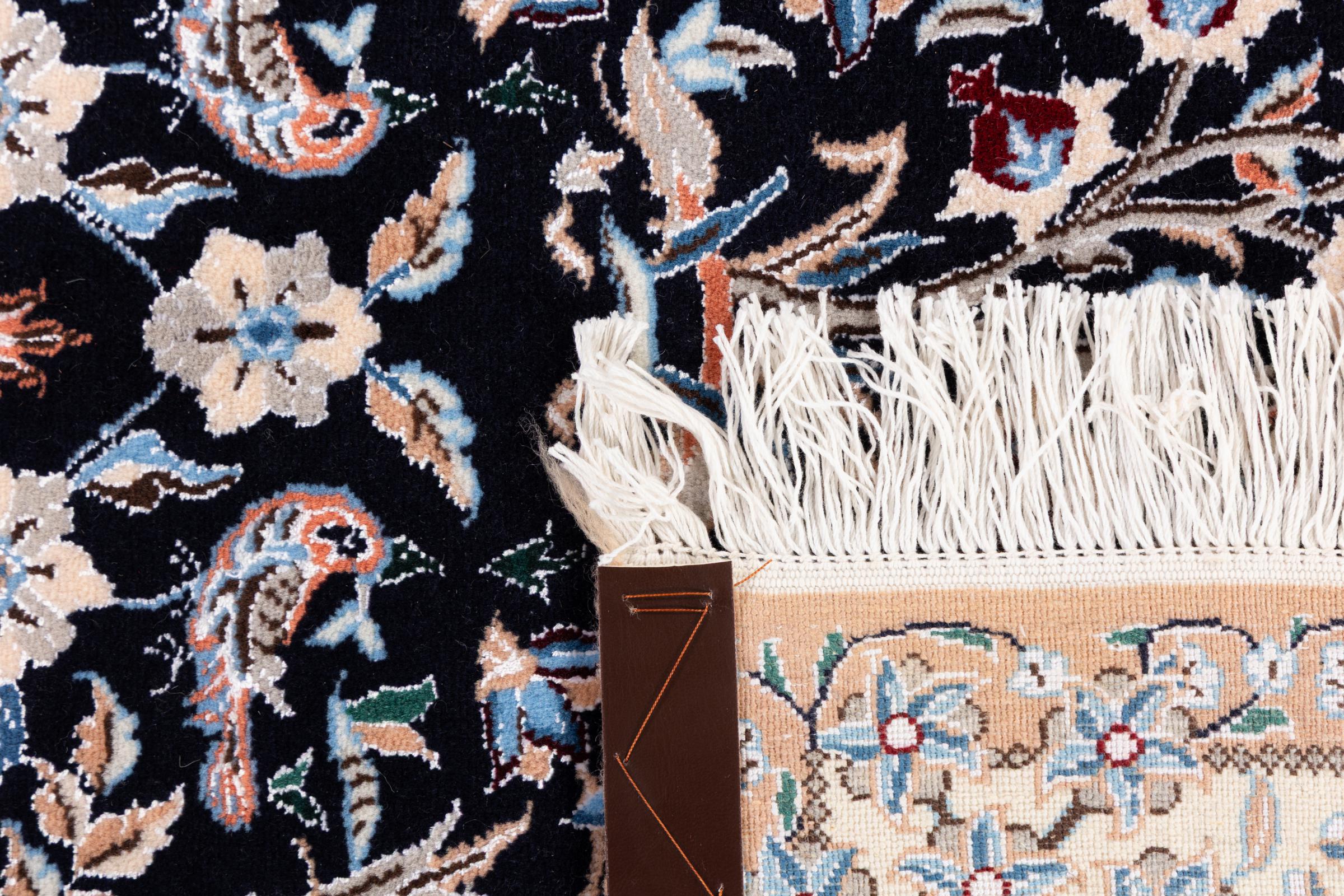 Este tapete Nain é classificado como 9La. A excelente qualidade e o belo desenho oriental com os seus padrões curvilíneos farão as delícias de qualquer comprador. Este tapete persa foi feito à mão na cidade de Nain, que fica na extremidade ocidental do deserto de Dasht-e-Kavir, a partir de lã de alta qualidade e seda natural. 9La Nain são claramente mais finos do que um 12La e já mostram belos detalhes.