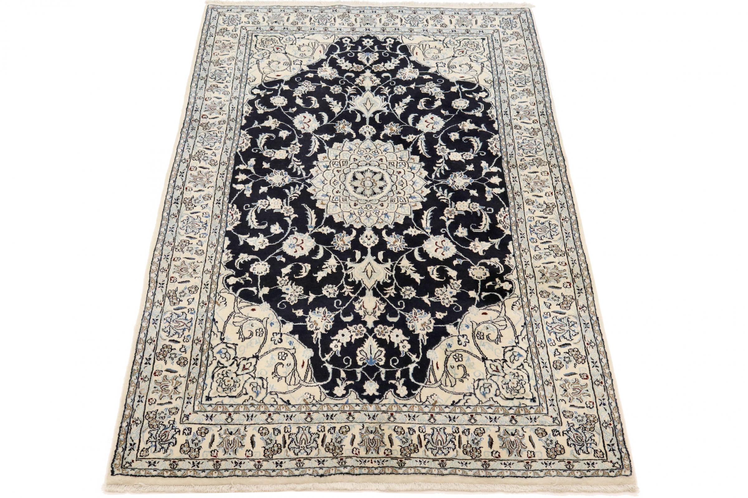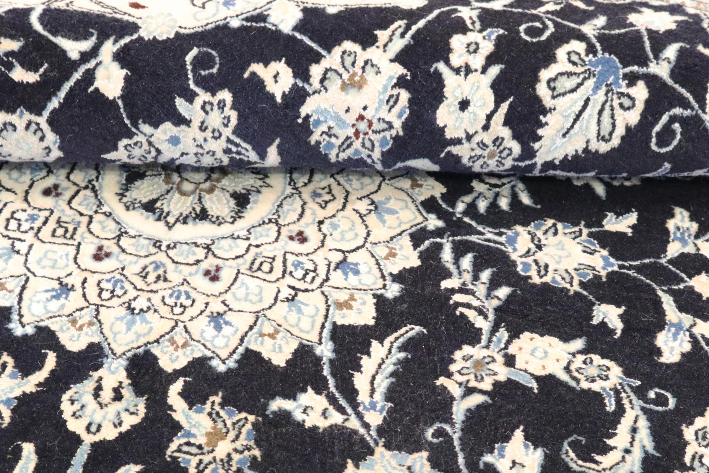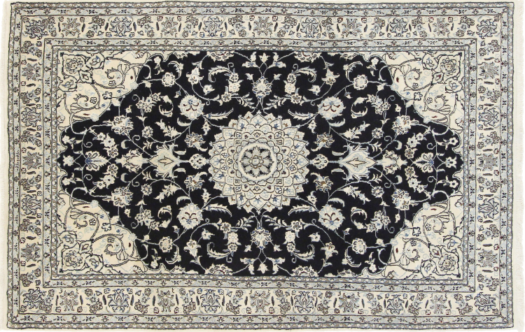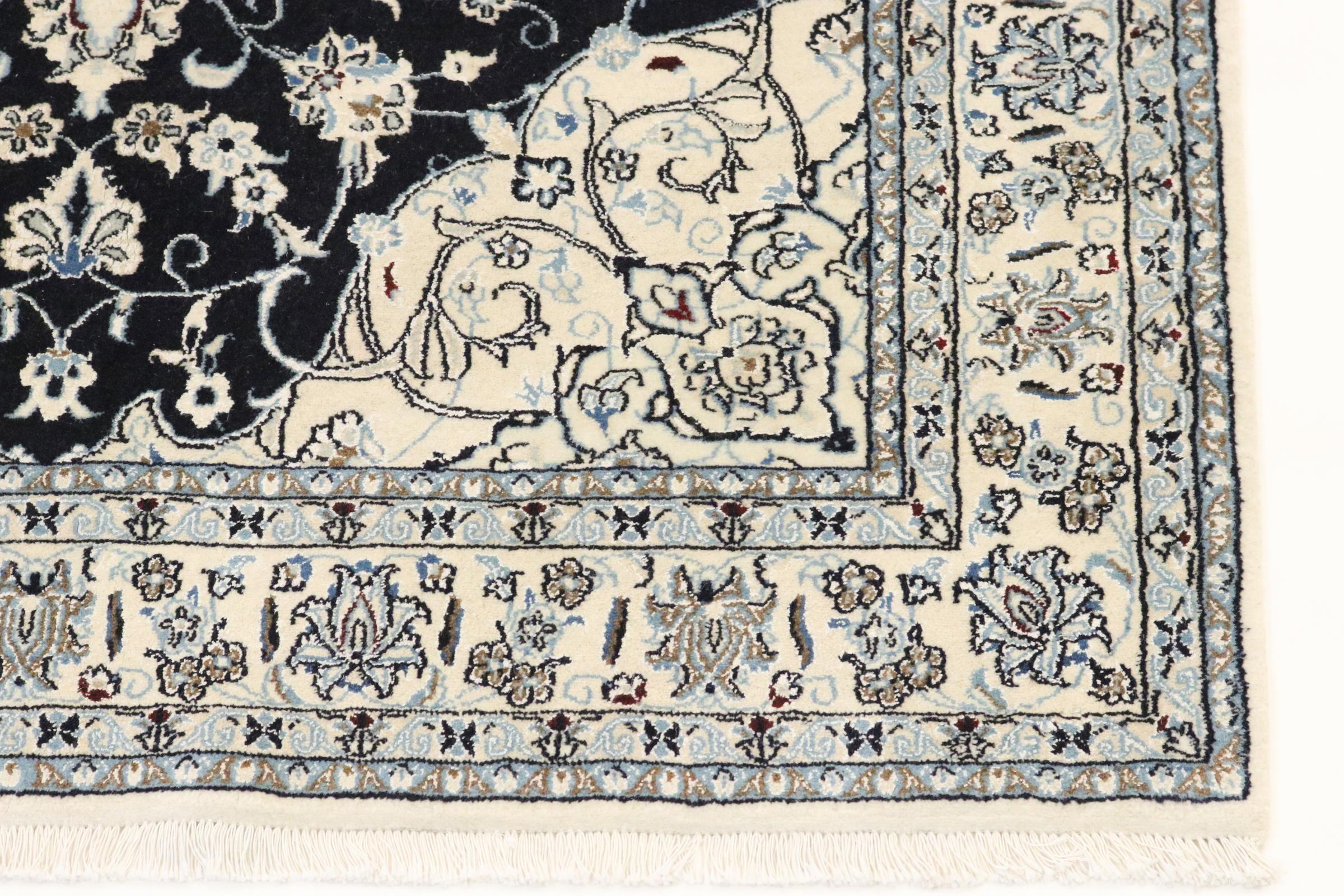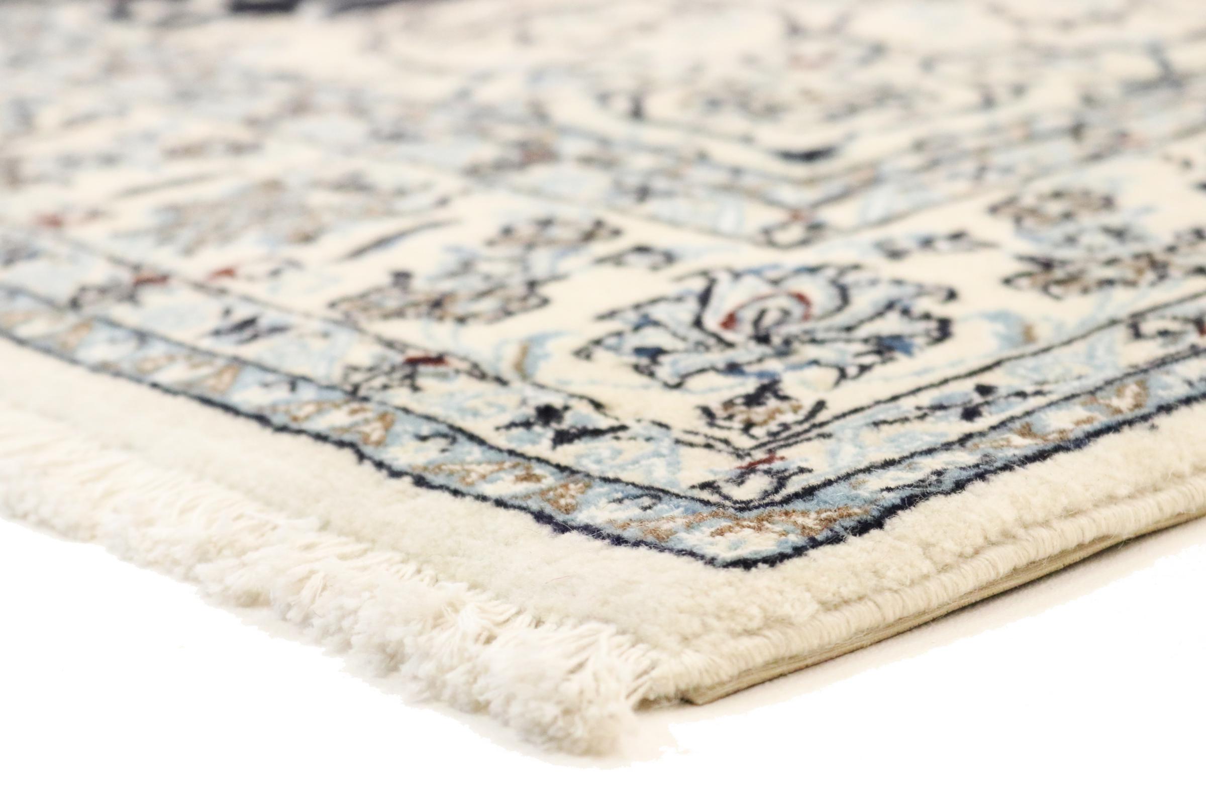 Este tapete Nain é classificado como 12La. Apresenta um aspecto elegante e requintado com a sua coloração típica Naín. Este tapete persa foi feito à mão na cidade de Nain, localizada no extremo oeste do deserto Dasht-e-Kavir, com lã de alta qualidade e seda natural. Com tamanho 12La, não é tão detalhado com ornamentação quanto 9La ou 6La Nain.