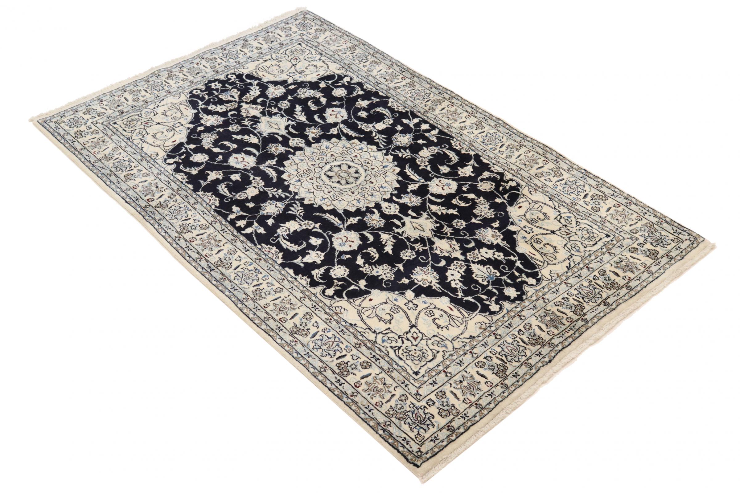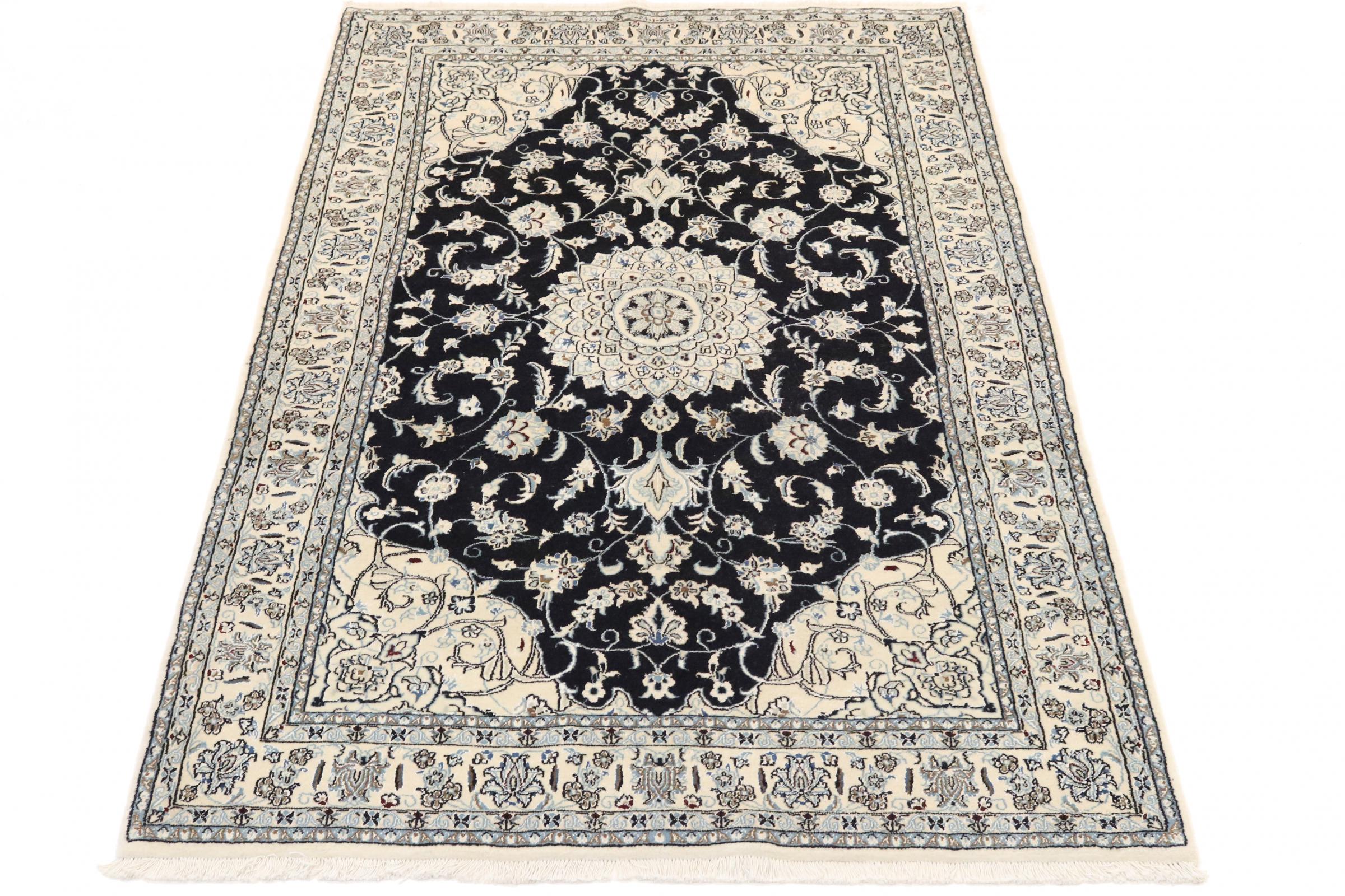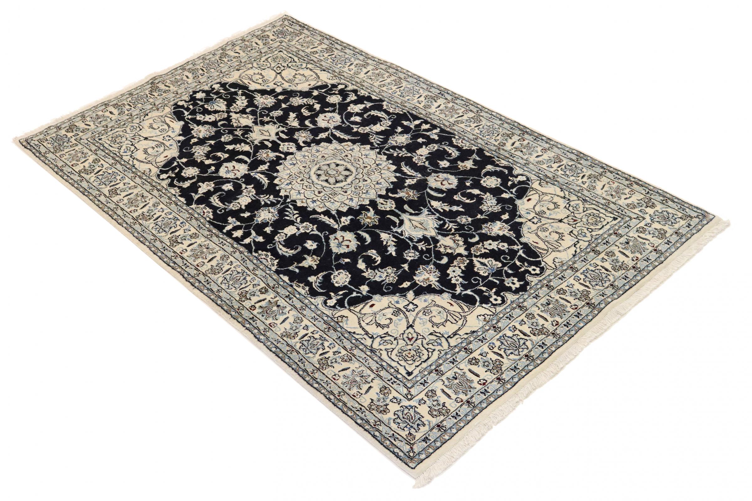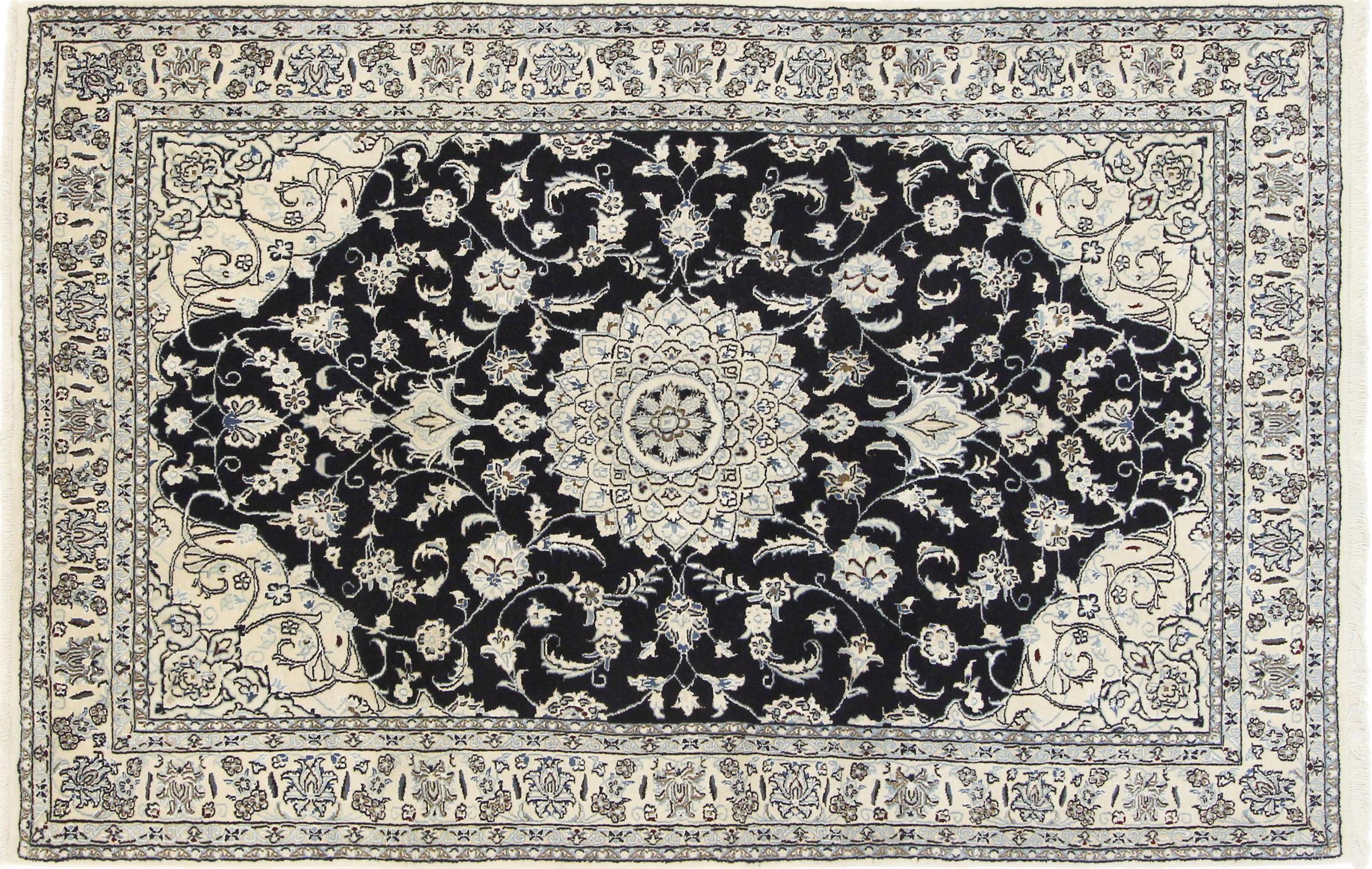 Este tapete Nain é classificado como 12La. Apresenta um aspecto elegante e requintado com a sua coloração típica Naín. Este tapete persa foi feito à mão na cidade de Nain, localizada no extremo oeste do deserto Dasht-e-Kavir, com lã de alta qualidade e seda natural. Com tamanho 12La, não é tão detalhado com ornamentação quanto 9La ou 6La Nain.