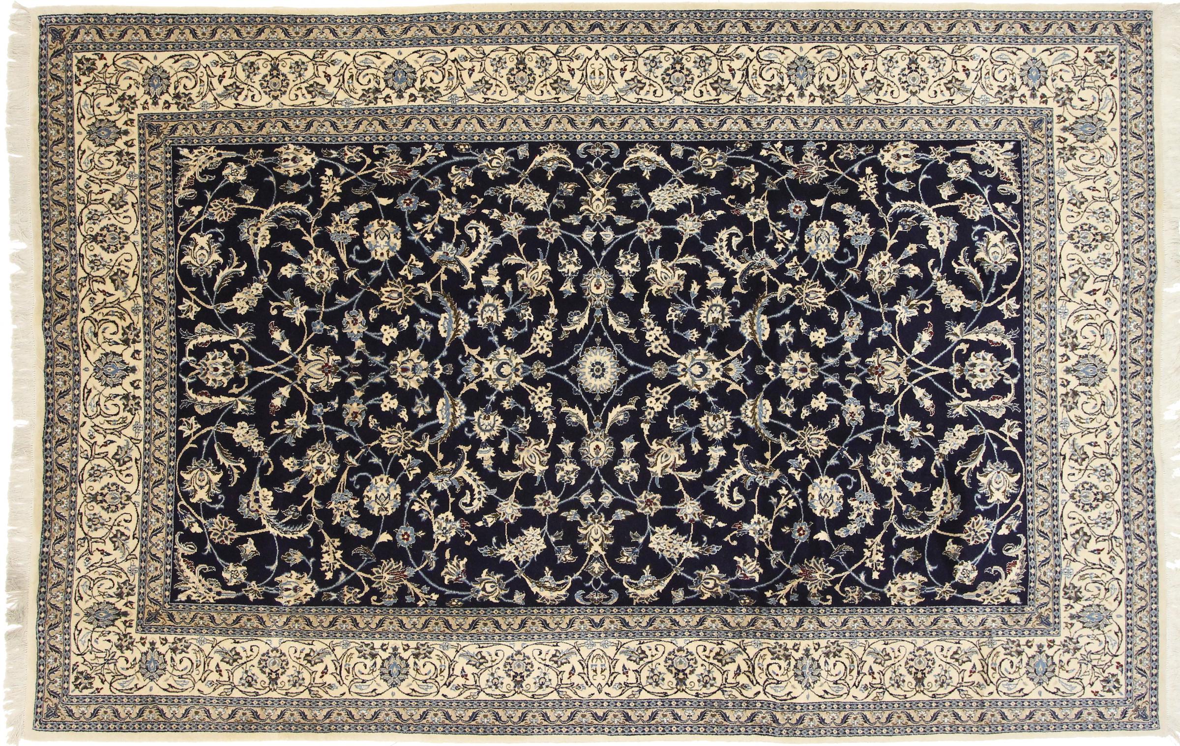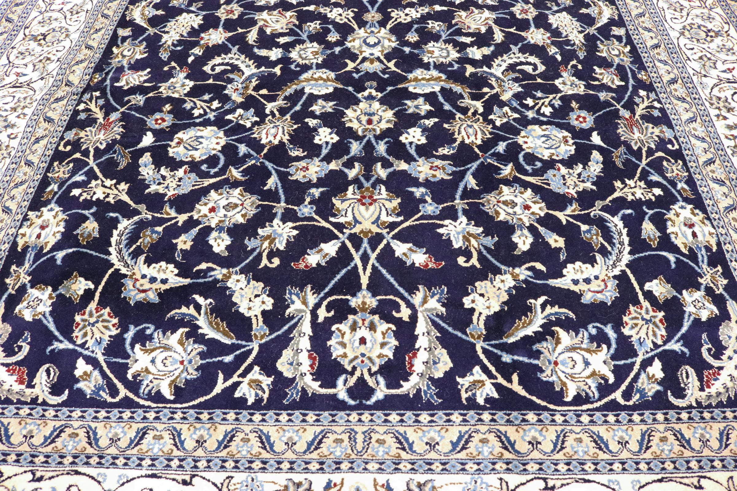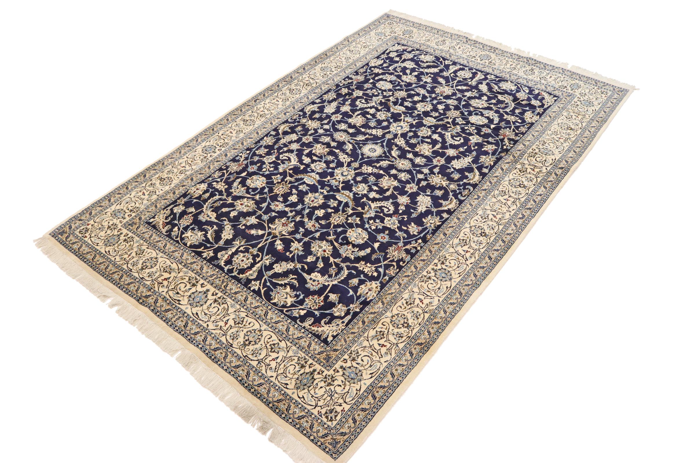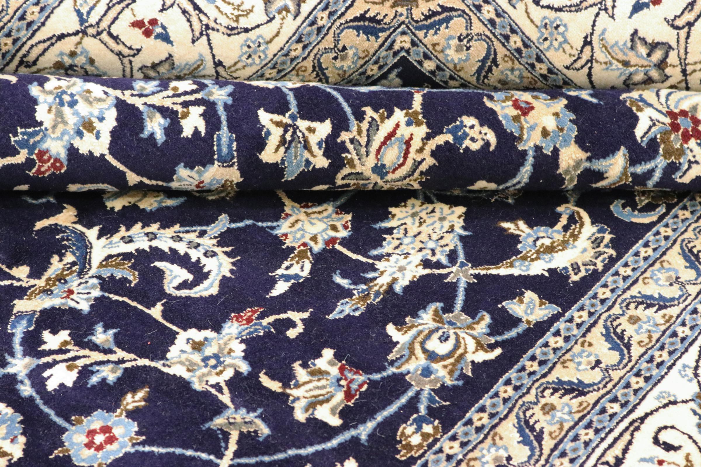 Este tapete Nain é classificado como 9La. A excelente qualidade e o belo desenho oriental com os seus padrões curvilíneos farão as delícias de qualquer comprador. Este tapete persa foi feito à mão na cidade de Nain, que fica na extremidade ocidental do deserto de Dasht-e-Kavir, a partir de lã de alta qualidade e seda natural. 9La Nain são claramente mais finos do que um 12La e já mostram belos detalhes.