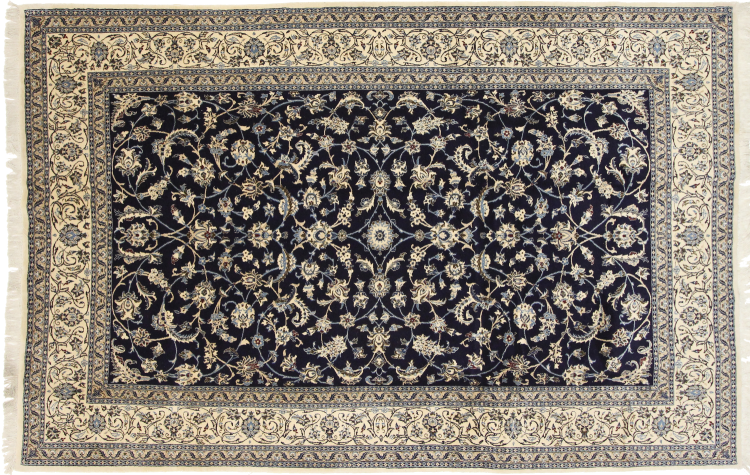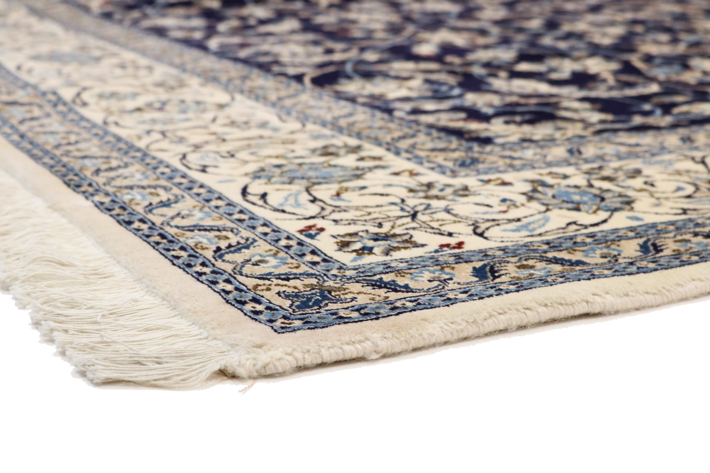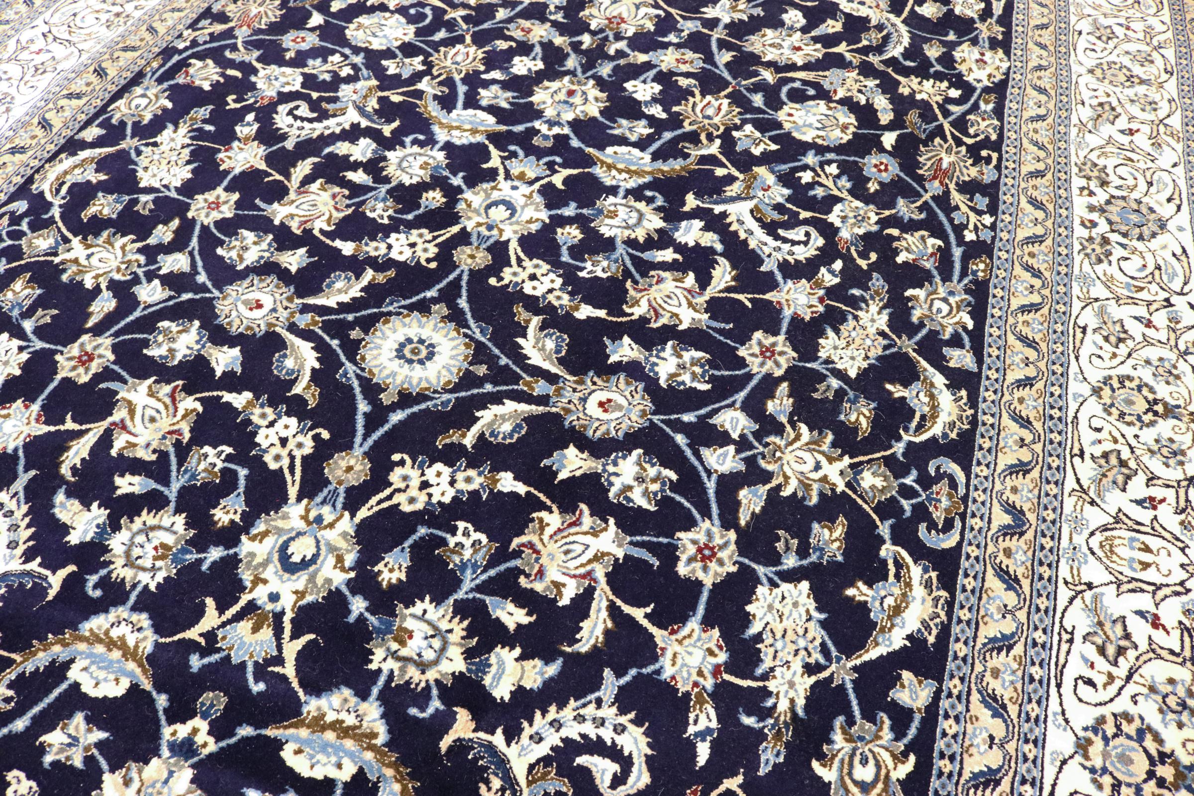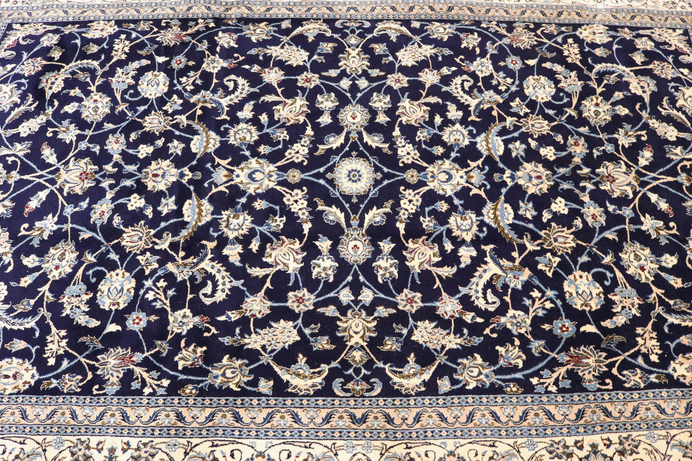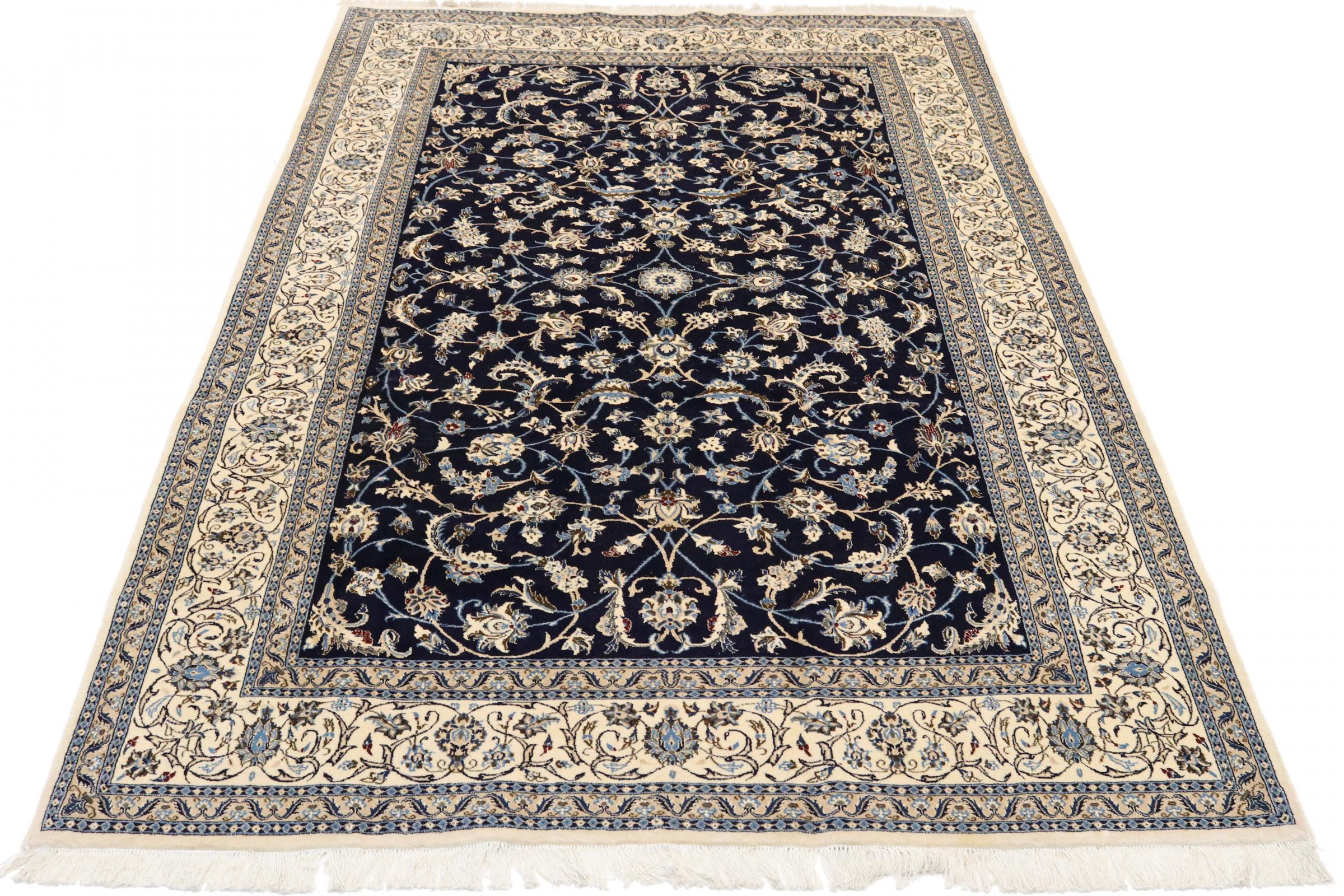 Este tapete Nain é classificado como 9La. A excelente qualidade e o belo desenho oriental com os seus padrões curvilíneos farão as delícias de qualquer comprador. Este tapete persa foi feito à mão na cidade de Nain, que fica na extremidade ocidental do deserto de Dasht-e-Kavir, a partir de lã de alta qualidade e seda natural. 9La Nain são claramente mais finos do que um 12La e já mostram belos detalhes.