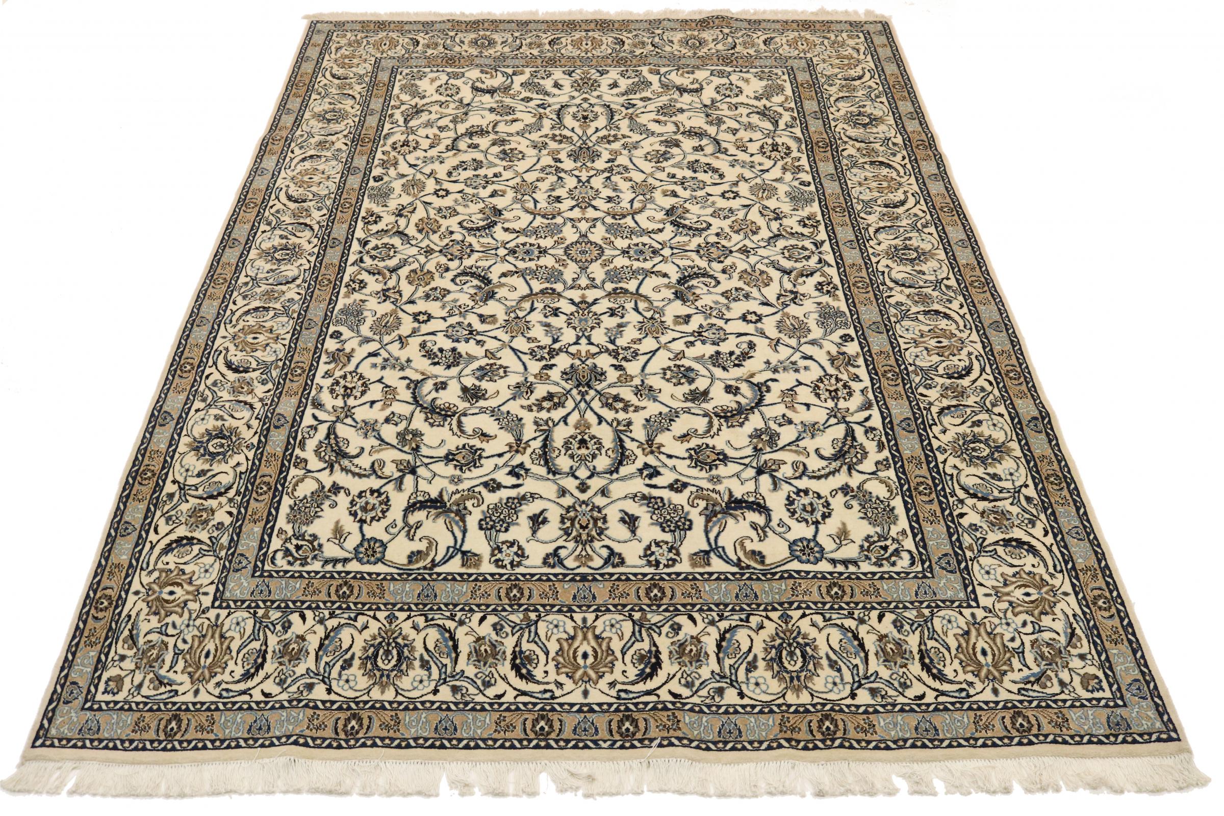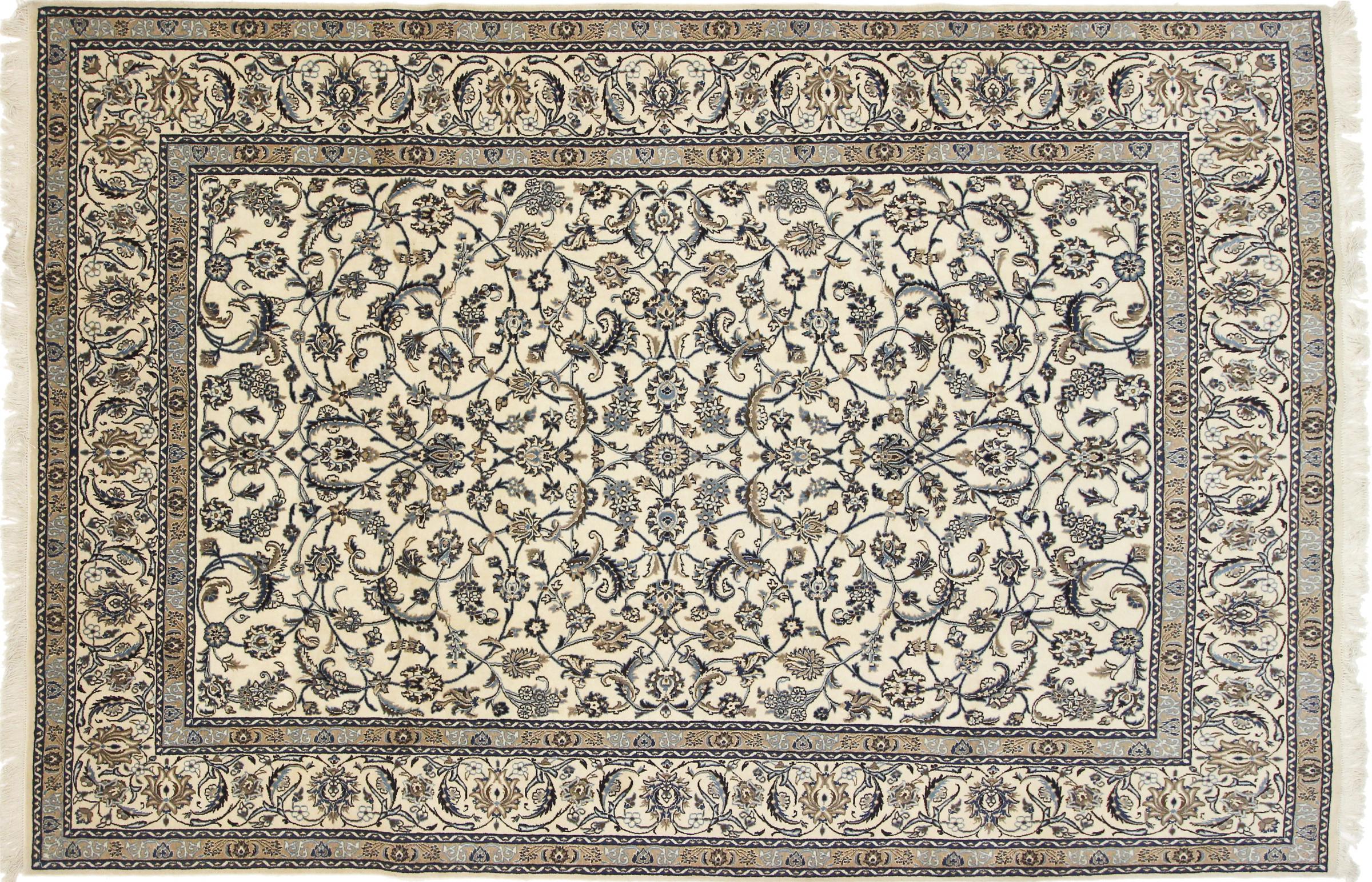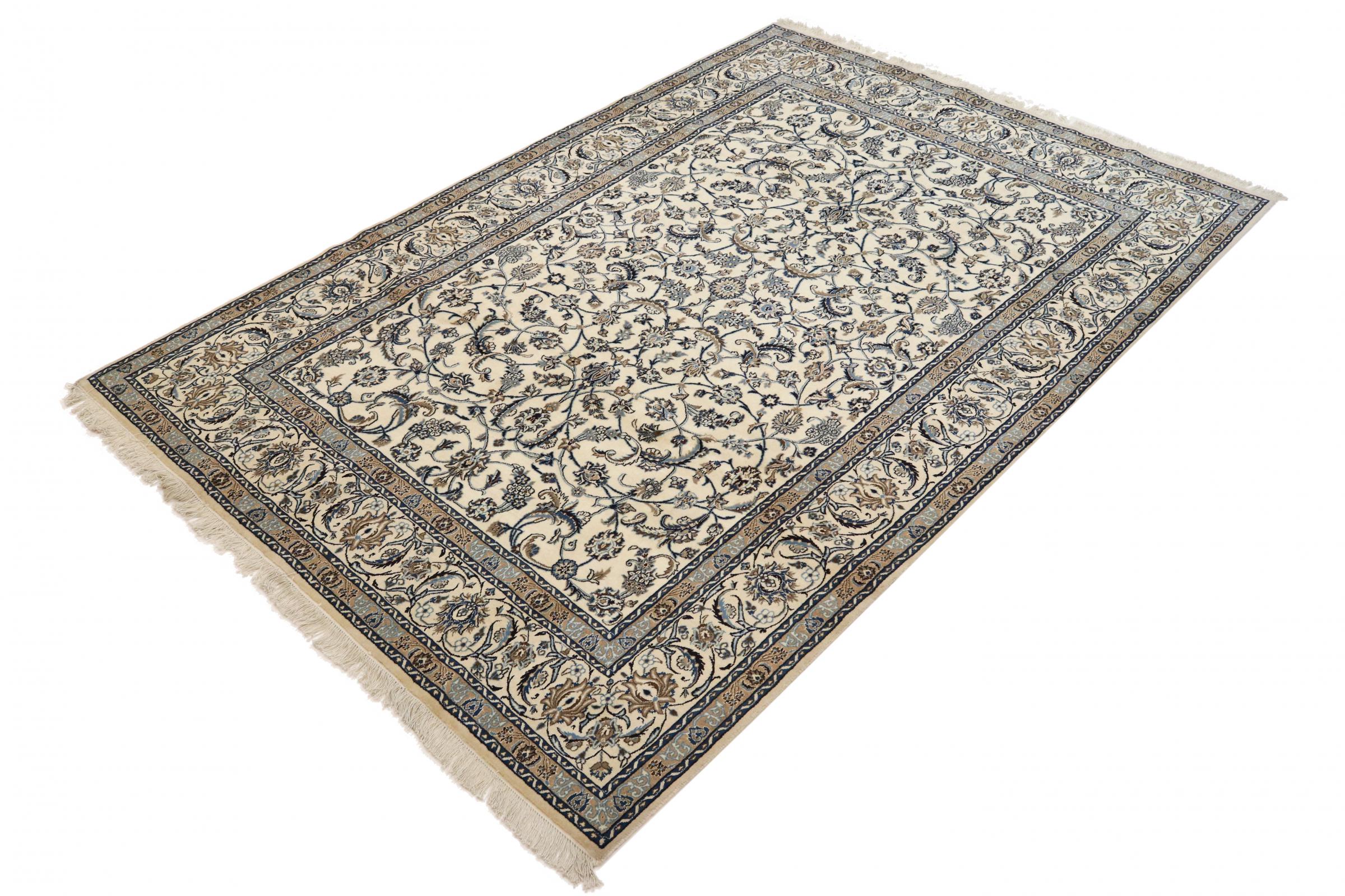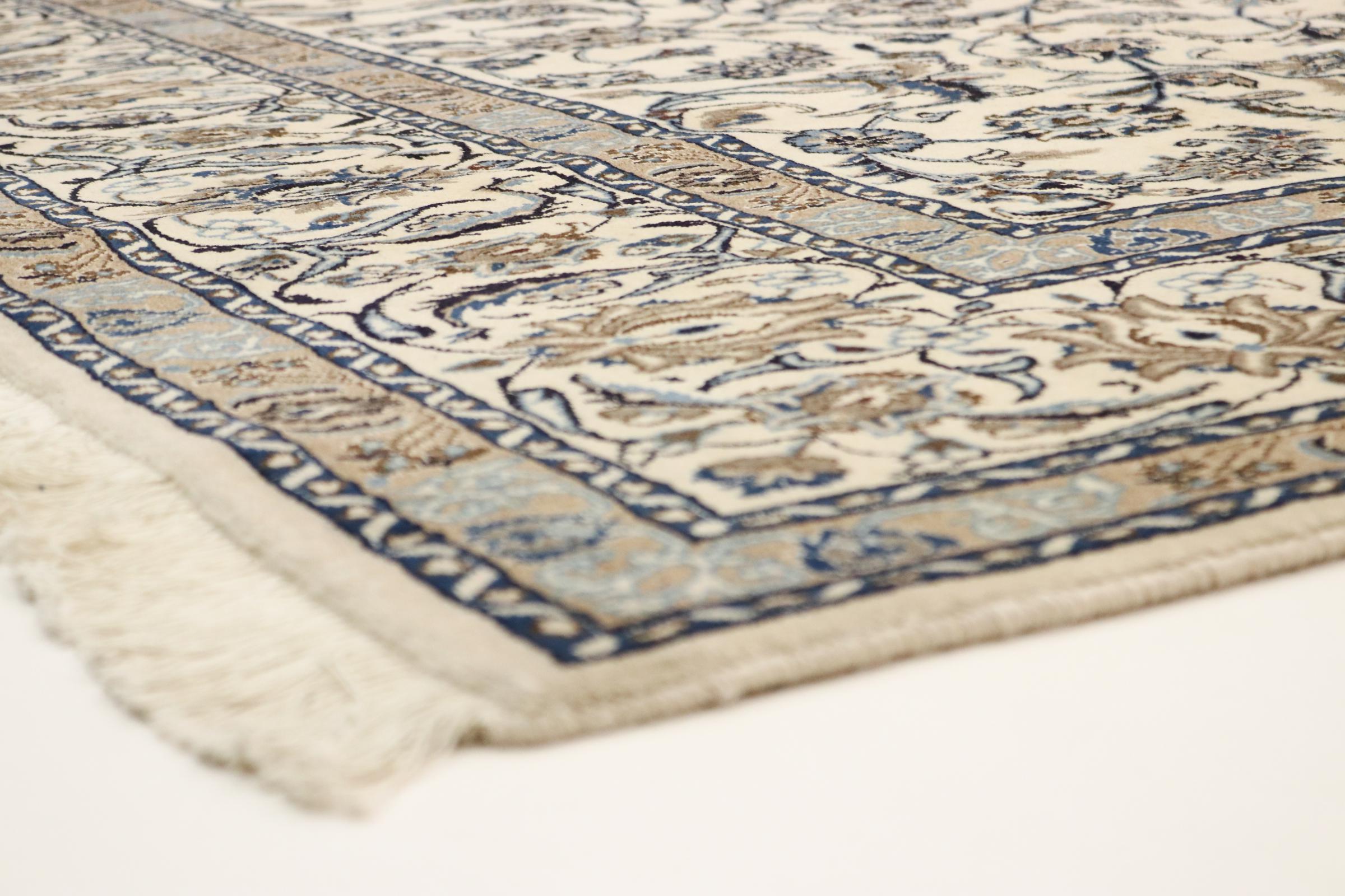 Este tapete Nain é classificado como 9La. A excelente qualidade e o belo desenho oriental com os seus padrões curvilíneos farão as delícias de qualquer comprador. Este tapete persa foi feito à mão na cidade de Nain, que fica na extremidade ocidental do deserto de Dasht-e-Kavir, a partir de lã de alta qualidade e seda natural. 9La Nain são claramente mais finos do que um 12La e já mostram belos detalhes.