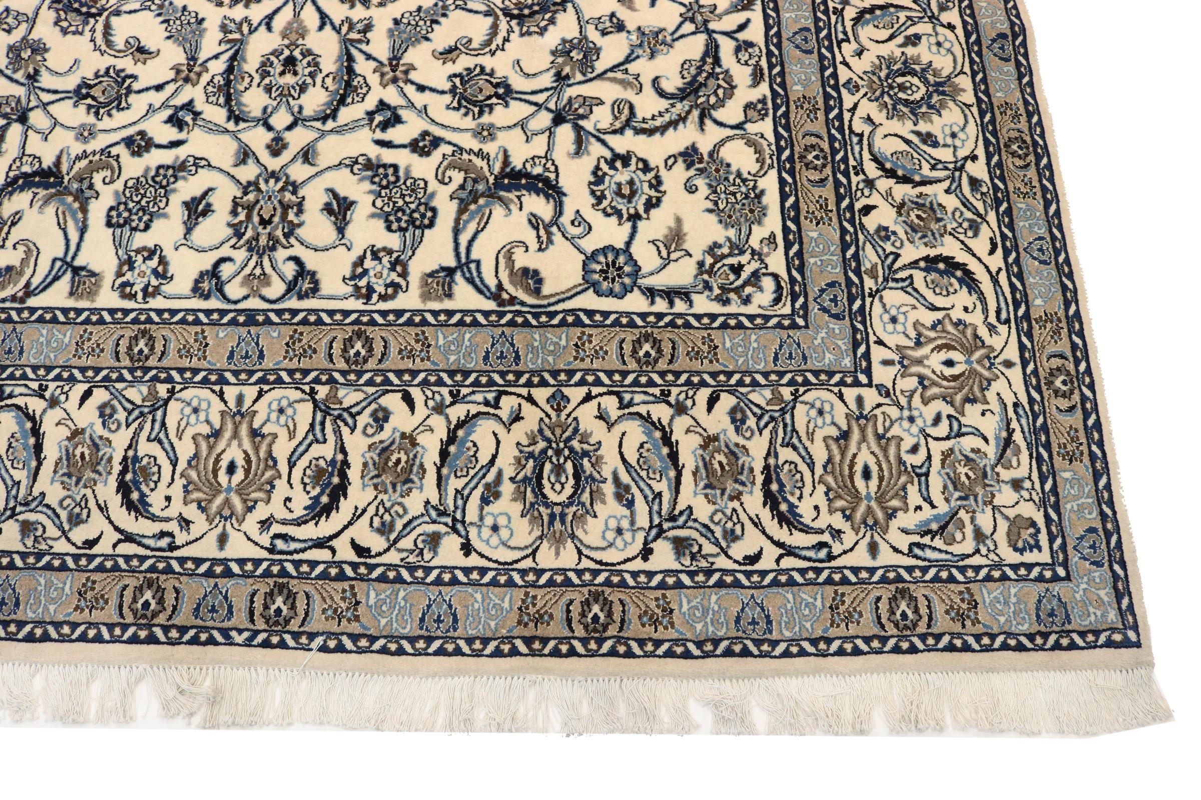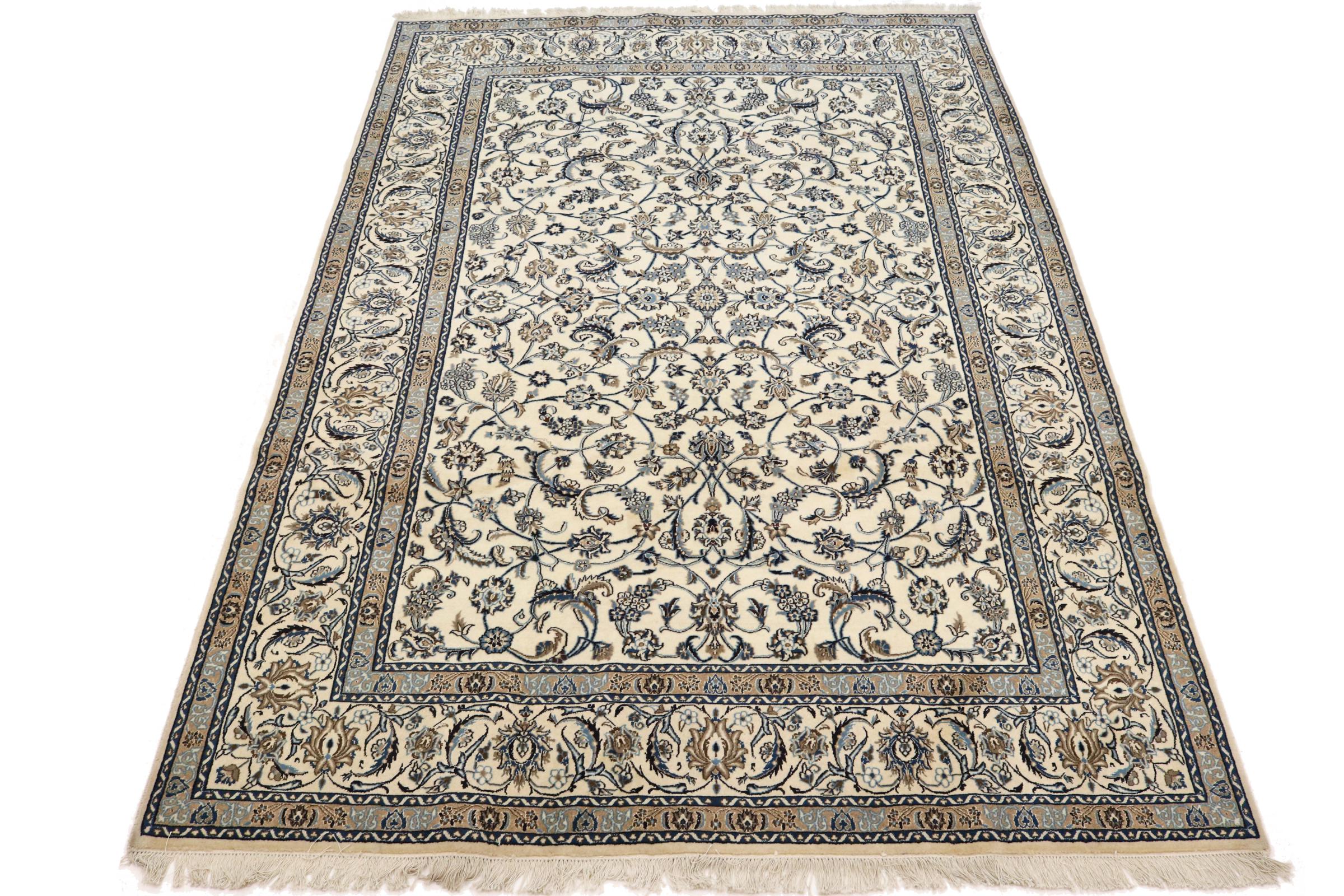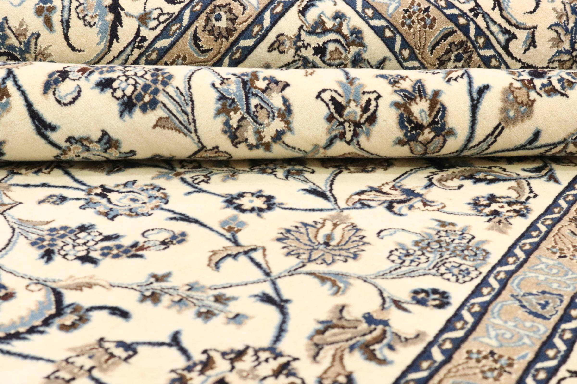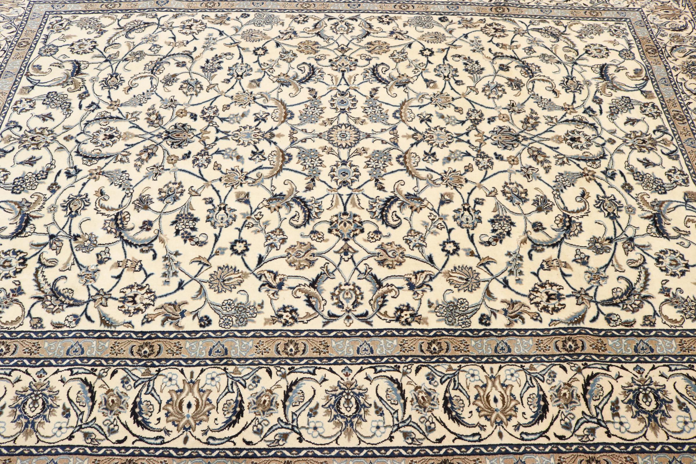 Este tapete Nain é classificado como 9La. A excelente qualidade e o belo desenho oriental com os seus padrões curvilíneos farão as delícias de qualquer comprador. Este tapete persa foi feito à mão na cidade de Nain, que fica na extremidade ocidental do deserto de Dasht-e-Kavir, a partir de lã de alta qualidade e seda natural. 9La Nain são claramente mais finos do que um 12La e já mostram belos detalhes.